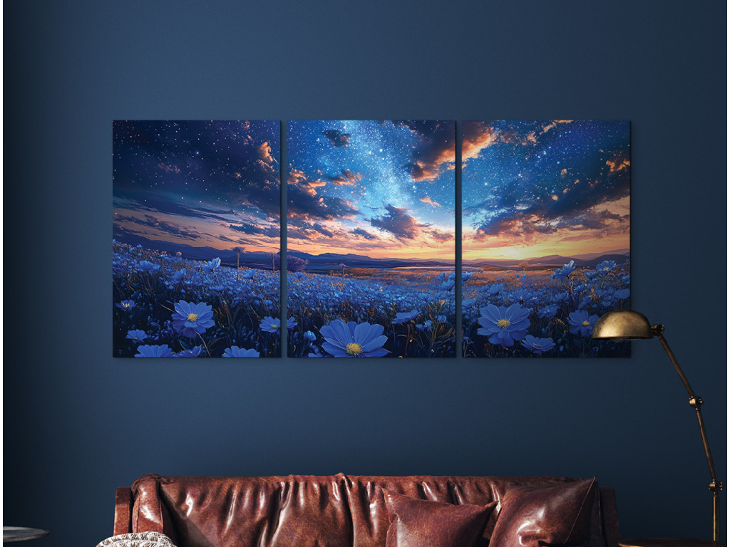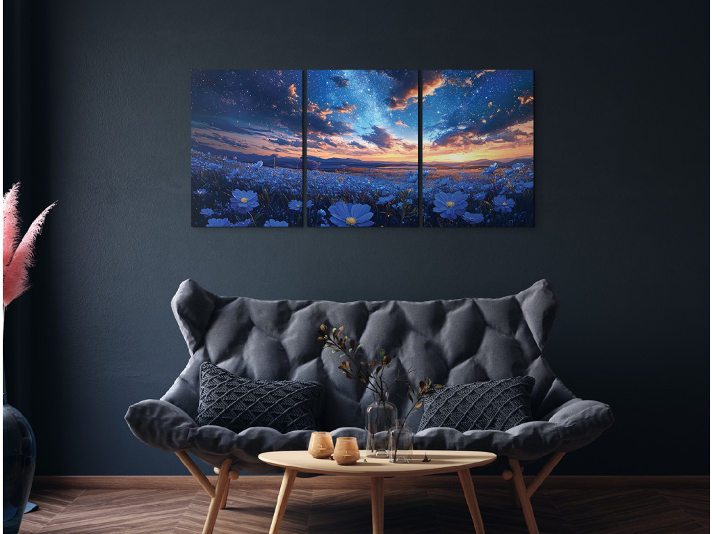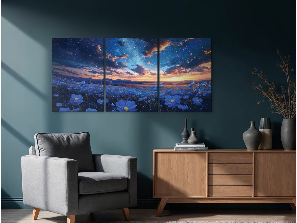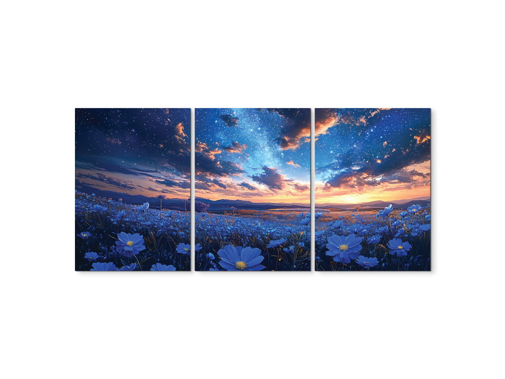 Sous le ciel étoilé est un tableau en trois parties qui associe la tranquillité du ciel nocturne à la beauté d'un champ de fleurs bleues en pleine floraison. Les trois panneaux forment une seule scène continue : un paysage nocturne avec des étoiles et la Voie lactée, qui donne une impression onirique et harmonieuse. Idéal comme décoration pour une chambre à coucher ou un salon.