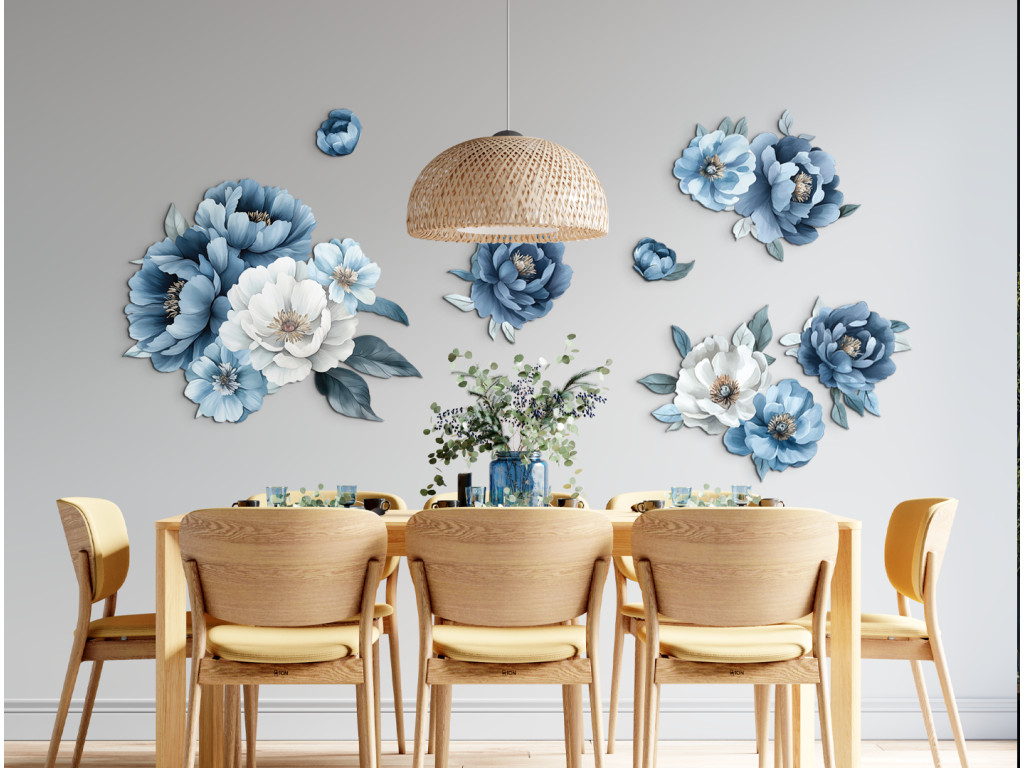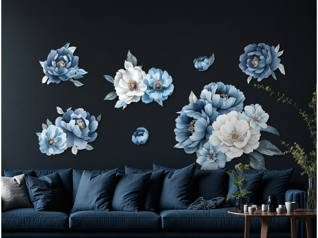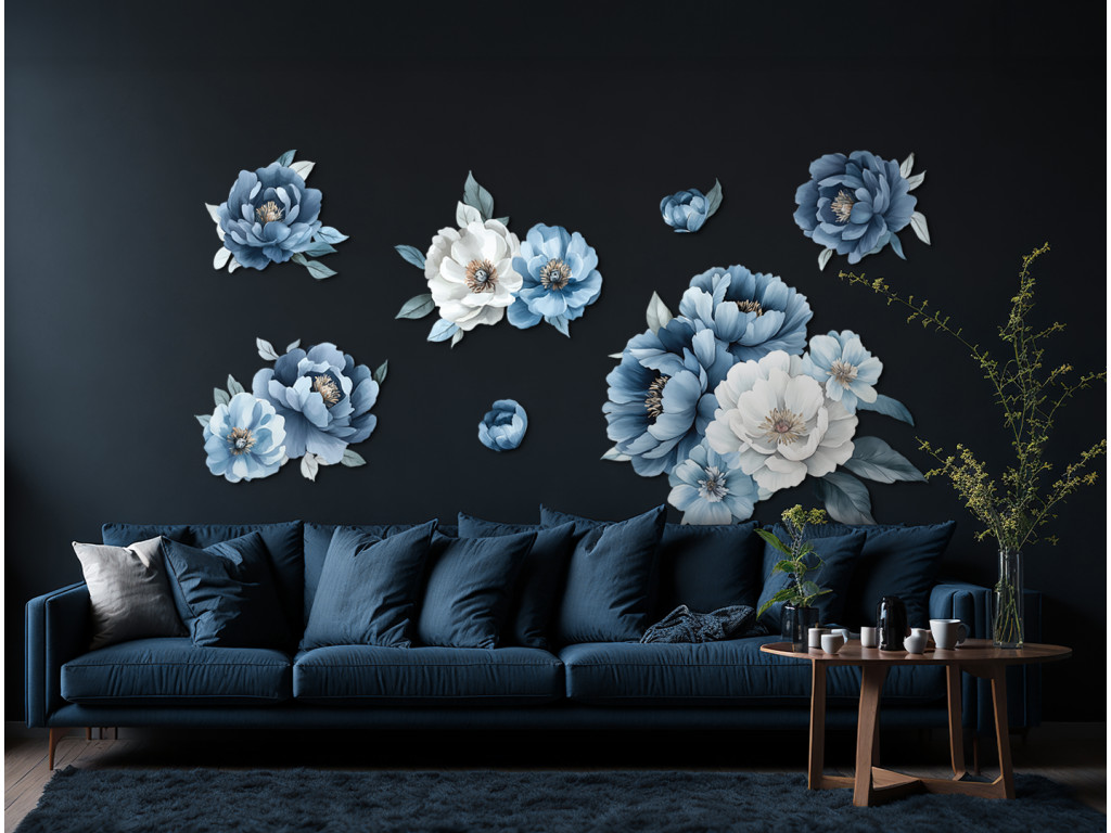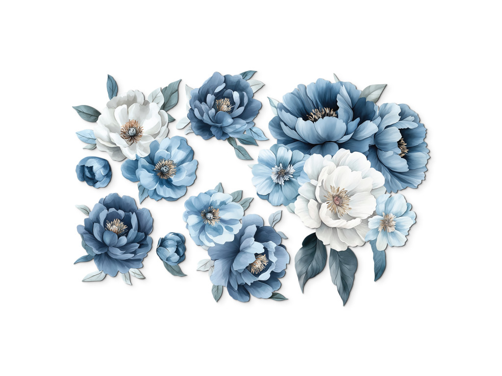 Les fleurs librement peintes dans des tons de blanc et de bleu, rappelant des pivoines ou des roses, créent une composition délicate et aérienne pleine d'élégance. Le style expressif, avec des transitions aquarellées, met en valeur les formes des fleurs et des feuilles sans détails superflus, ce qui donne à l'œuvre un aspect frais et moderne.