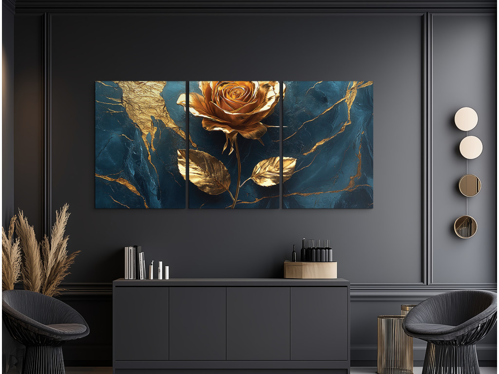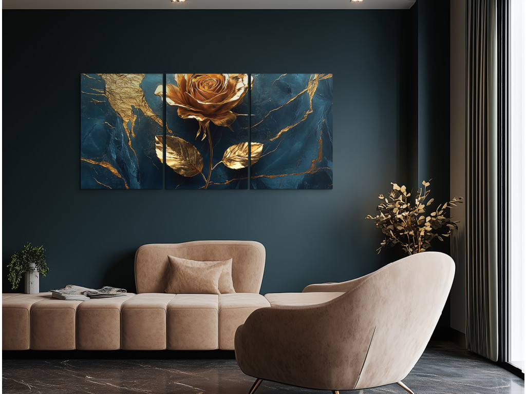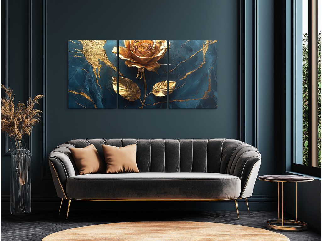 Le toucher de la rose dorée est un tableau qui allie noblesse et délicatesse dans une composition unique : une rose dorée se détache sur un fond bleu foncé parsemé de lignes dorées irrégulières rappelant du marbre craquelé. L'effet de brillance et de profondeur crée une impression visuelle luxueuse qui enchante au premier regard. Un complément idéal pour un intérieur élégant, que ce soit dans une chambre, un salon ou un espace représentatif.