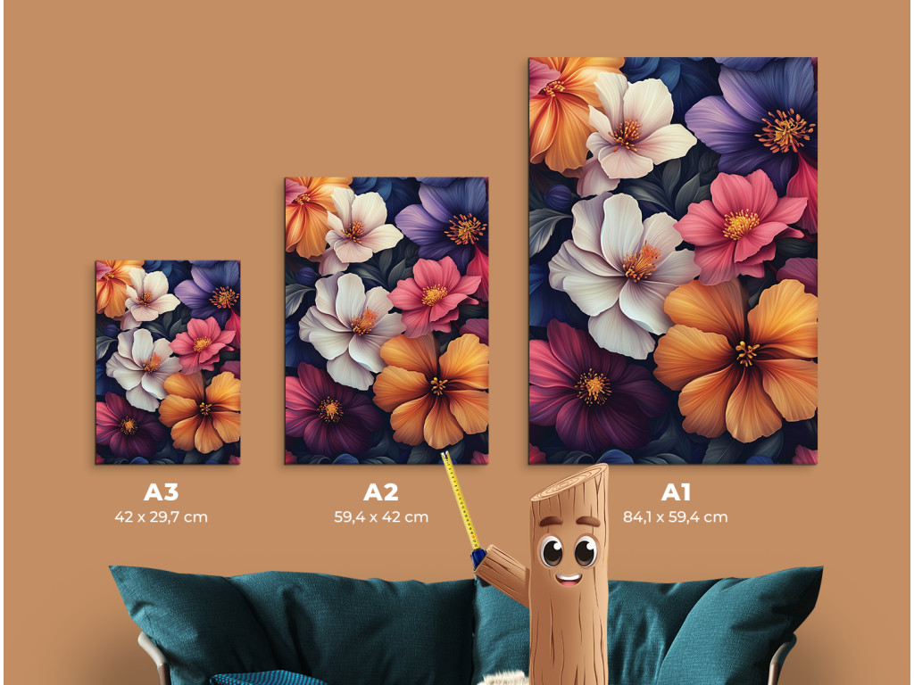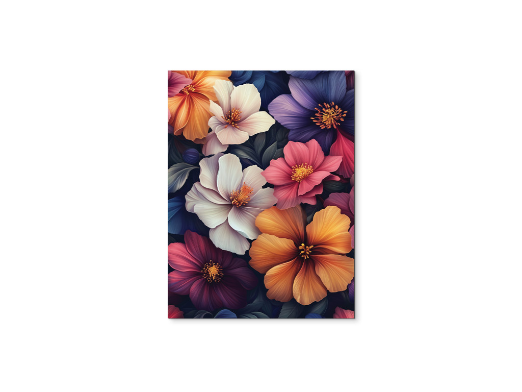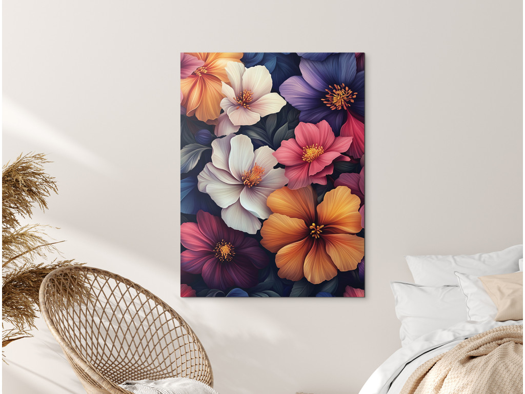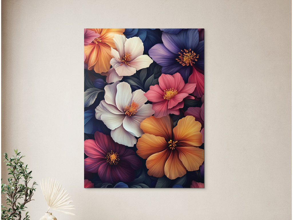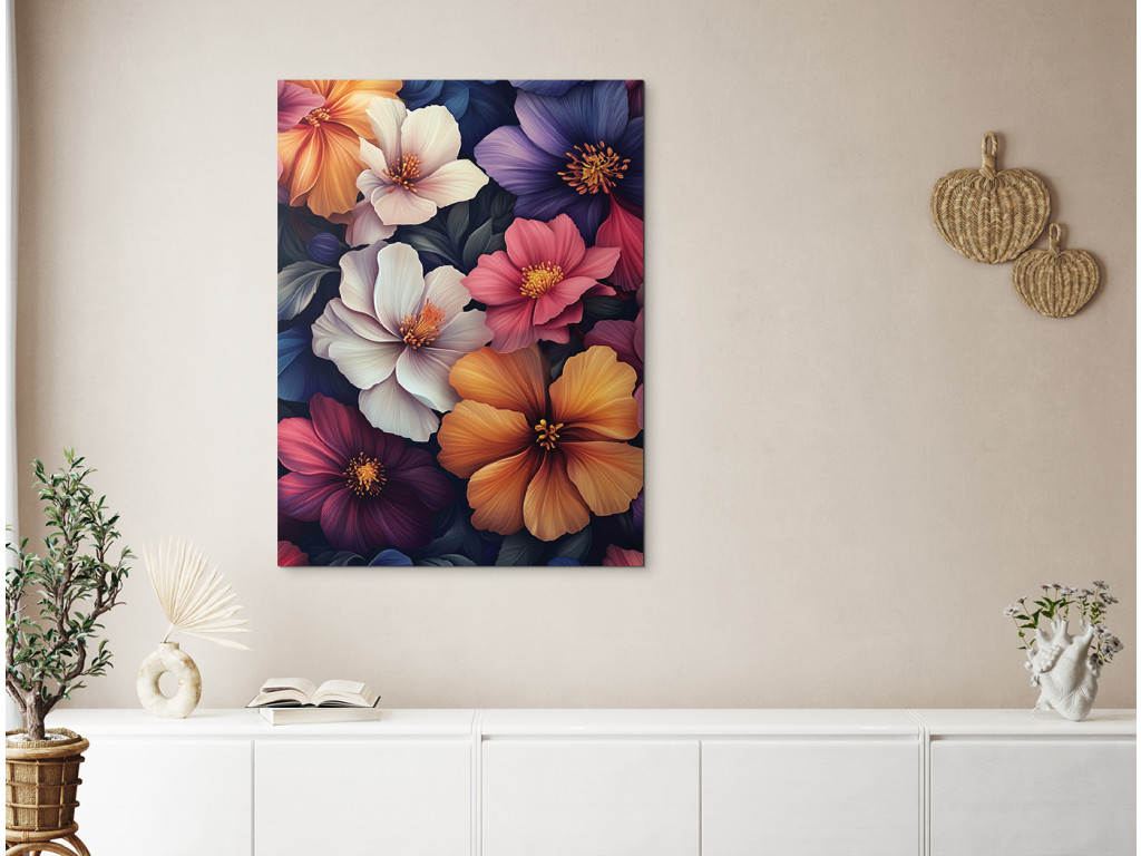 Moment floral est un tableau représentant un détail de bouquet peint dans des couleurs riches et vives : des nuances de violet, de rose, de blanc et d'orange pâle. Le fond sombre fait ressortir les fleurs éclatantes, comme capturées dans un instant plein de vie et de couleurs. Idéal pour un espace qui a besoin d'être ravivé, comme un salon, un hall d'entrée ou un bureau créatif.