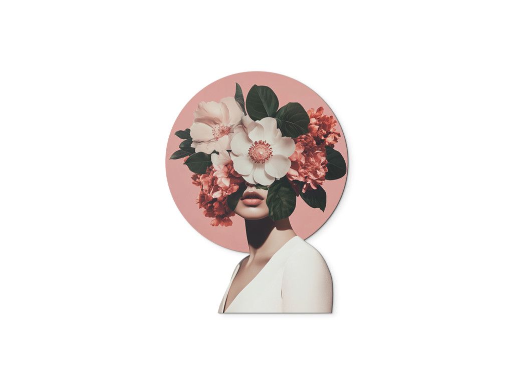 Le personnage féminin, dont le visage est caché derrière un bouquet de fleurs luxuriant, incarne l'union entre l'homme et la nature. Le motif circulaire rose derrière sa tête rappelle une auréole, symbole d'inspiration, de croissance et de mystère. Contrastant avec les vêtements délicats du personnage, l'image dégage une impression de calme, d'éthéréité et de séduction. Botanical Muse est un hommage au charme discret et à la puissance de la beauté naturelle.