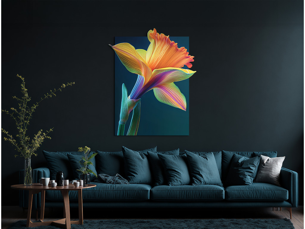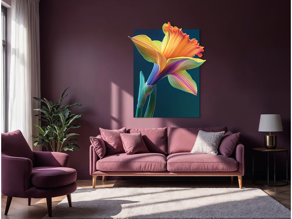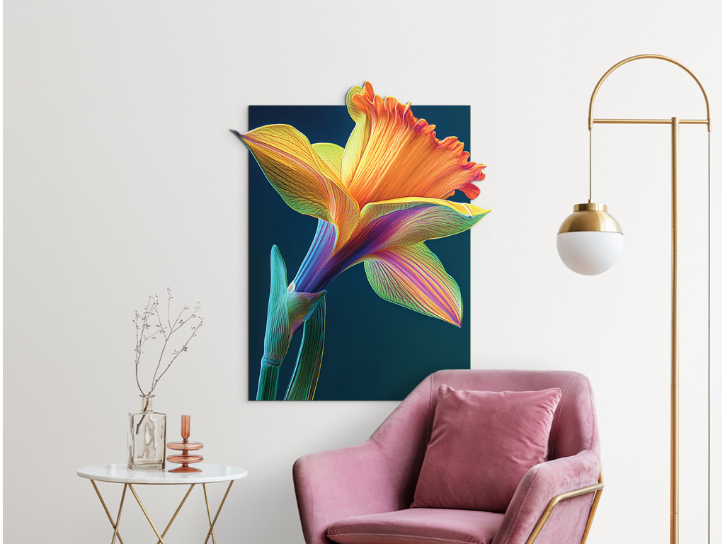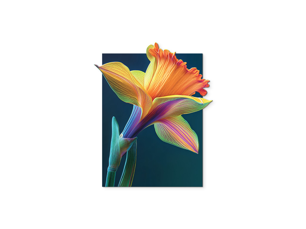 La représentation élégante d'un narcisse dans des tons orange-violet inhabituels sur un fond vert foncé offre une vision à la fois fraîche et sophistiquée de ce symbole du printemps. Le contraste entre les couleurs vives de la fleur et le fond vert profond met en valeur les lignes délicates et la structure des pétales. Le tableau dégage une noblesse et une singularité tranquilles, comme un hommage à la beauté dans la simplicité.