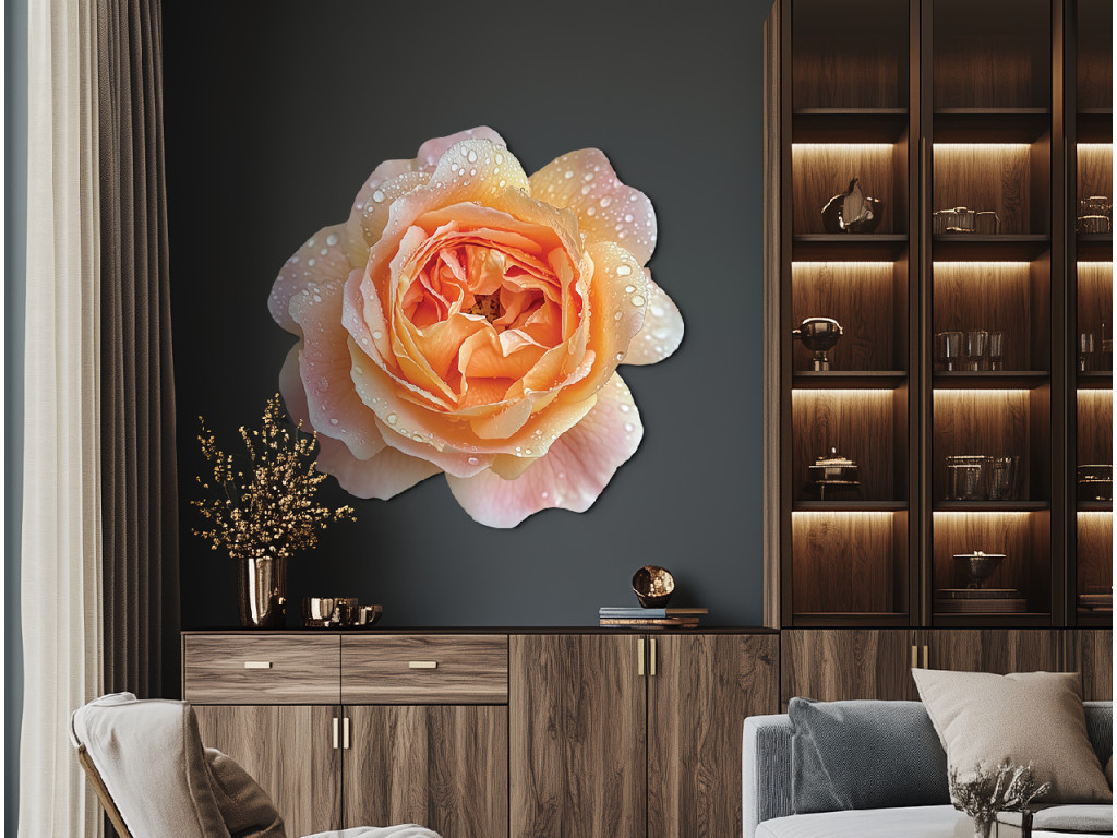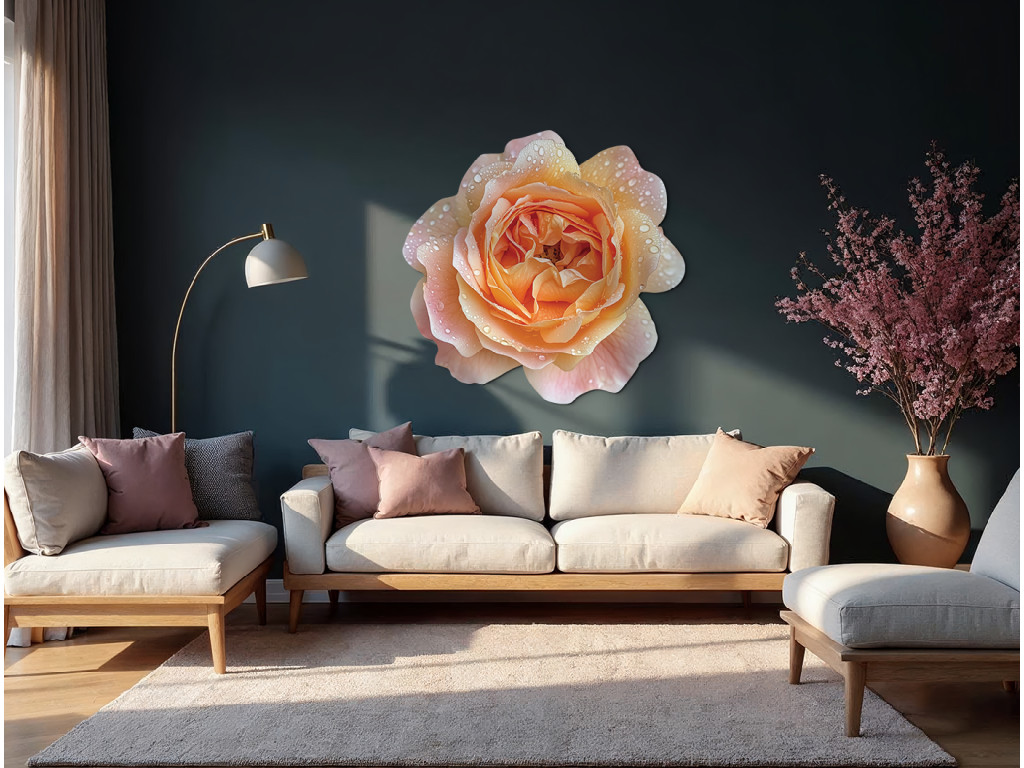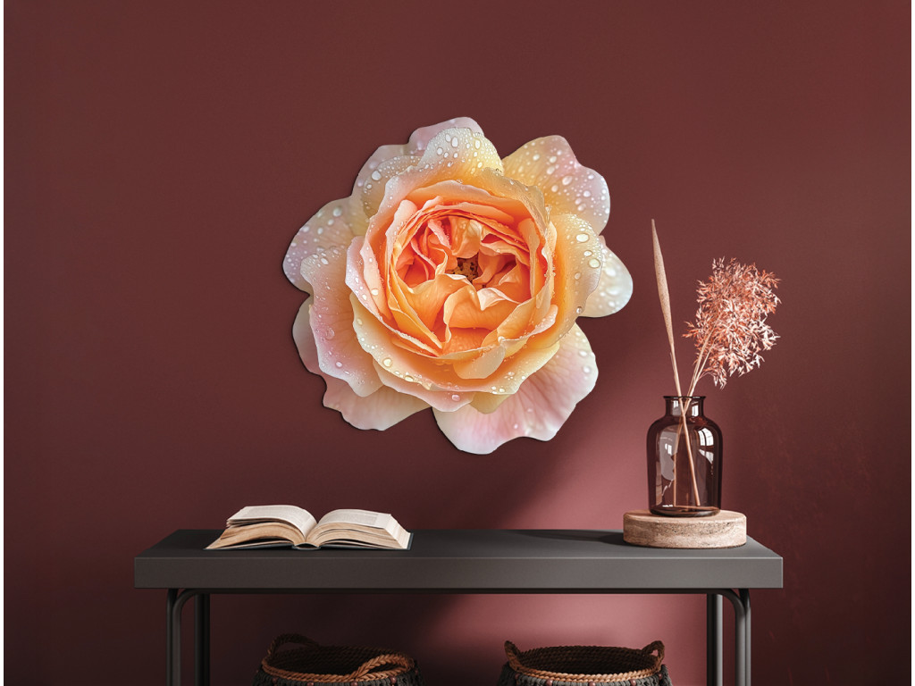 Cette décoration murale avec une rose orange prononcée apporte chaleur, passion et élégance à la pièce. Le symbolisme de la rose dans une teinte ardente rayonne à la fois d'énergie et de douceur, ce qui en fait le centre visuel impressionnant de chaque pièce. Un complément idéal pour les amateurs de fleurs au caractère affirmé.