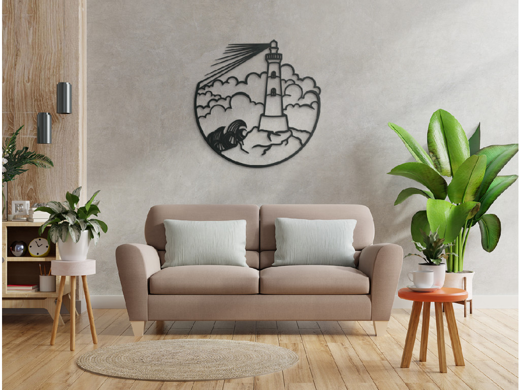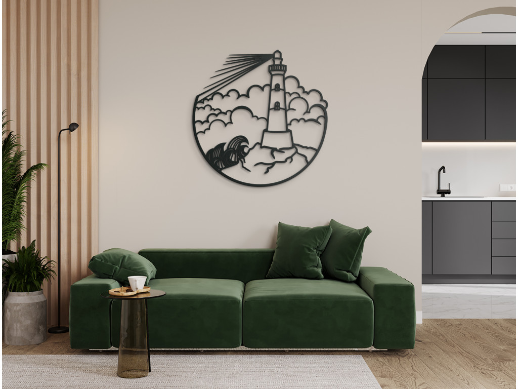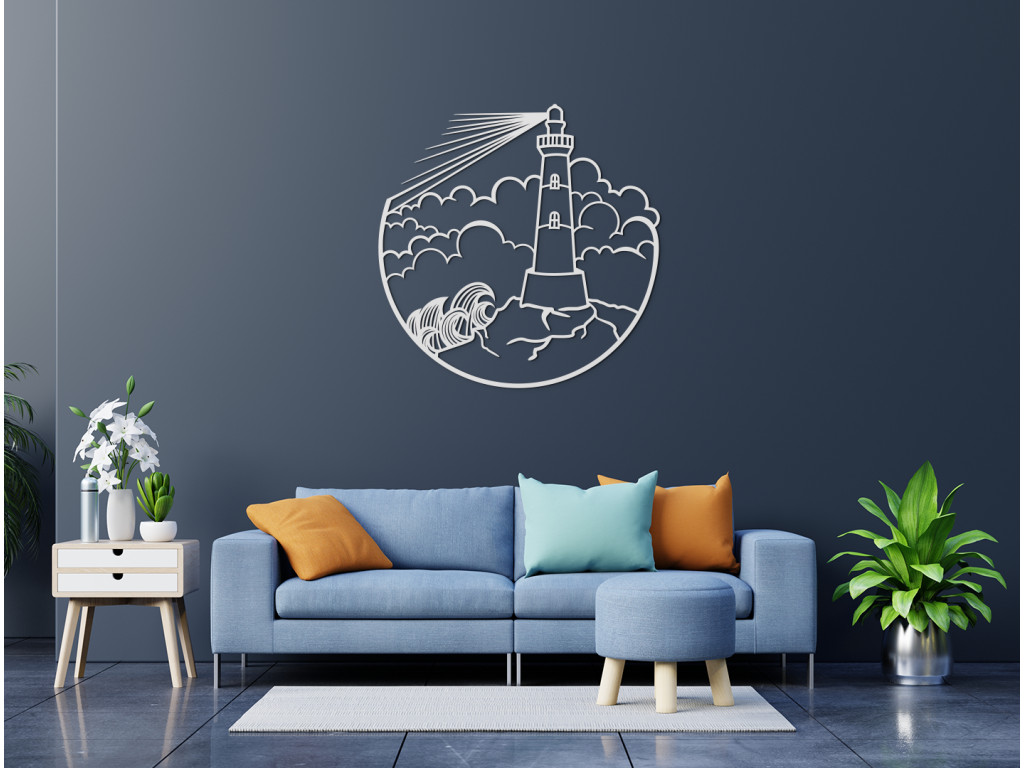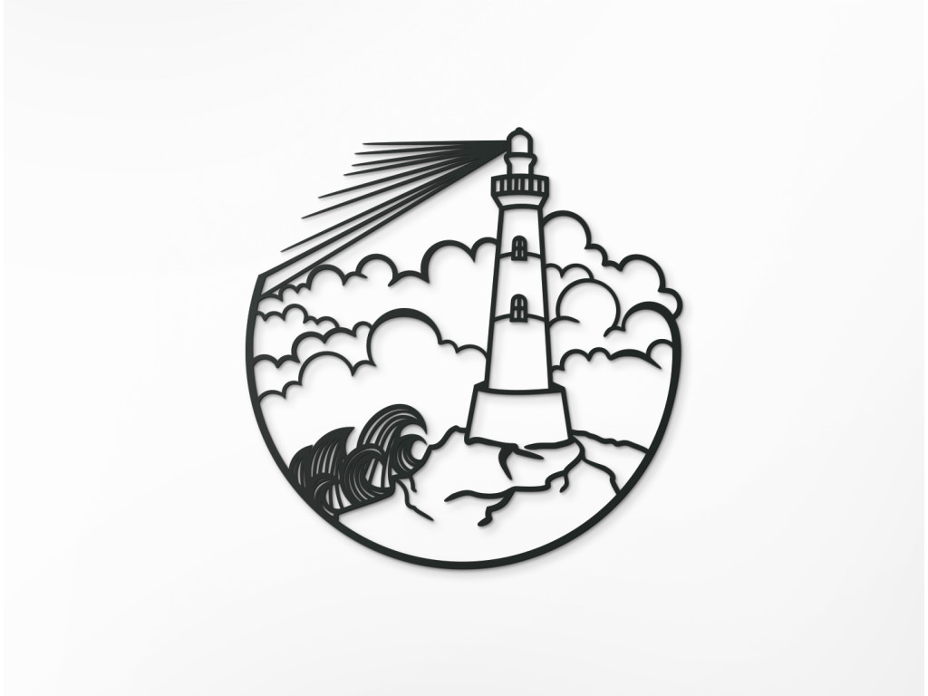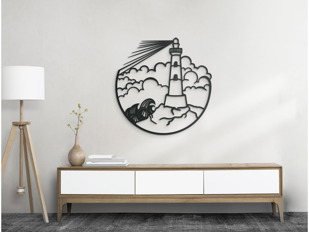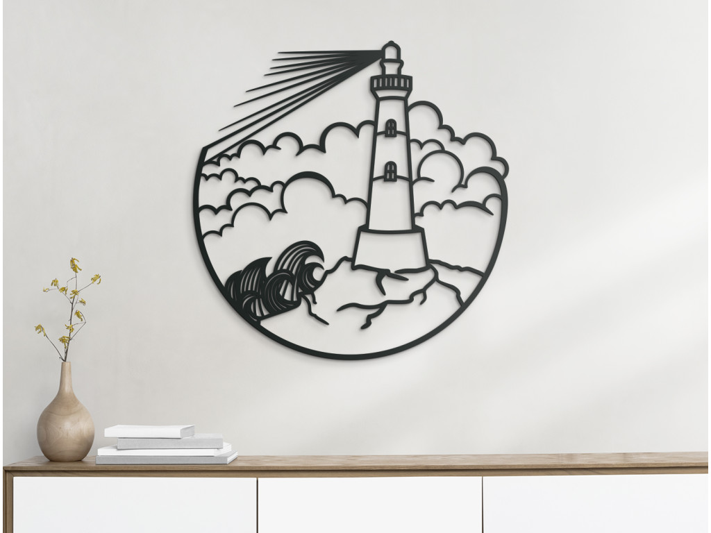 Táto minimalistická nálepka na stenu vykresľuje maják na mori, oblaky a rozbúrené more. Obraz je vhodný do kancelárie, spálne, obývačky, či detskej izby.