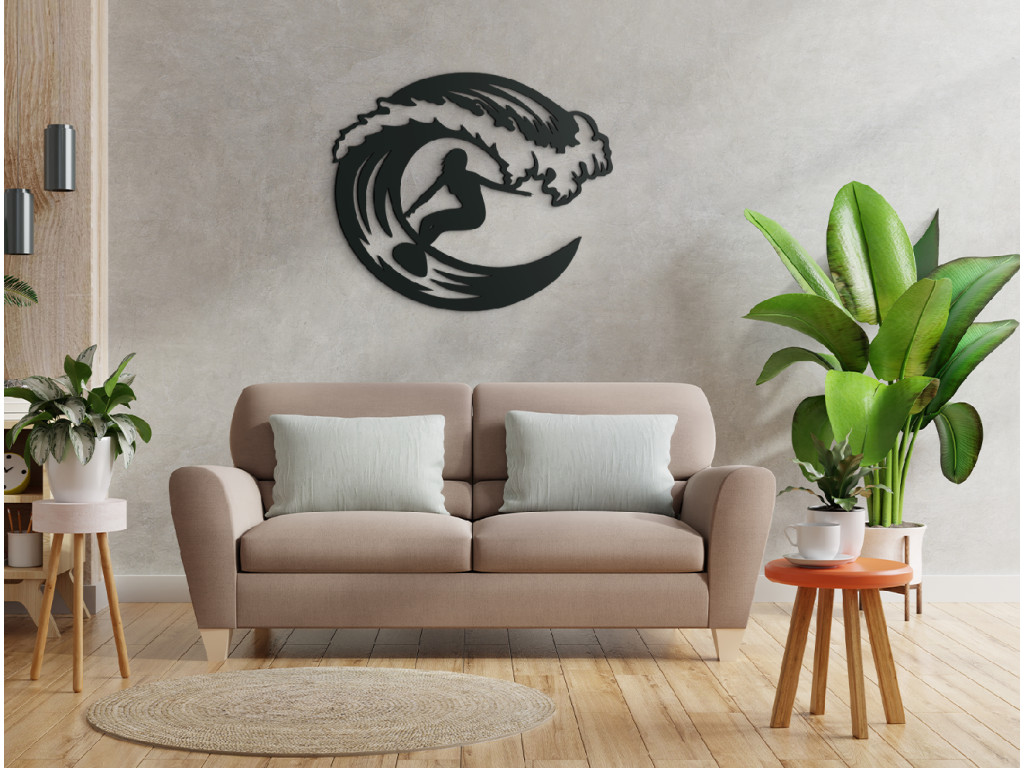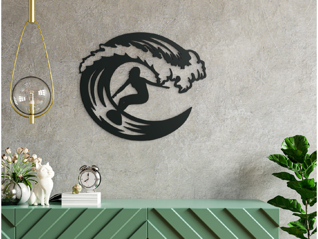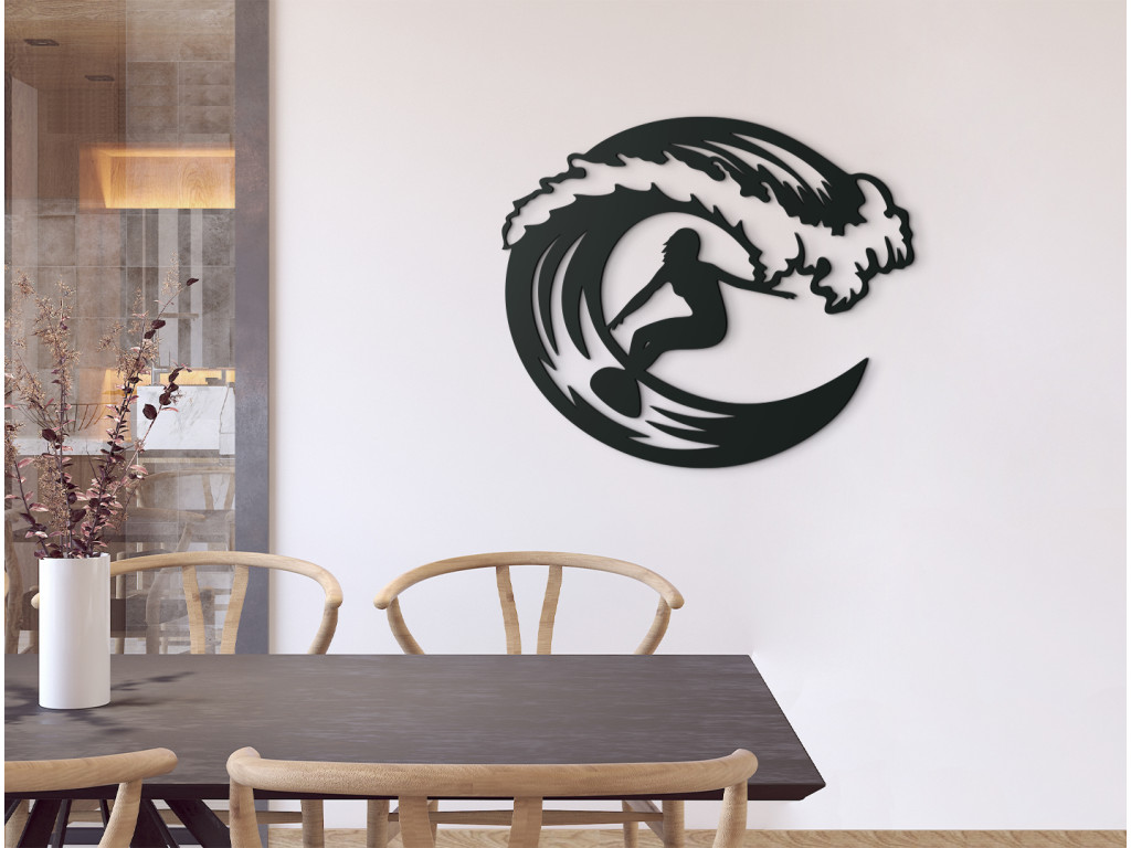 Pre všetkých nadšencov surfingu máme nálepku na stenu, ktorá v interiéri zažiari. Drevená nálepka vyobrazuje veľkú vlnu, popod ktorú surfuje dievčina. Jednoduchý a zároveň originálny obraz môžete zavesiť do obývačky, spálne, chodby aj kancelárie.