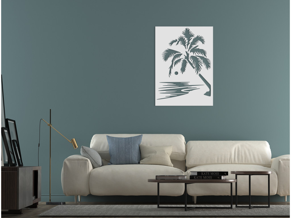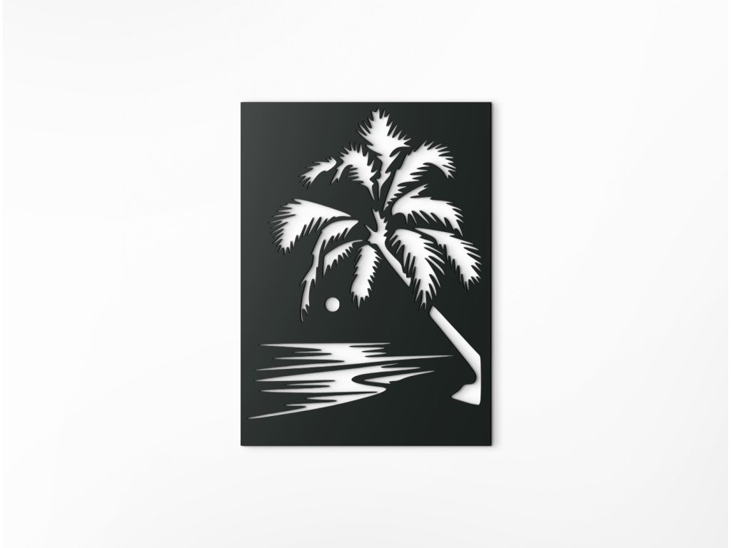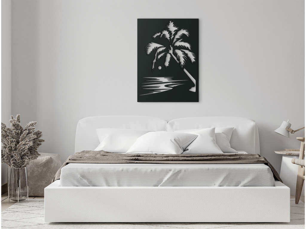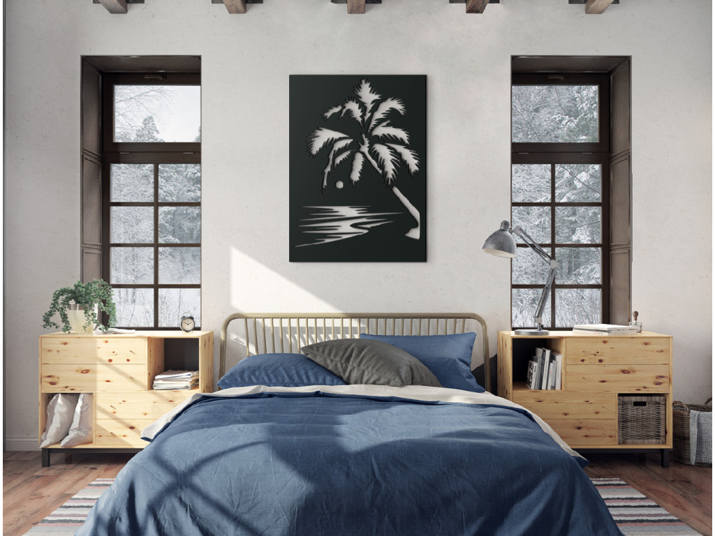 Nechajte vplávať kúsok exotiky do vášho domova. Drevený obraz vyobrazuje večerný príliv pri západe slnka. Romantike na obraze pridáva veľká palma. Jednoduchý a zároveň originálny obraz môžete zavesiť do obývačky, spálne, chodby aj kancelárie.
