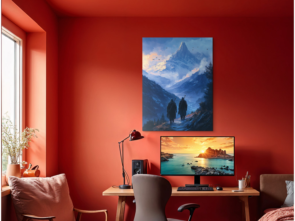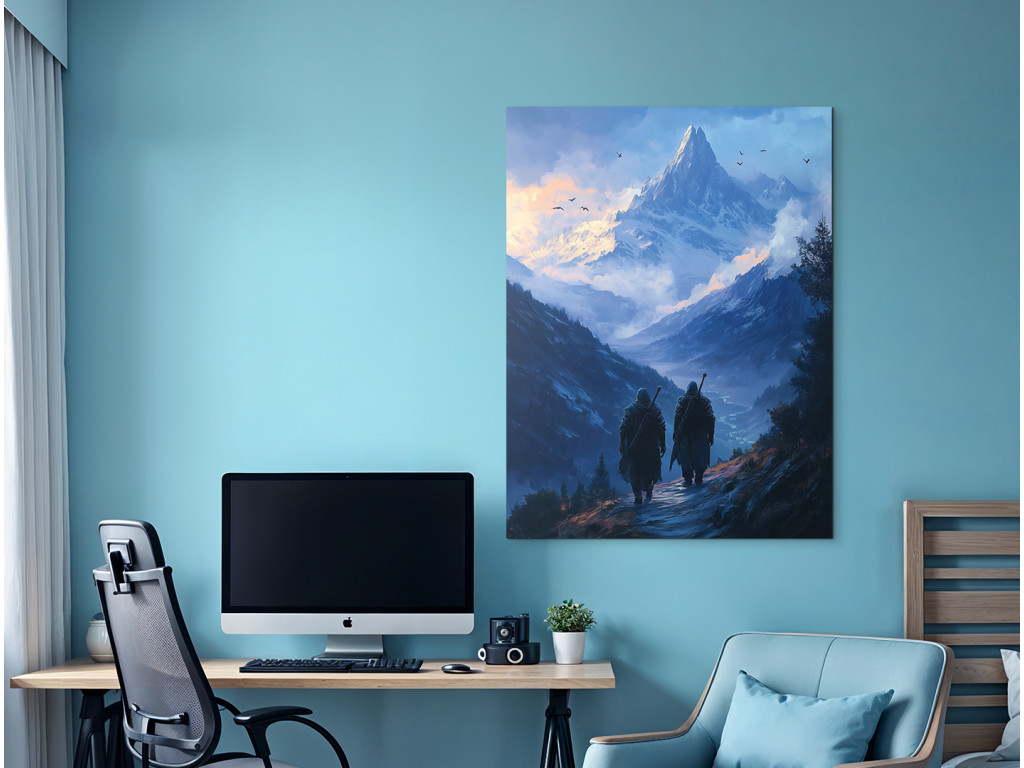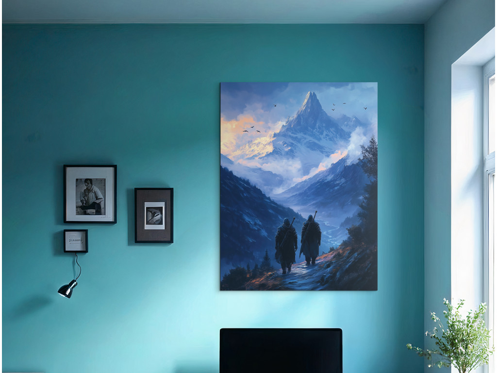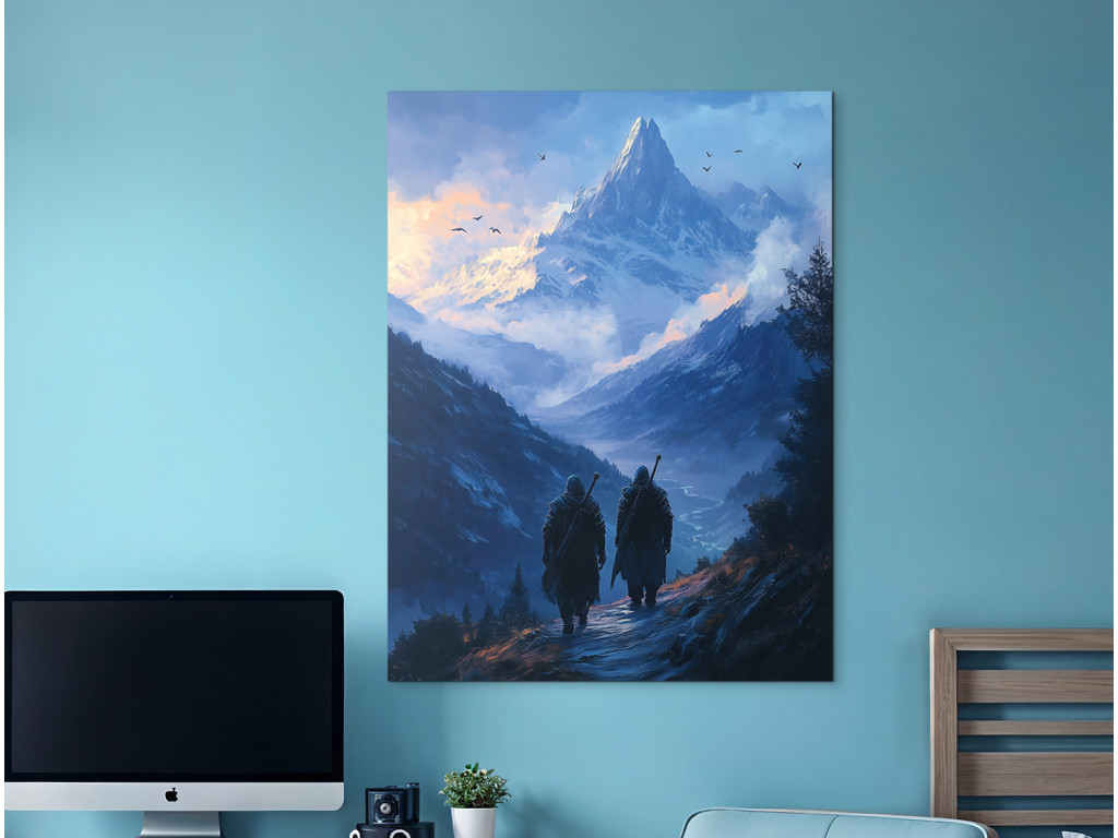L'image montre deux personnages errant dans un paysage montagneux sauvage en direction d'une majestueuse montagne enneigée. Un chemin caillouteux serpente à travers la vallée, tandis que les montagnes silencieuses, la brume et le coucher du soleil créent une atmosphère mystique et paisiblement épique. La scène symbolise le cheminement intérieur, le courage et la force tranquille de la détermination.