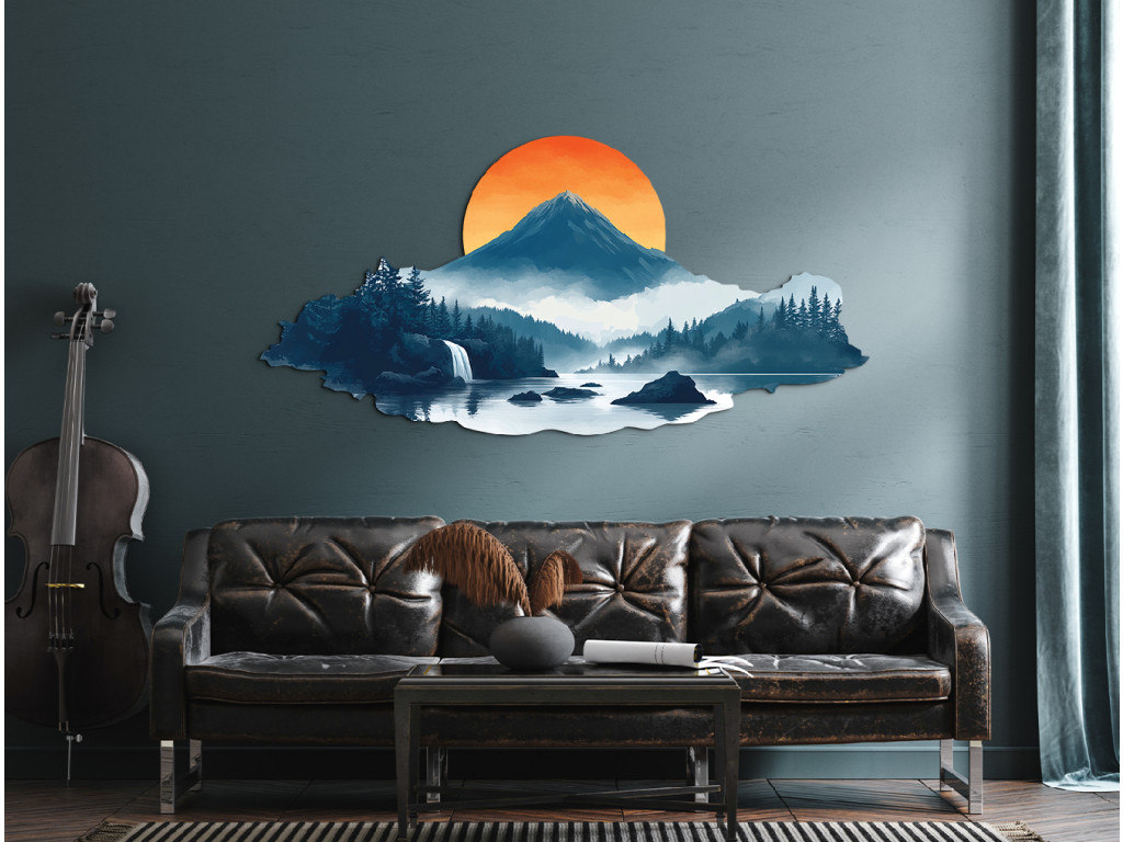 Ce paysage artistique capture le moment magique du coucher du soleil. La montagne dominante entourée de forêts, la cascade se jetant dans un plan d'eau calme et la brume légère créent une impression de paix, de pureté et de retour à la nature. La scène donne l'impression d'un refuge silencieux et apaisant, un lieu qui peut être pour certains un véritable foyer ou un foyer symbolique.