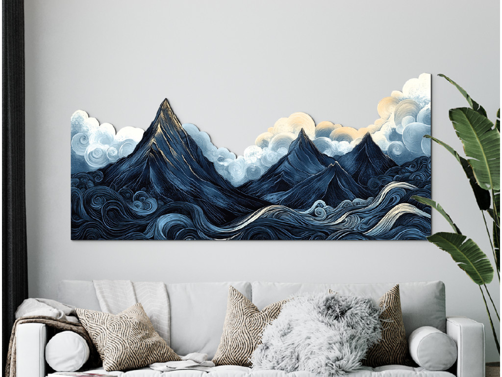 Le paysage stylisé capture le scénario dramatique de montagnes escarpées et sombres sous un ciel lourd et nuageux, tandis que les eaux ondulantes et tourbillonnantes au premier plan ajoutent du mouvement et de l'énergie à la composition. Les formes douces et arrondies des nuages contrastent avec les lignes acérées des montagnes, créant ainsi une impression onirique et artistique. La palette bleu foncé et grise est égayée par une douce lueur jaune-orange au sommet des montagnes, comme un signe d'espoir au milieu d'une tempête imminente.