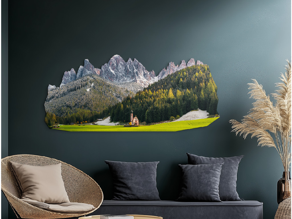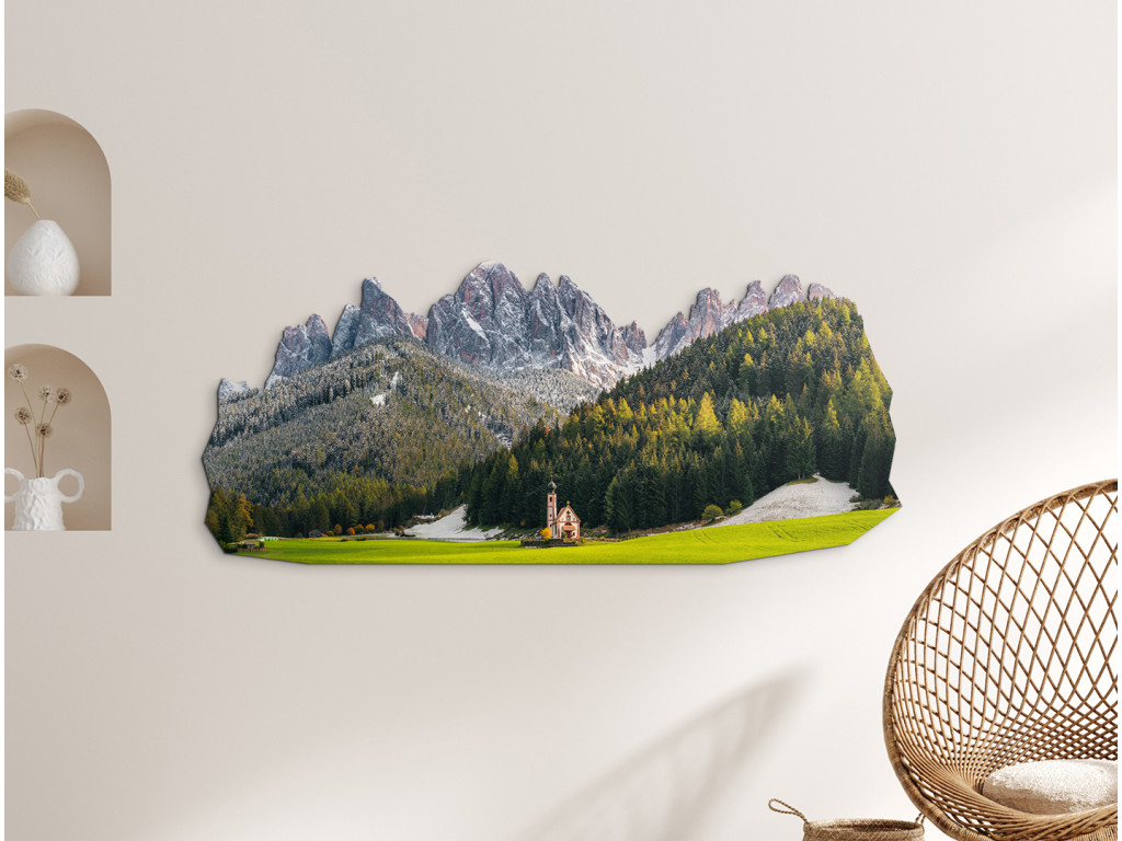 Le tableau Dolomites italiennes capture une vue impressionnante des majestueux sommets rocheux, au pied desquels s’étendent une forêt dense et une prairie verdoyante avec une petite église pittoresque. Le contraste entre les montagnes monumentales et le paysage rural paisible crée une composition harmonieuse et équilibrée. Grâce à une impression UV précise, les couleurs naturelles du paysage ainsi que les détails des arbres et de l’architecture sont parfaitement mis en valeur. Le tableau s’intègre idéalement dans un salon, un bureau ou un intérieur de style naturel, où il instaure une atmosphère de calme et de sérénité alpine.