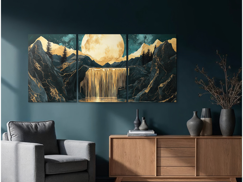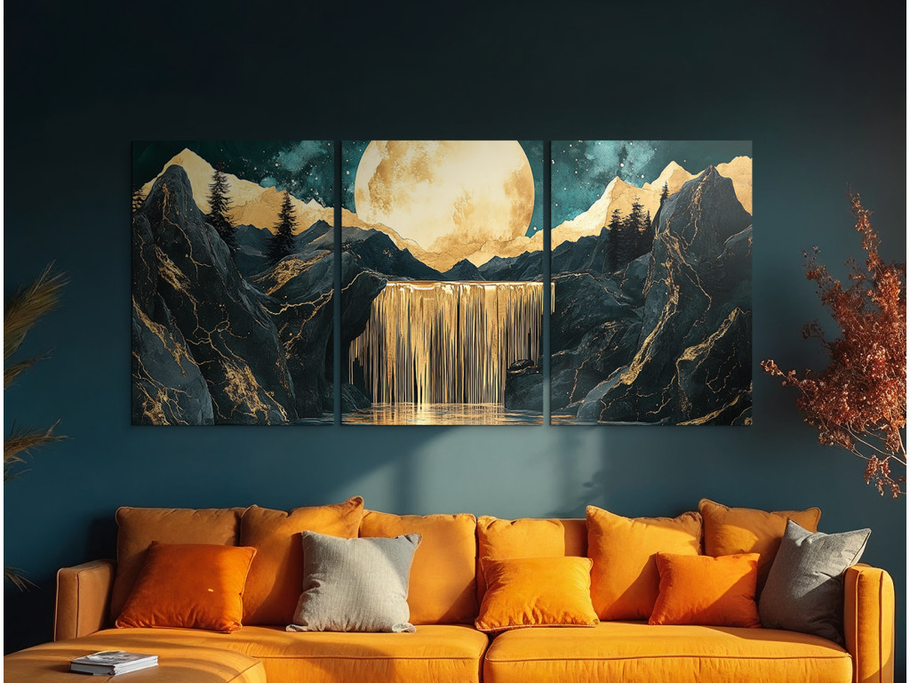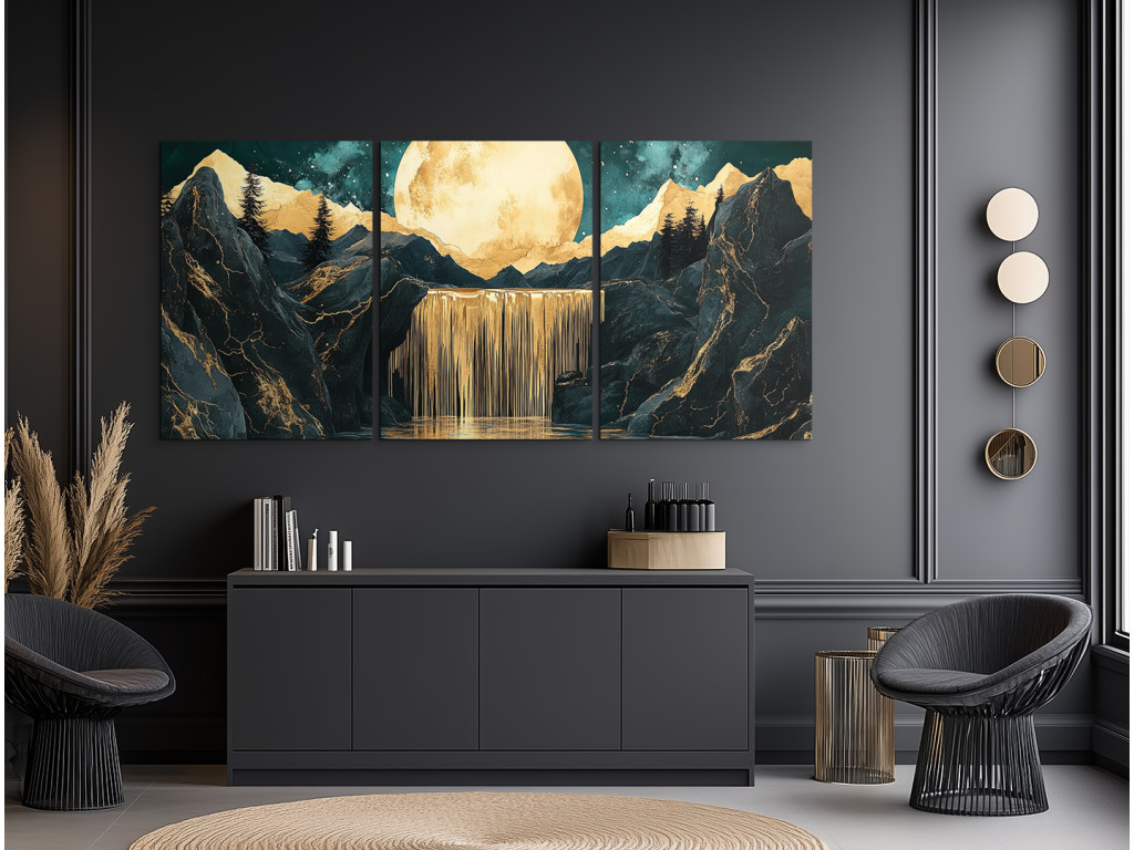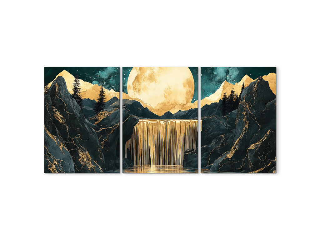 Le tableau à trois panneaux « Cascade lunaire » dégage une atmosphère mystique moderne. La lune dorée dominante se détache au-dessus d'une cascade, tandis que l'ensemble de l'œuvre est divisé en trois parties pour un effet visuel saisissant. Les silhouettes sombres des montagnes ou des rochers en arrière-plan renforcent le contraste et la signification profonde du tableau.