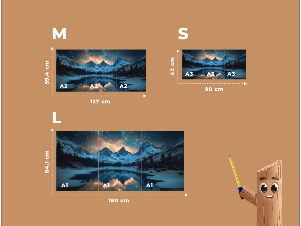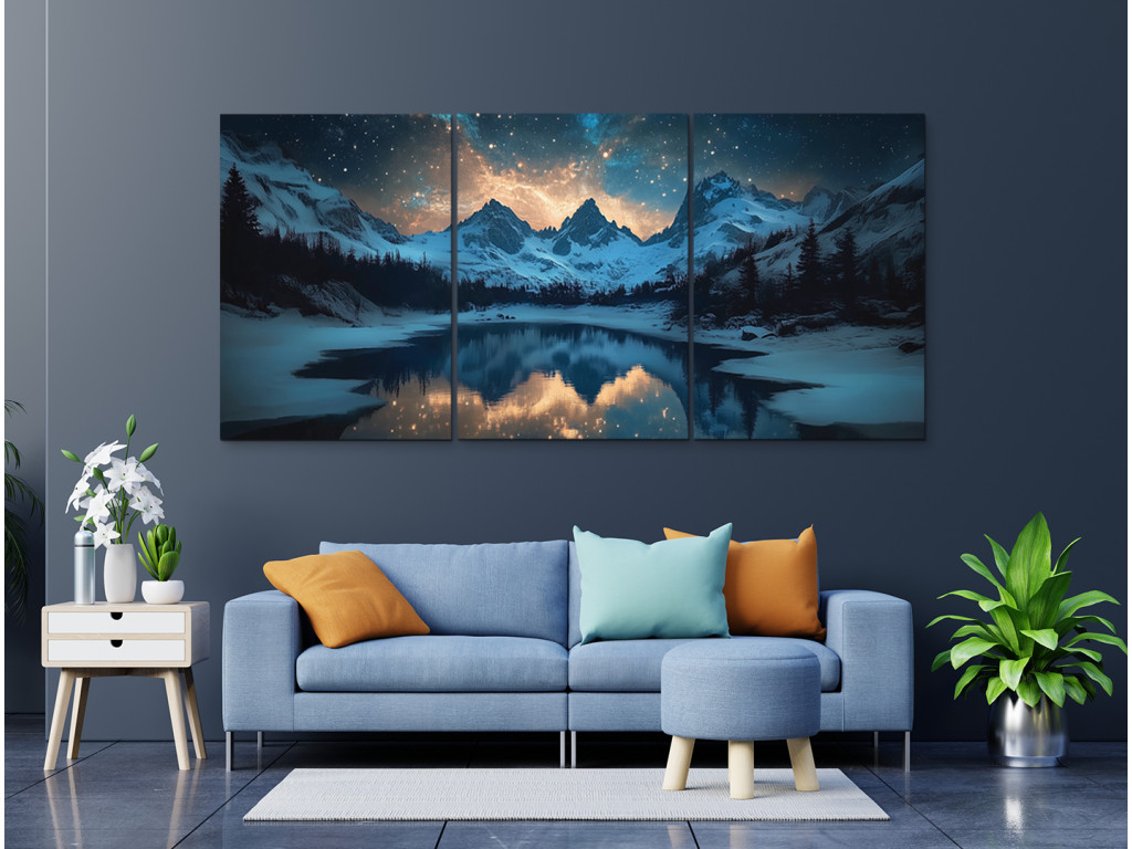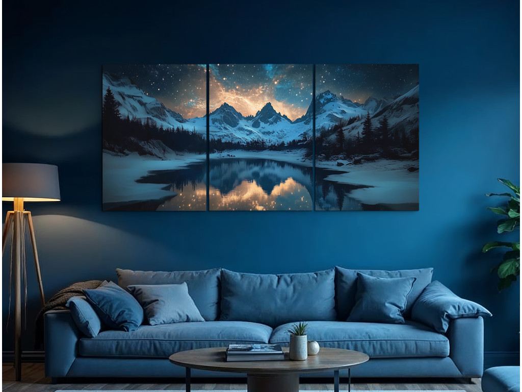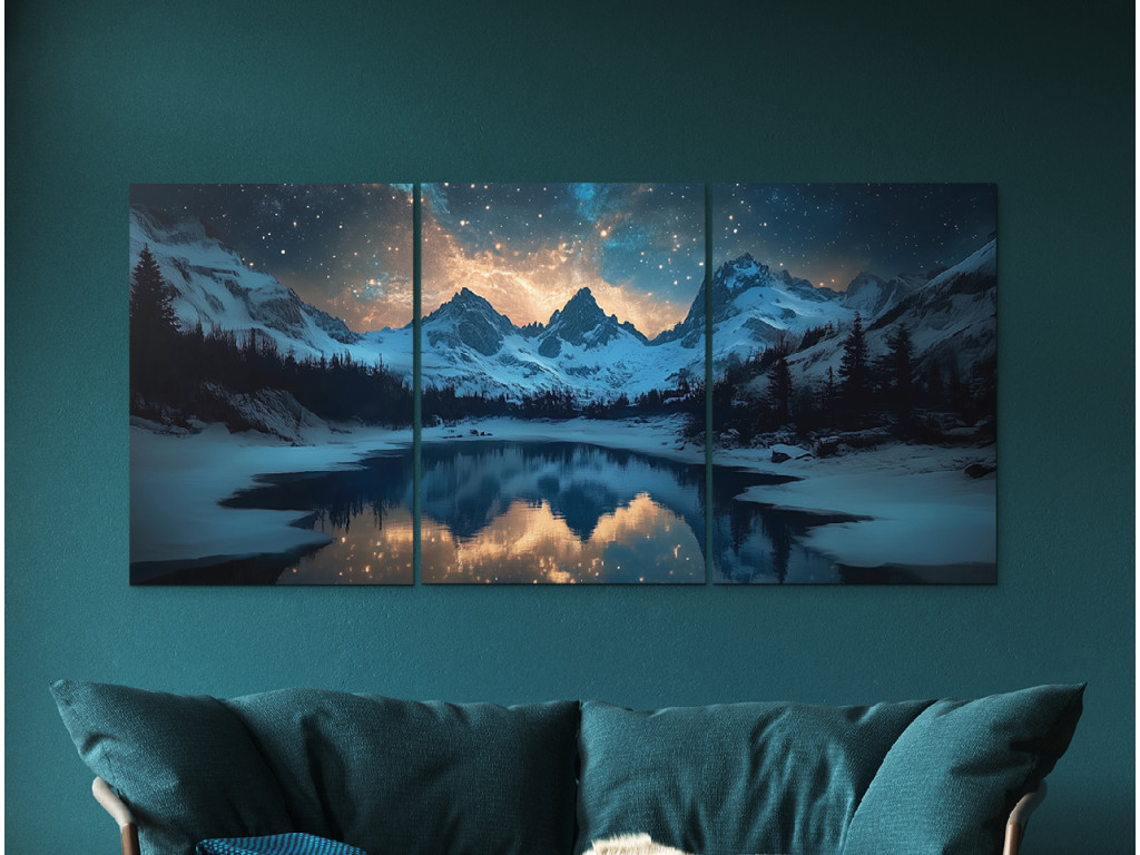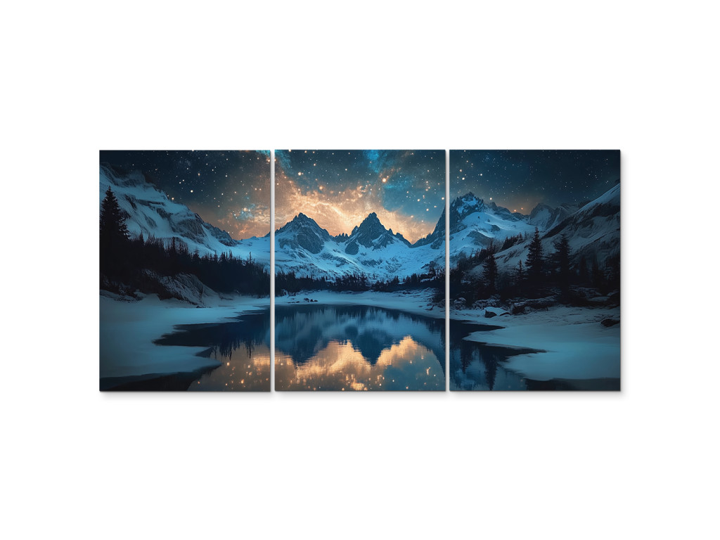 Les sommets majestueux enneigés sous un ciel nocturne brillant, plein d'étoiles et de lumières colorées rappelant l'aurore boréale, sont représentés dans un tableau en trois parties. Au premier plan s'étend un lac paisible qui reflète le paysage et le ciel, bordé de conifères enneigés.