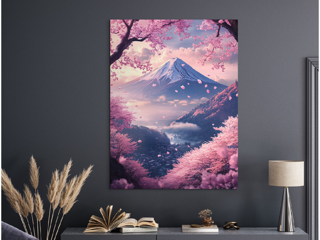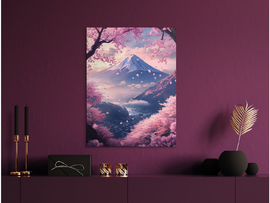 Le tableau représente l'emblématique mont Fuji entouré de cerisiers en fleurs qui remplissent la scène d'un rose délicat. Les pétales qui tombent et l'arrière-plan brumeux créent une atmosphère onirique qui exprime la tranquillité et la beauté fragile de la nature japonaise.