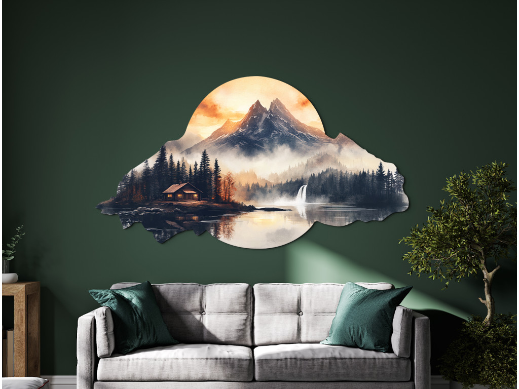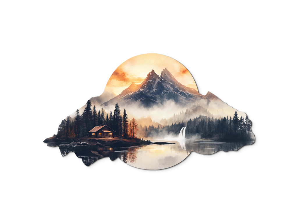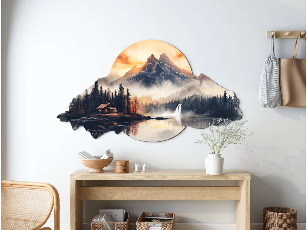 La décoration murale Maison sous les montagnes capture une scène paisible de paysage montagneux avec une cabane au bord d'un lac, entourée d'une forêt dense de conifères. Au loin, les montagnes sont enveloppées de brume, tandis que la cascade sur la droite ajoute du mouvement et de la vie à la scène. Les tons chauds orange et jaunes du ciel suggèrent l'aube ou le crépuscule, et le cadre irrégulier et organique, rappelant un nuage ou une colline, renforce l'impression qu'il s'agit d'un souvenir, d'un rêve ou d'une évasion vers un paradis naturel.