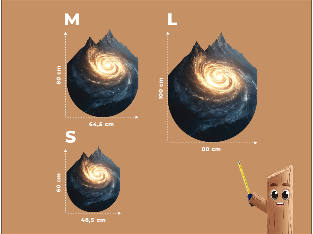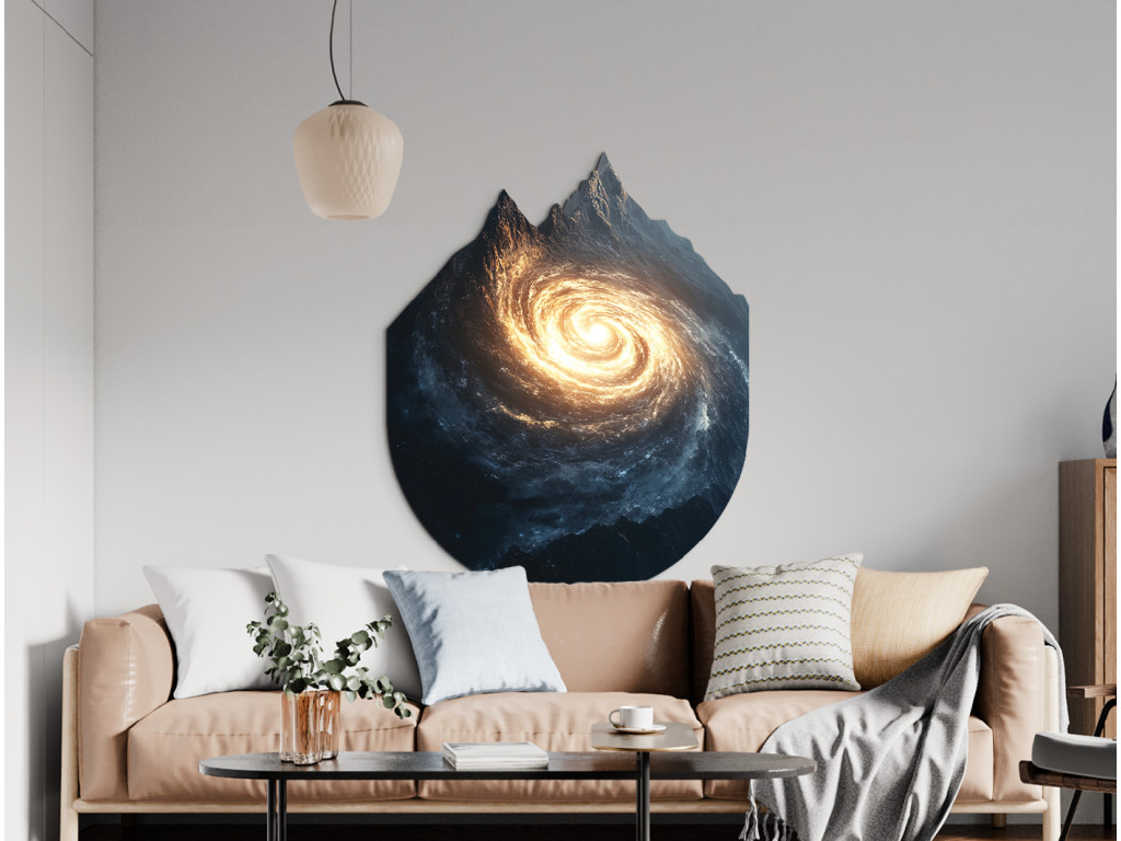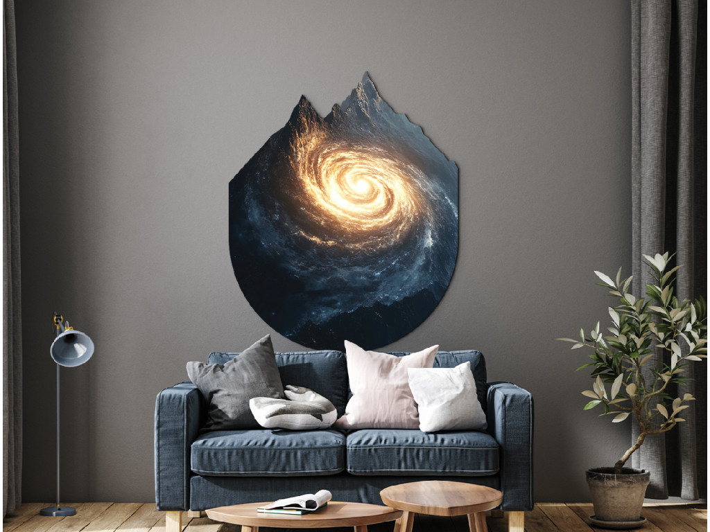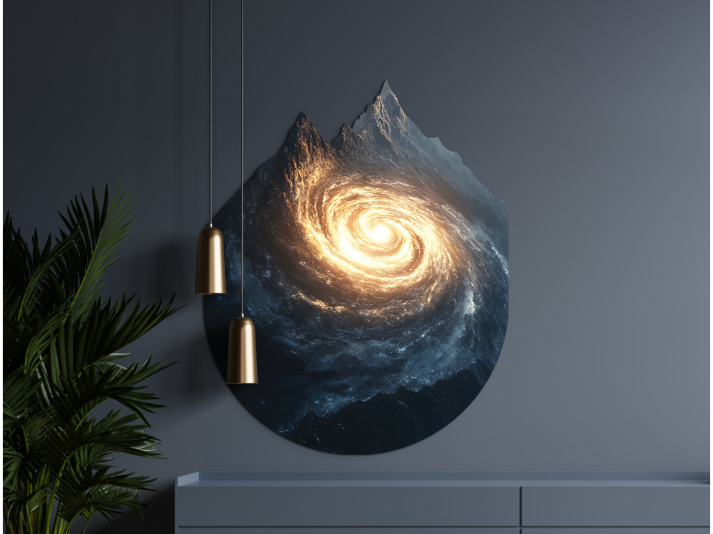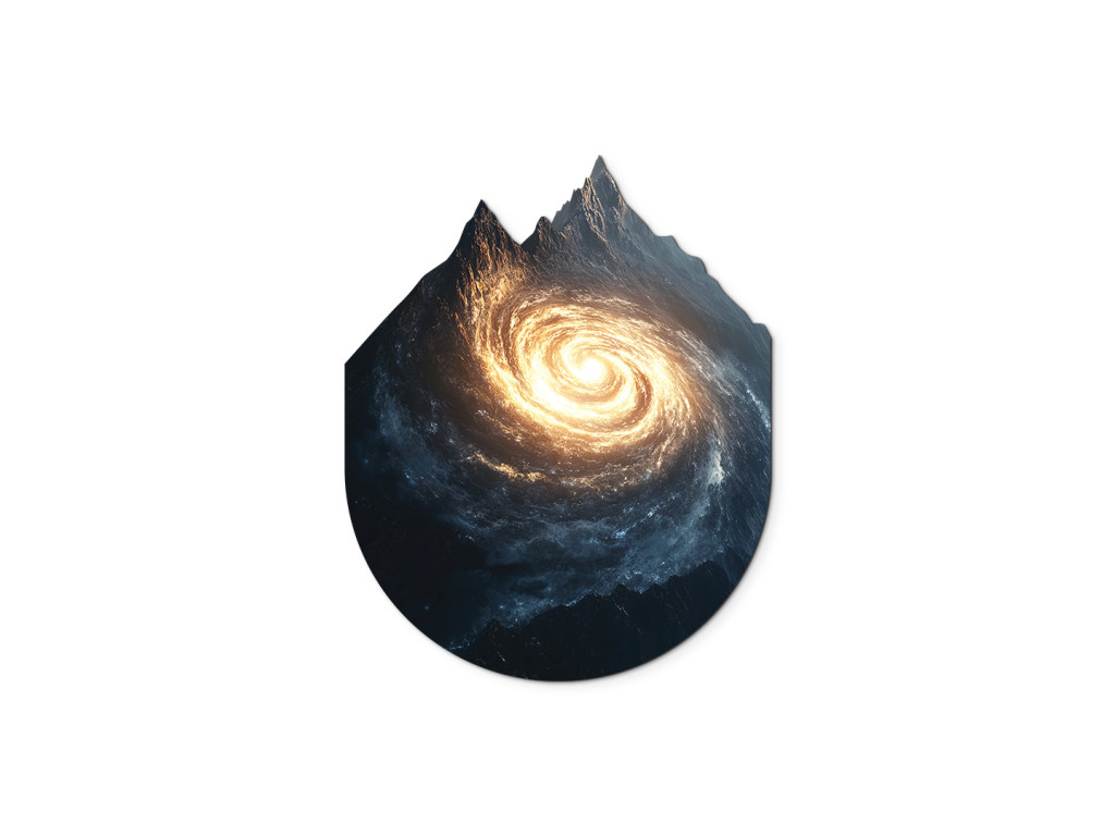 La composition artistique relie la forme de montagnes majestueuses à une galaxie en spirale qui s'étend à l'intérieur, ou dans la silhouette, de celles-ci. Ce contraste visuel crée un sentiment de connexion entre le paysage terrestre et l'univers infini. L'œuvre symbolise l'unité de la nature et de l'espace cosmique, rappelant que même les rochers les plus solides peuvent receler les profondeurs de l'univers.