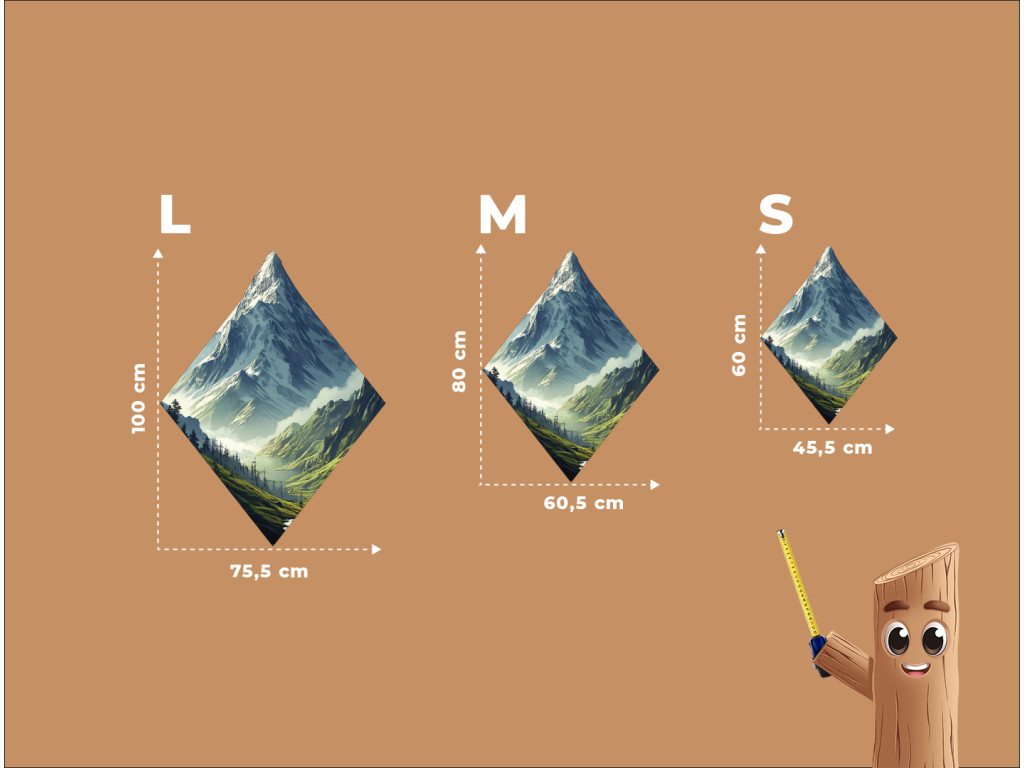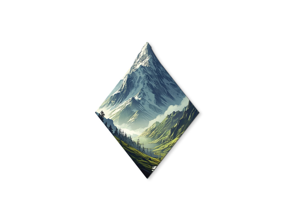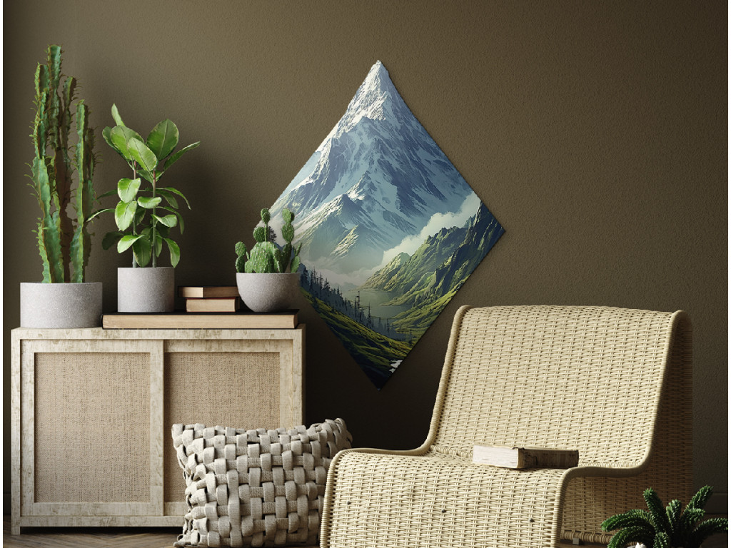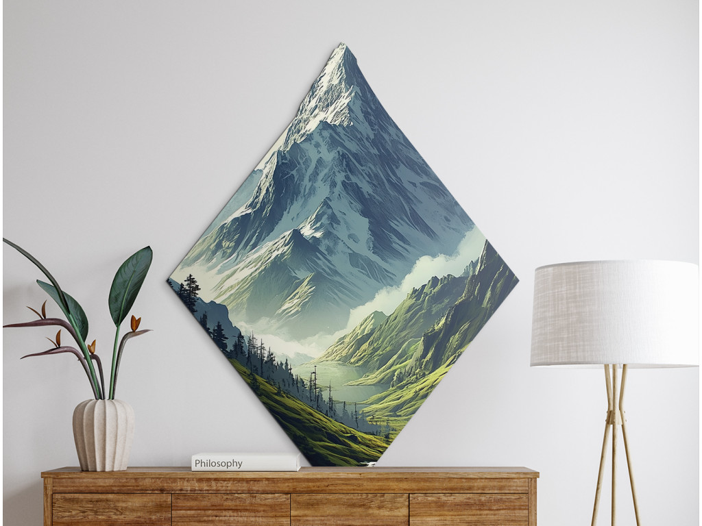 Le tableau représente un pittoresque paysage montagneux en forme de diamant, où les pentes verdoyantes couvertes d'arbres descendent vers un lac paisible. Au loin, les sommets enneigés dominent, contrastant avec les tons chauds de la nature au premier plan. Le format atypique confère à l'œuvre un caractère moderne et exceptionnel.