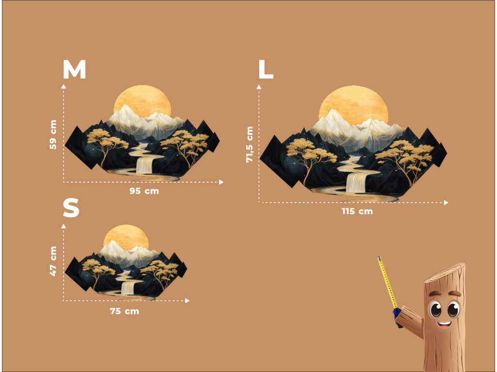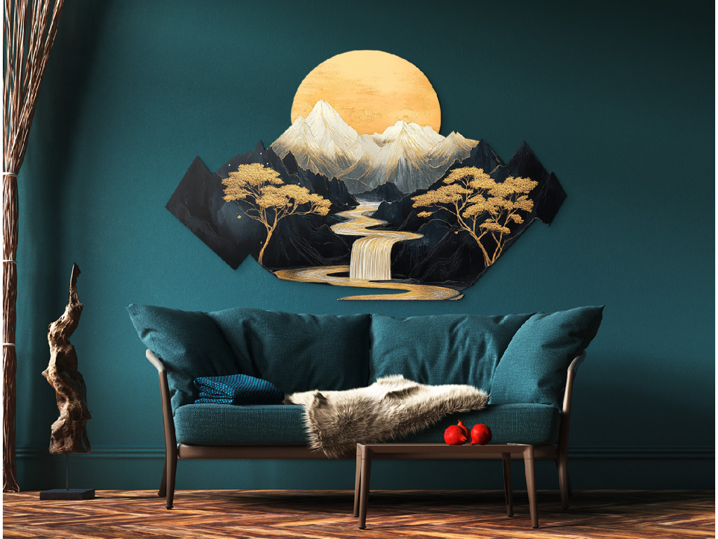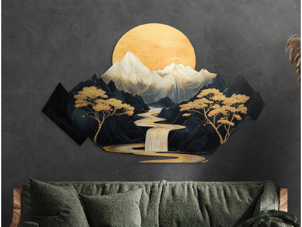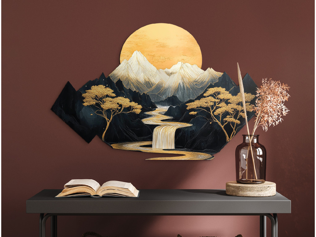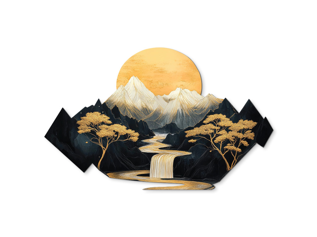 Cette œuvre d'art minimaliste représente un paysage paisible avec des montagnes, une rivière et une cascade, complété par un grand soleil ou une grande lune dorés. La composition stylisée dans des tons sombres et dorés donne une impression d'harmonie et d'équilibre. Elle convient comme décoration murale moderne, apportant calme et élégance à la pièce.