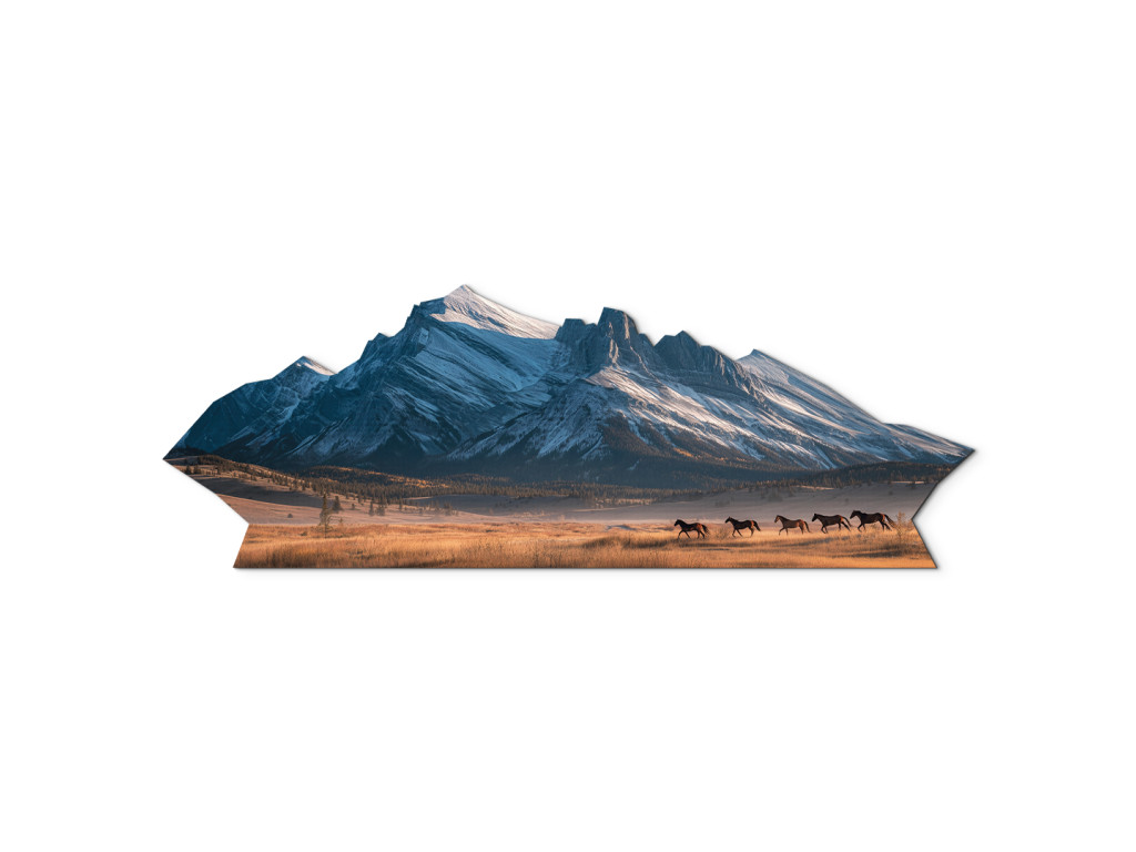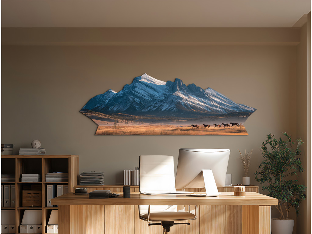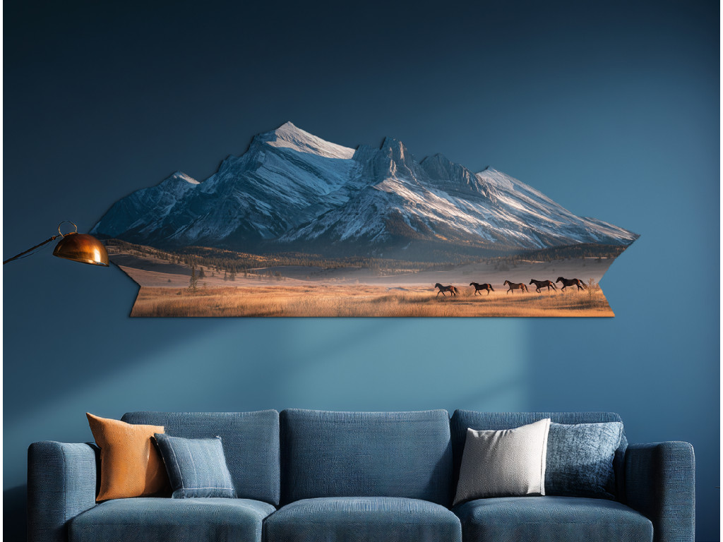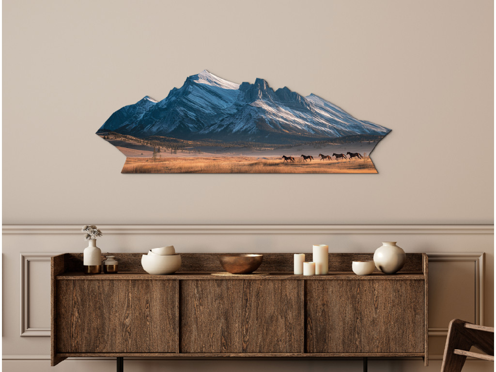 Cette peinture captivante en forme de montagne représente une chaîne de montagnes enneigées et un troupeau de chevaux au galop dans une prairie sous des sommets majestueux. La combinaison de l'énergie sauvage des chevaux et de la force tranquille des montagnes crée un motif artistique unique qui apportera à votre intérieur un sentiment de liberté, de mouvement et de beauté naturelle.
