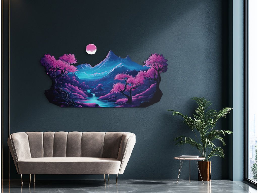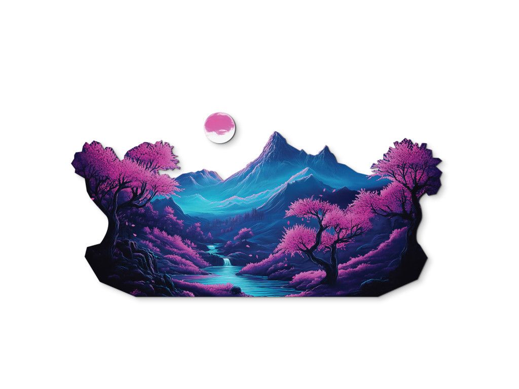 Ce tableau captivant représentant un paysage fantastique représente des montagnes bleu-violet, un soleil rosé et une rivière coulant dans une vallée entourée d'arbres aux fleurs roses de sakura. Les nuances délicates de bleu, de rose et de violet créent une atmosphère paisible et onirique qui apporte harmonie, détente et une touche de magie à la pièce. Le complément idéal pour les intérieurs qui recherchent une touche artistique et apaisante.