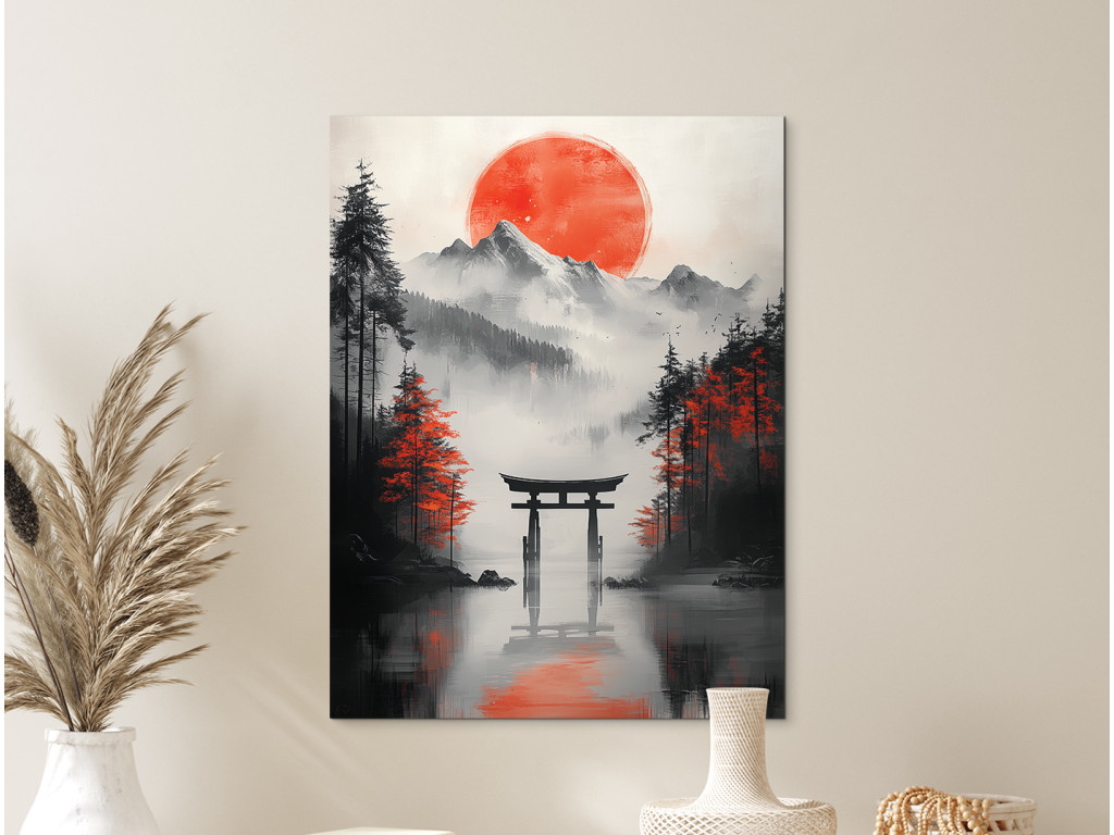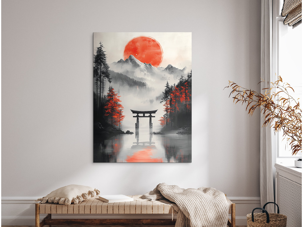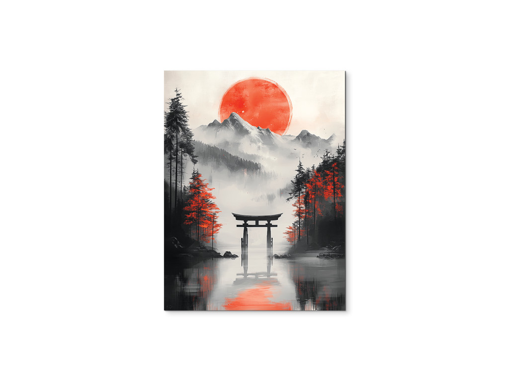 Le tableau représente un torii japonais, se dressant seul dans la campagne ou au-dessus de l'eau, comme symbole du passage vers le monde spirituel. Sa structure rouge avec des éléments noirs se détache sur un fond calme, soulignant ainsi sa signification rituelle et sa puissance esthétique. L'œuvre dégage une impression harmonieuse et méditative, idéale pour les lieux où l'on recherche la paix et l'équilibre spirituel.