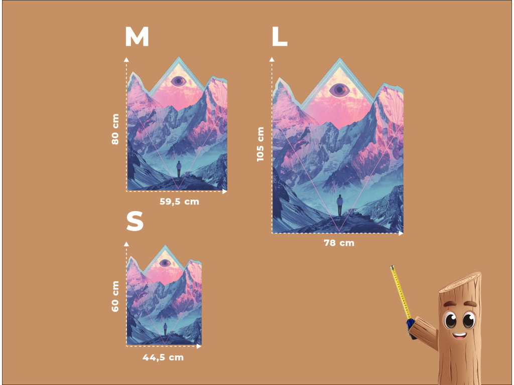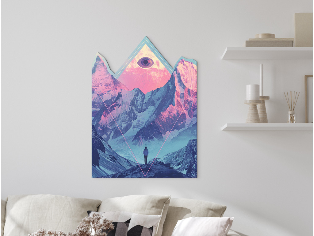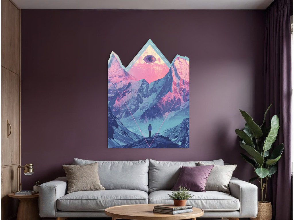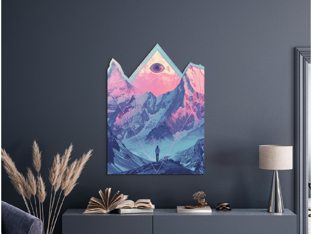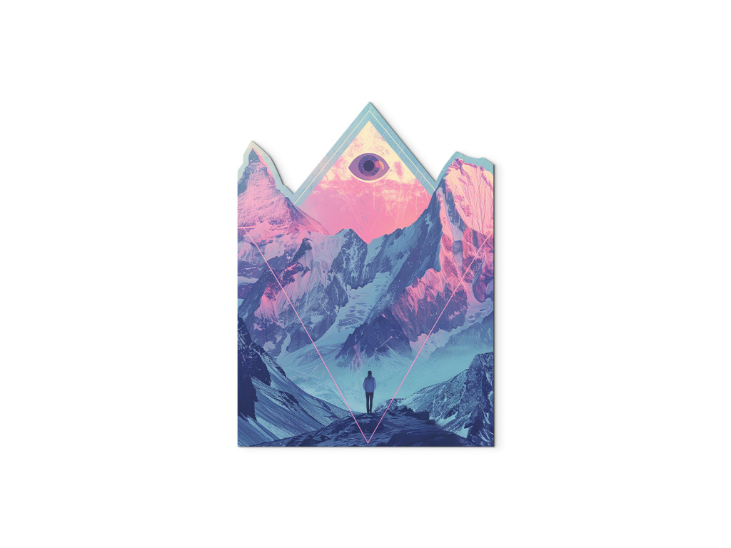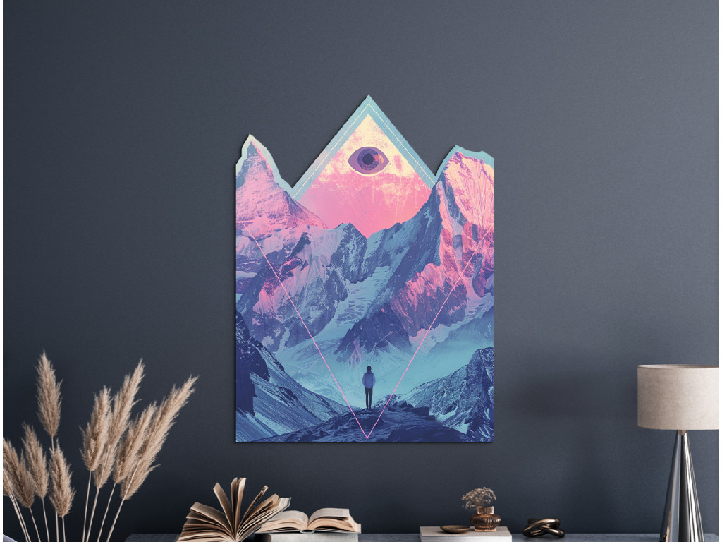Cette peinture numérique surréaliste associe des montagnes majestueuses dans des tons roses et bleus délicats à des symboles mystiques et à une atmosphère introspective. Le personnage solitaire au premier plan regarde vers les hauteurs, où un œil dans un triangle, symbole d'illumination et de connexion spirituelle, flotte au-dessus des sommets.