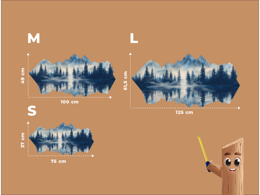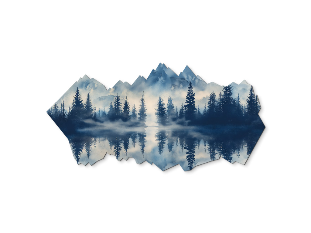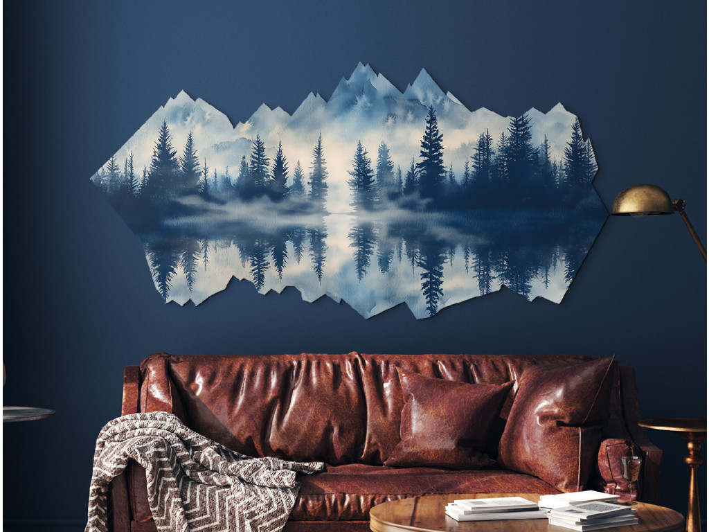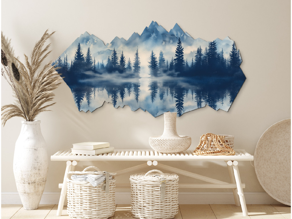 L'œuvre d'art représente un paysage montagneux paisible avec le reflet de la forêt et des sommets dans le lac. La brume et les tons bleus froids créent une atmosphère mystique et sereine qui a un effet apaisant. La forme atypique du tableau, qui reproduit la silhouette de la nature, en fait un accessoire d'intérieur original et moderne.