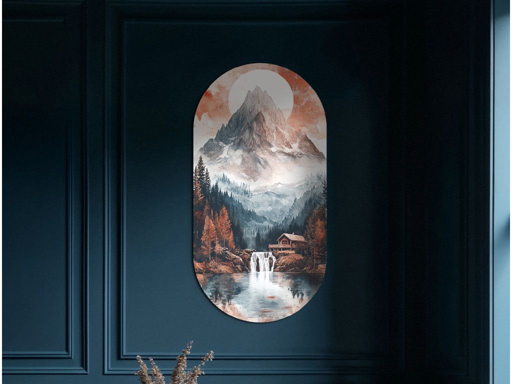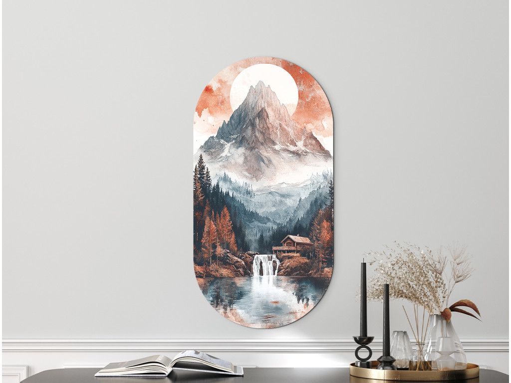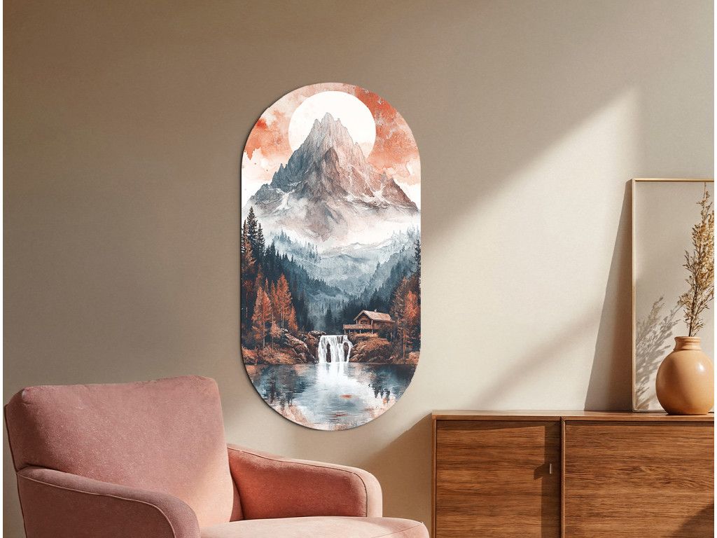 Le tableau ovale Silence sous le sommet représente un majestueux sommet montagneux enveloppé de brume, au-dessus duquel brille le soleil ou la lune dans des tons rougeâtres. Au premier plan s'étend un lac avec une cascade, bordé d'une forêt dense où les couleurs automnales se mêlent au vert des conifères. Une petite cabane en bois au bord de l'eau confère à l'ensemble une atmosphère de calme, d'isolement et de profonde connexion avec la nature.