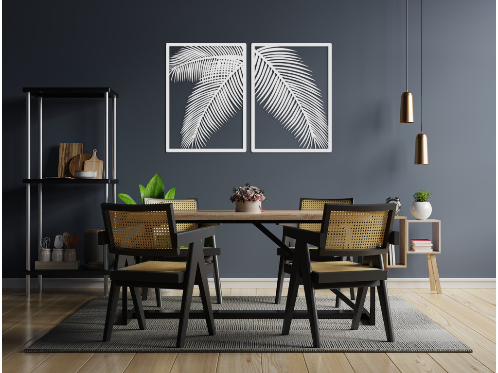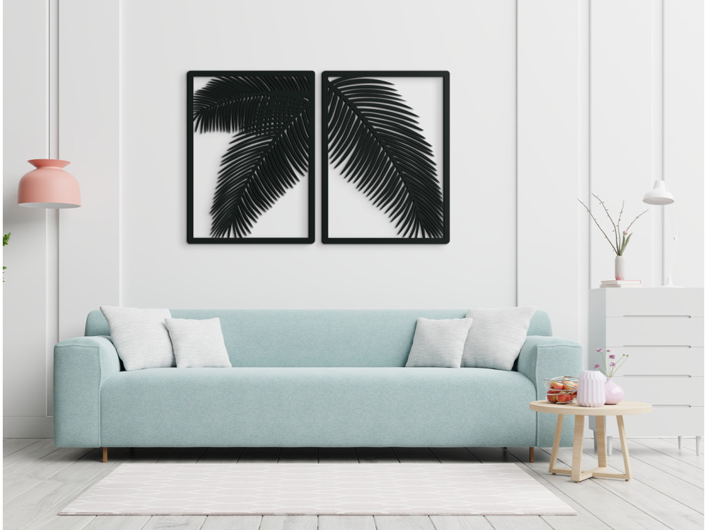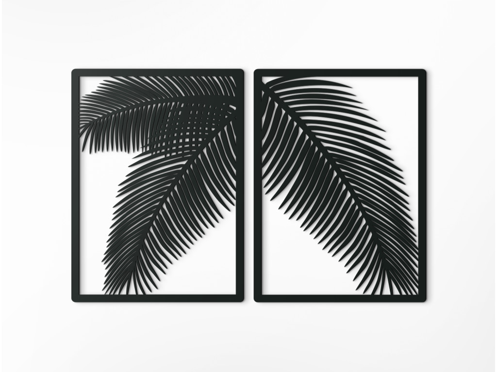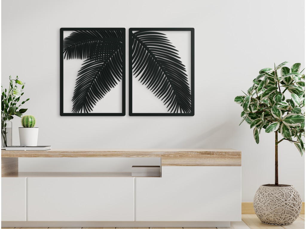 Palmy sú nádherné stromy, ktoré v nás vyvolávajú najmä dojem tepla a exotiky. Drevený obraz znázorňuje listy tohto krásneho stromu. Na ľavej strane sa nachádzajú dva listy, na pravej strane je vykreslený jeden list. Obraz má dizajnové rámy, ktoré zvýraznia stenu a urobia ju jedinečnou. Vybrať si môžete z viacerých farebných prevedení. Hodí sa do všetkých priestorov.