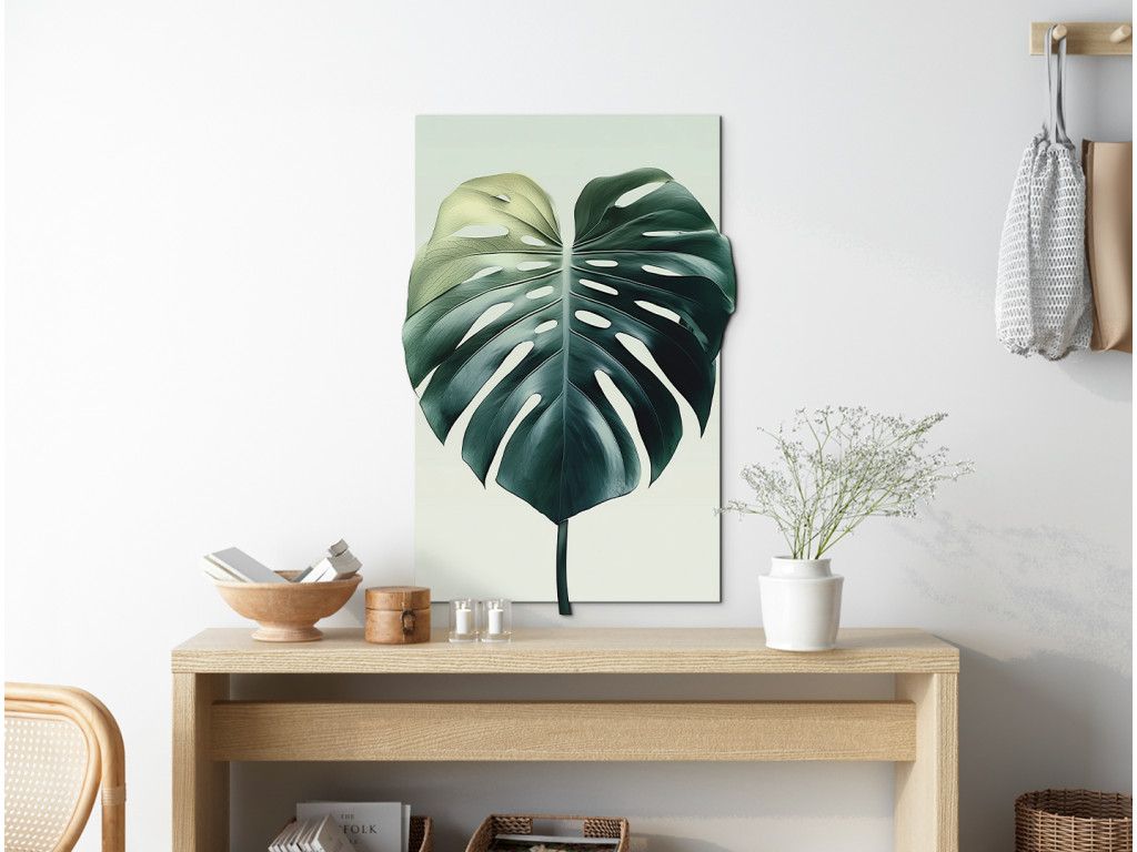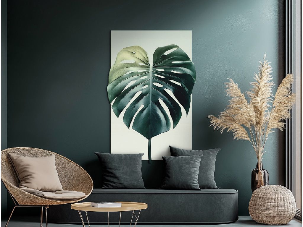 Le tableau représente la feuille emblématique du monstera dans des tons vert foncé, en mettant l'accent sur ses entailles et ses perforations naturelles qui lui confèrent une forme unique. Le fond clair fait ressortir la feuille comme élément visuel principal et souligne son caractère tropical et moderne. Un motif élégant et épuré, idéal comme décoration d'intérieur mettant l'accent sur la nature et la simplicité du design.