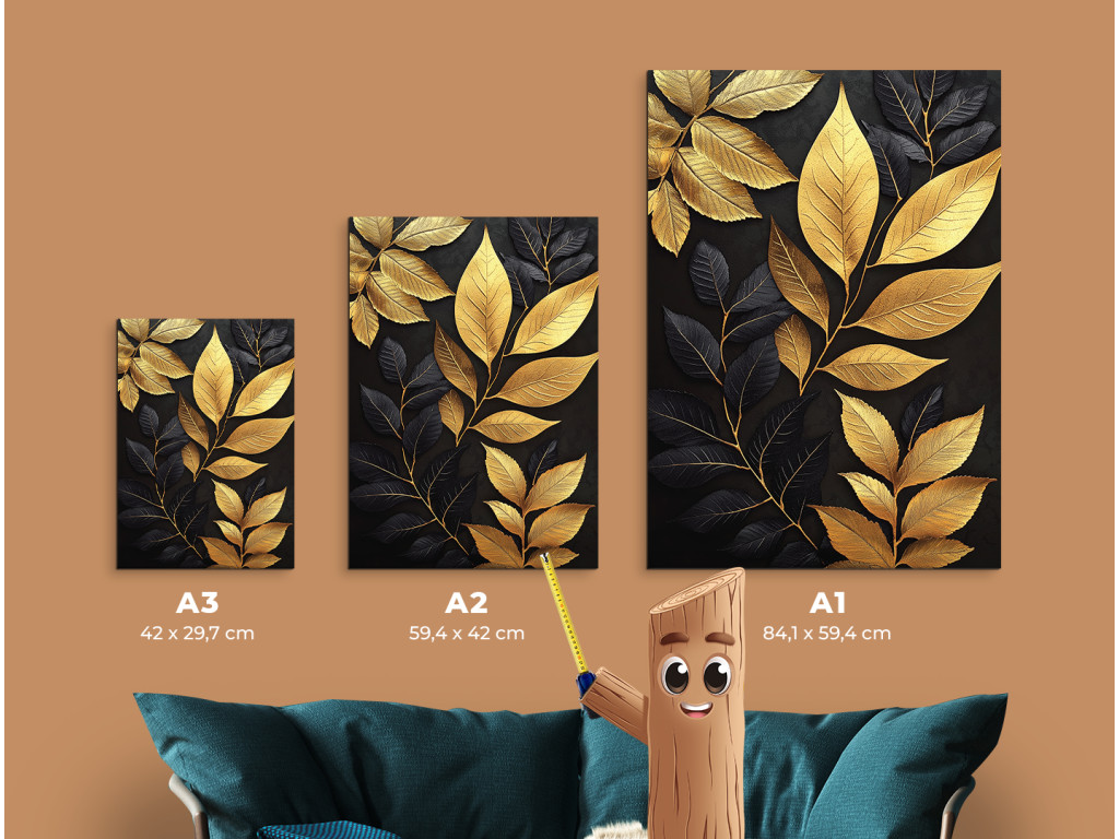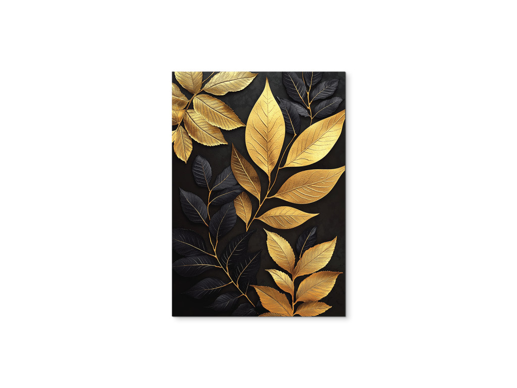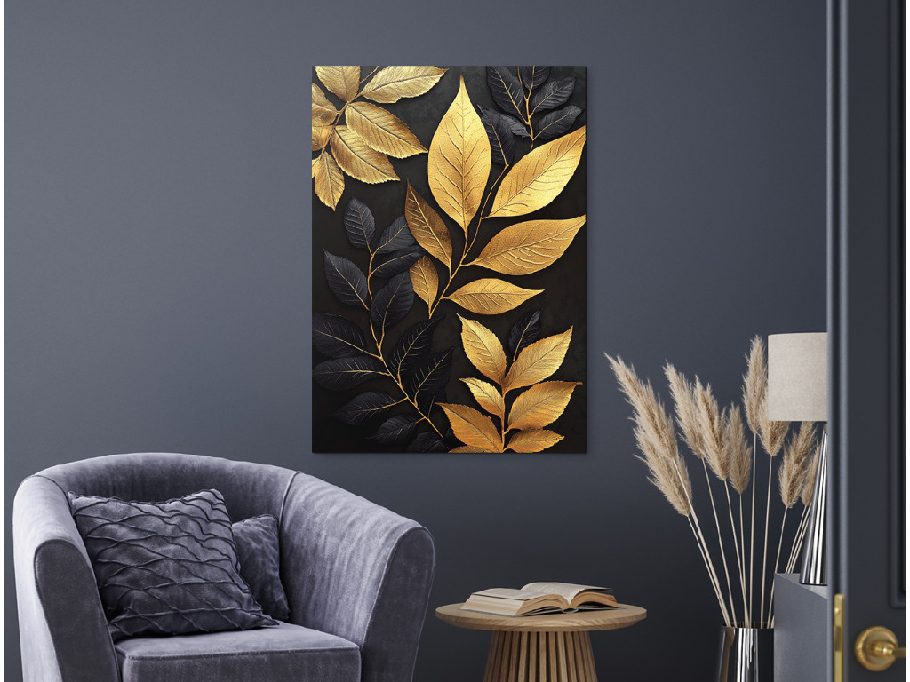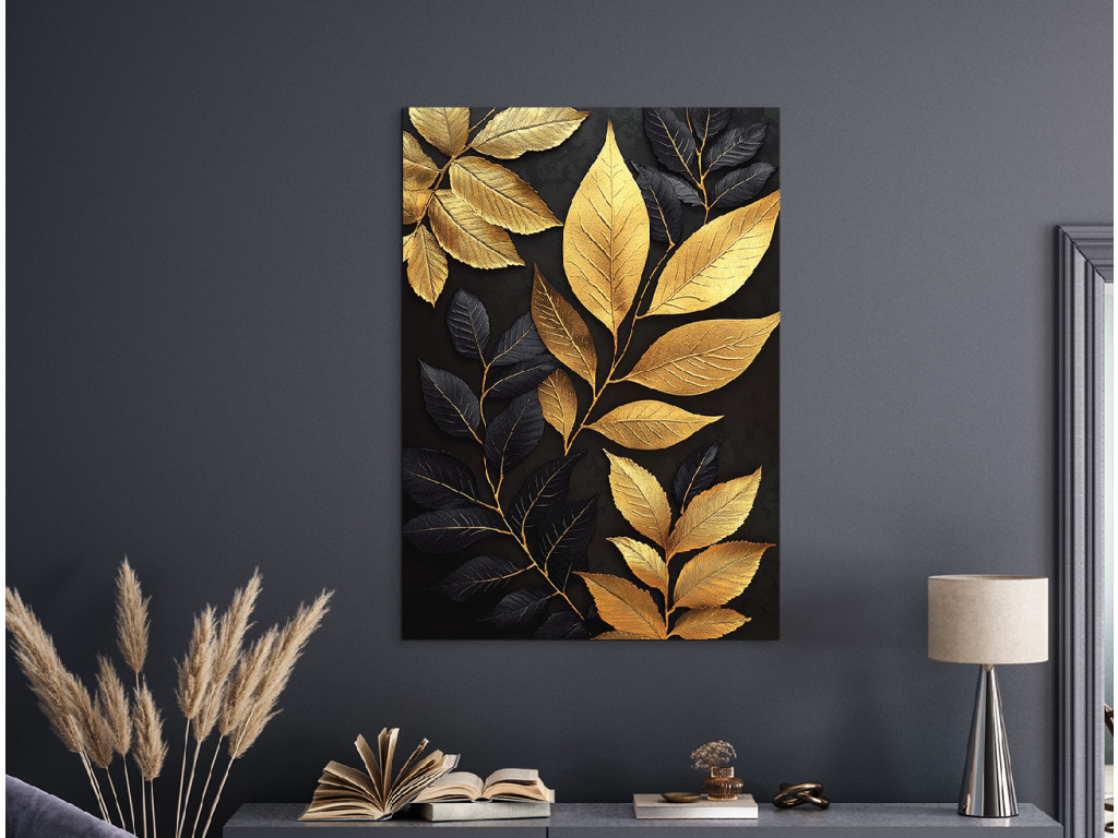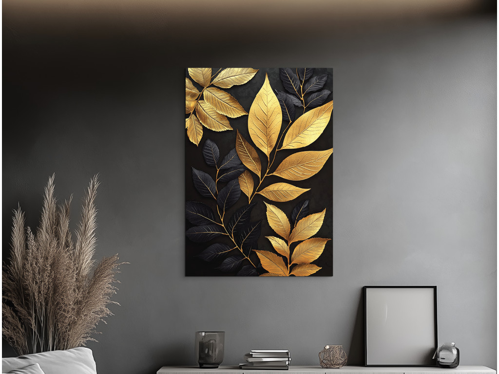 Les feuilles d'aulne dorées allient la délicatesse du motif naturel à l'élégance de l'or et au contraste des feuilles noires sur fond sombre. Le tableau a un aspect intemporel et apporte noblesse et sérénité à la pièce. Idéal pour un mur dans une chambre à coucher, un salon ou un bureau moderne.