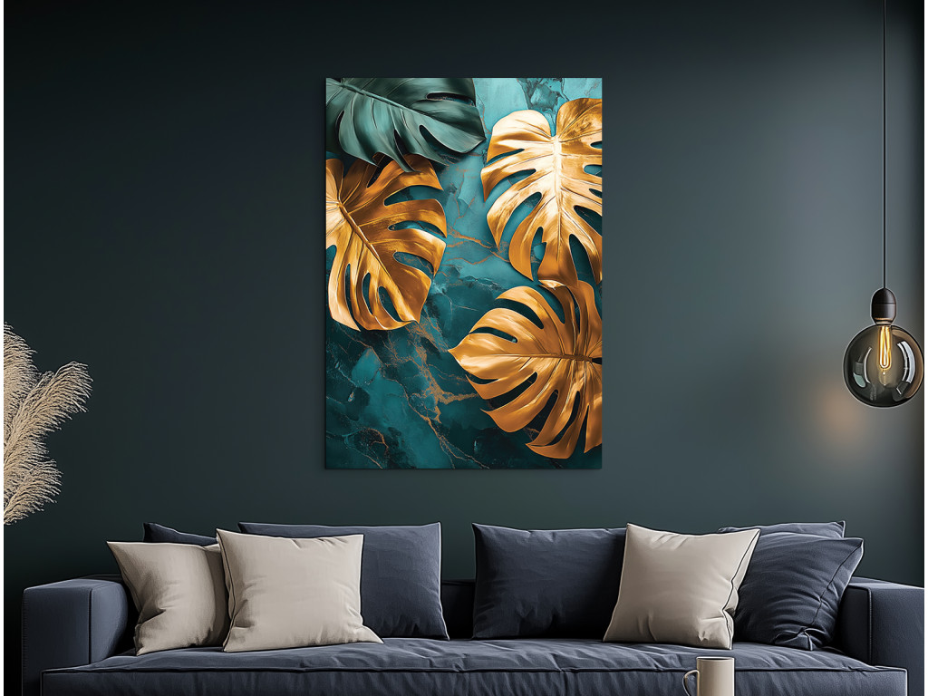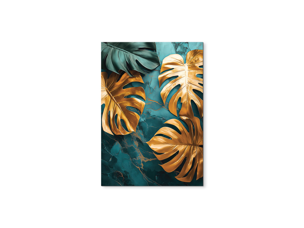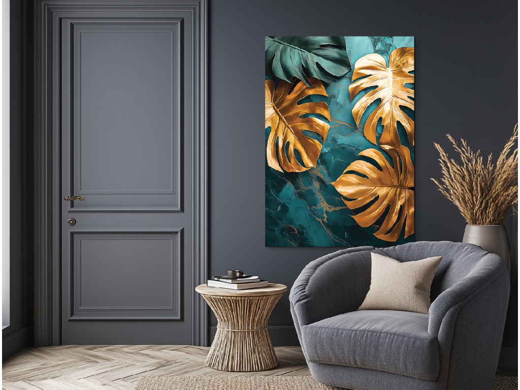 La monstera dorée attire le regard avec ses feuilles dorées brillantes qui contrastent avec le fond marbré émeraude. L'association du luxe et de la nature crée un effet à la fois exclusif et harmonieux.