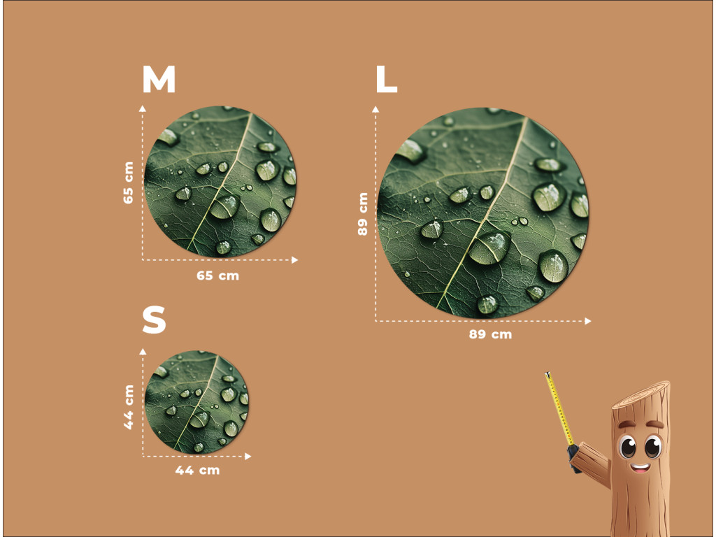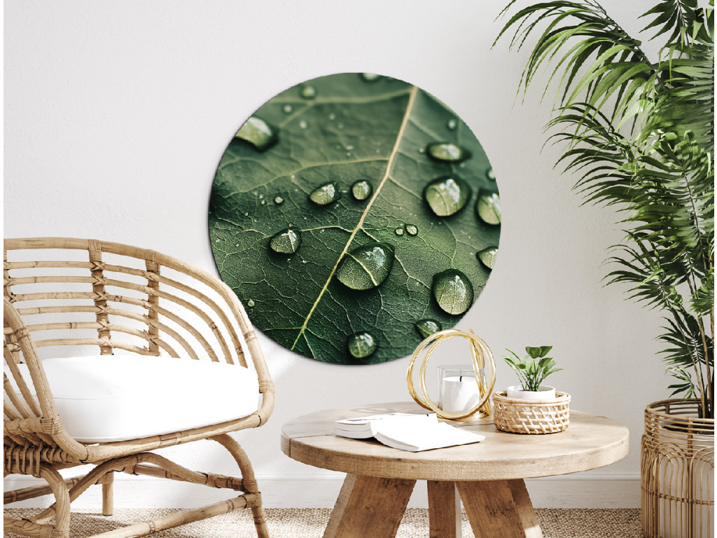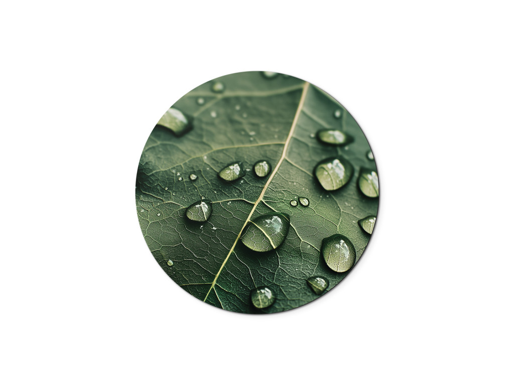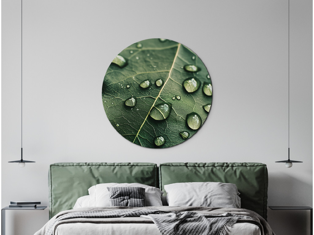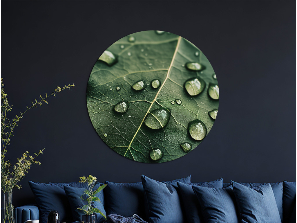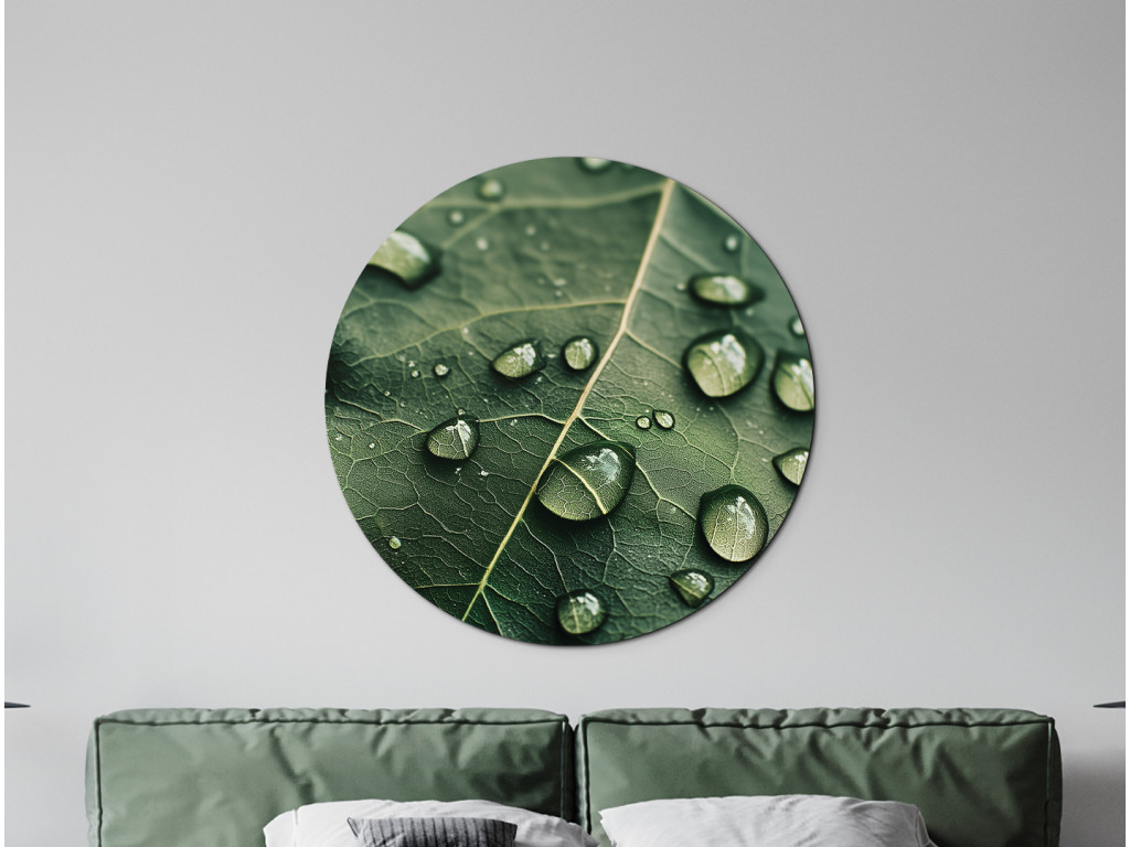 Le tableau rond Rosa offre une vue détaillée d'une feuille recouverte de rosée délicate, comme si elle capturait un moment de silence matinal. La découpe naturelle de forme circulaire crée une impression d'harmonie et apporte fraîcheur et sérénité à l'espace.