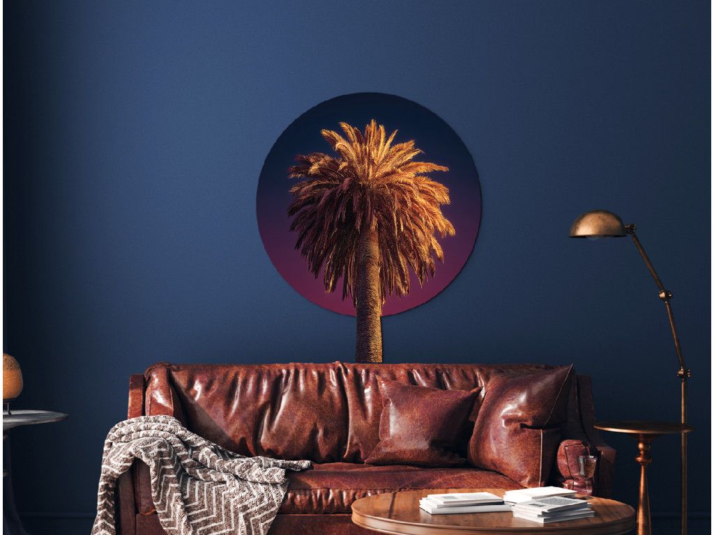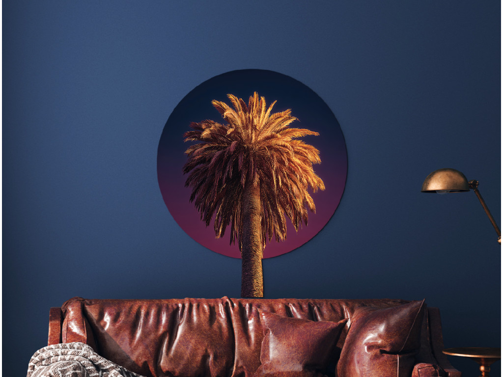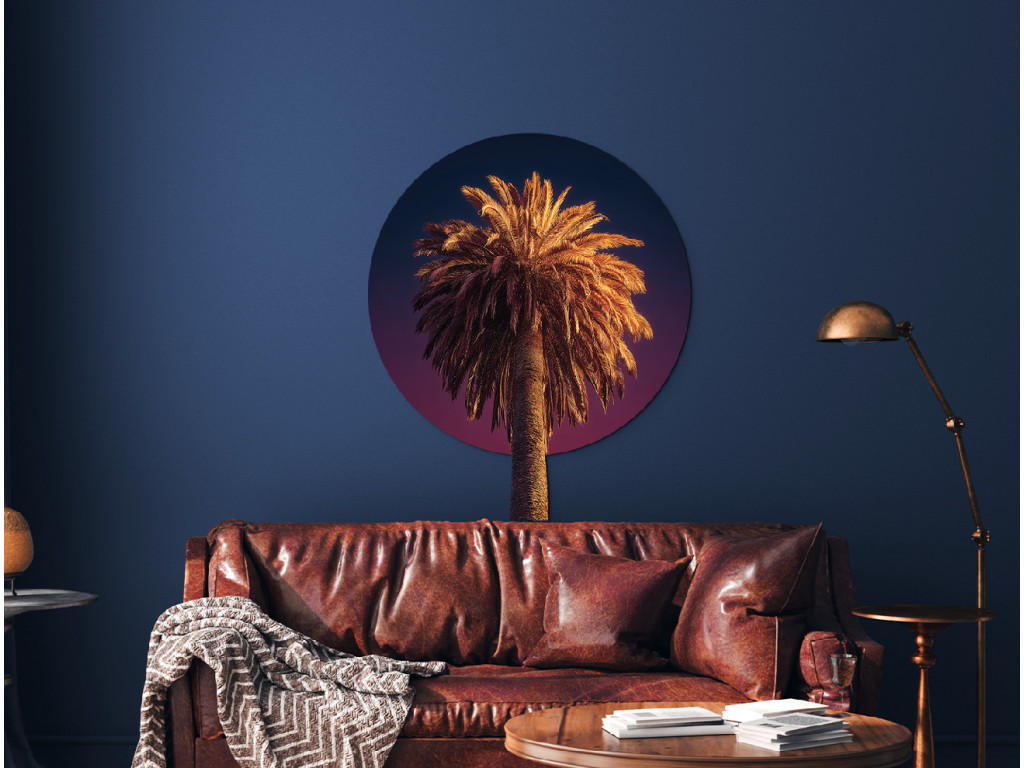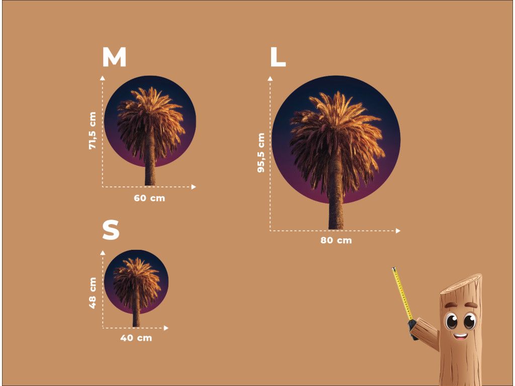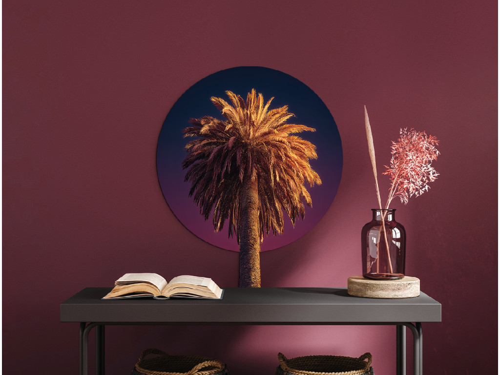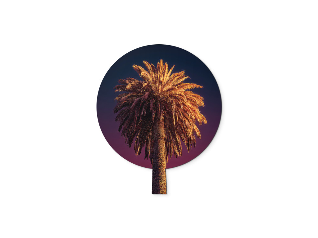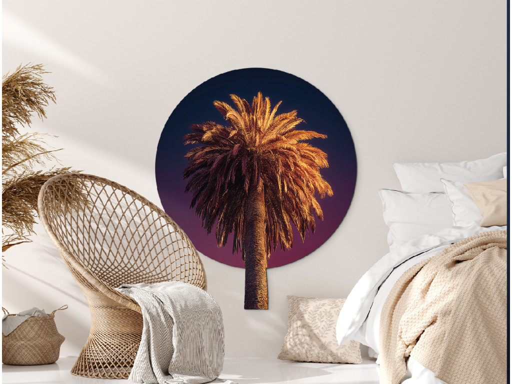 Le tableau représente un palmier dattier au tronc haut et aux grandes feuilles en forme d'éventail. Cette espèce de palmier pousse dans les pays chauds et est souvent associée aux plages, au soleil et à la détente.