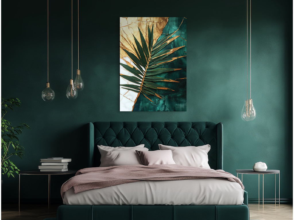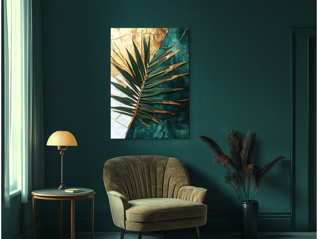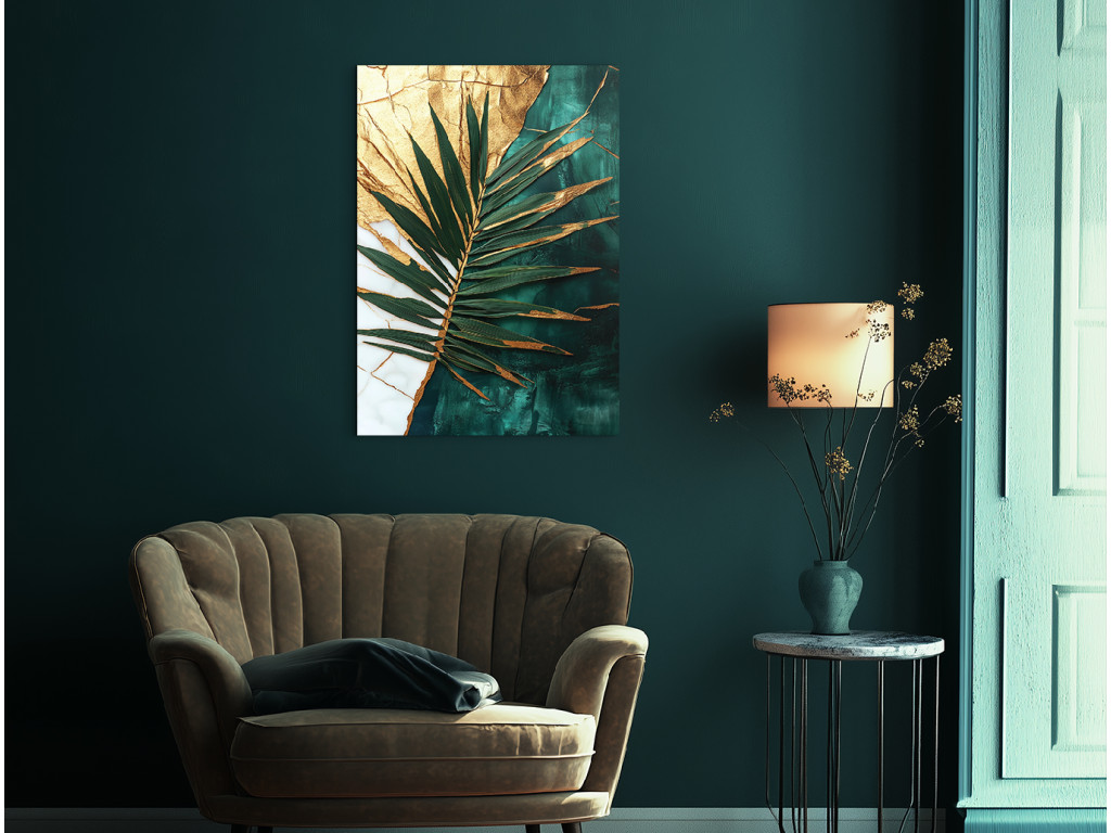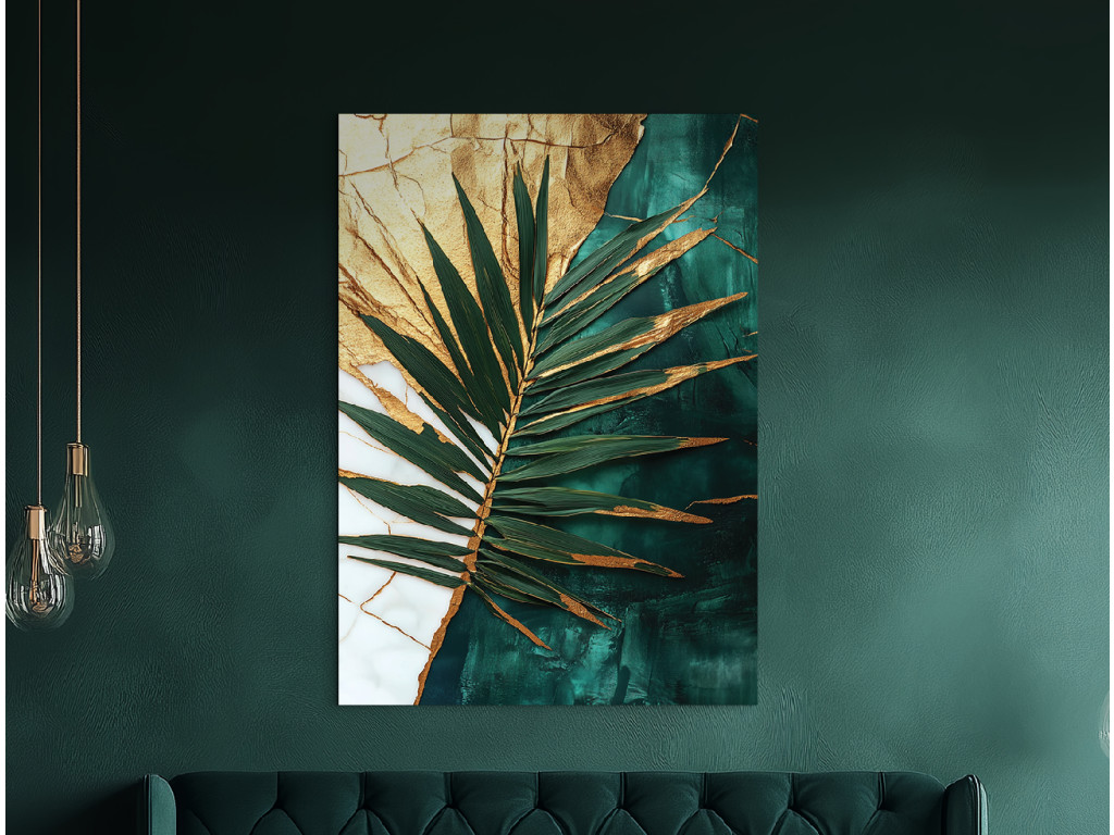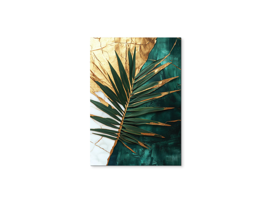 La touche dorée du palmier est une œuvre d'art moderne qui allie l'exotisme de la nature à la noblesse de l'or. Le détail de la feuille de palmier dans des tons de vert et de turquoise contraste avec le fond divisé entre une texture dorée craquelée et un vert marbré profond. Il convient à un intérieur élégant, où son caractère sophistiqué et apaisant sera mis en valeur.