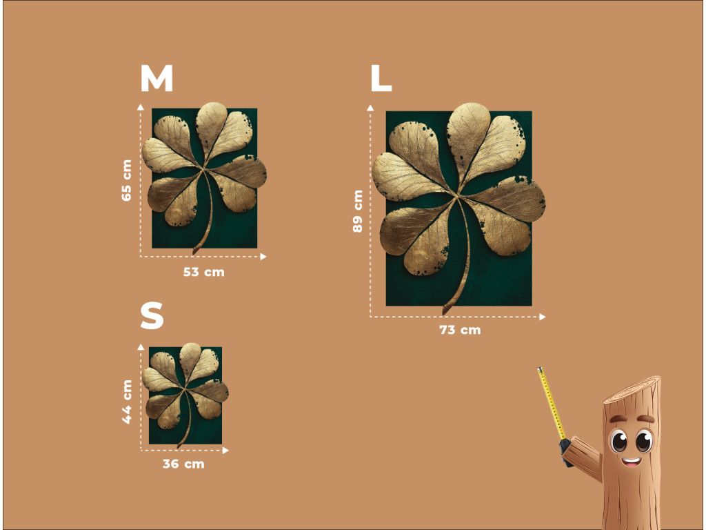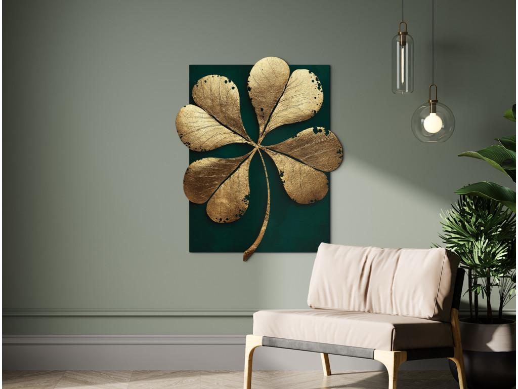 Le tableau « Trèfle à quatre feuilles » représente le symbole de la chance dans une teinte dorée sur un fond vert émeraude qui met en valeur sa forme unique et irrégulière. L'élégante combinaison de contraste et d'asymétrie lui donne un aspect moderne, tout en conservant une touche subtile de mysticisme. Les tons riches des couleurs UV garantissent que l'impression du trèfle sur le matériau semble visuellement pleine et profonde.