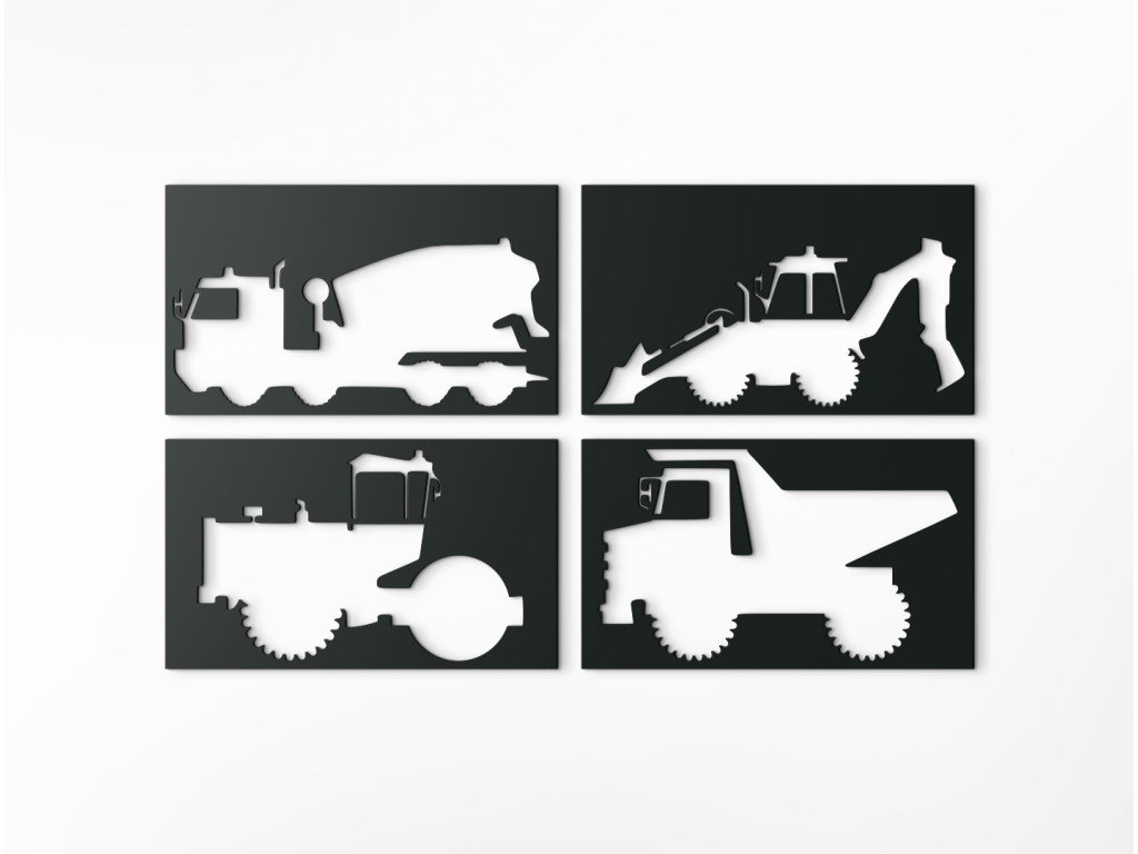 Drevený obraz Nákladné autá znázorňuje štvoricu ťažkých strojov - domiešavač betónu, traktor, valec a báger. Dekorácia na stenu je ako stvorená pre všetkých chlapcov, ktorí snívajú o tom, že raz budú ovládať takéto stroje.