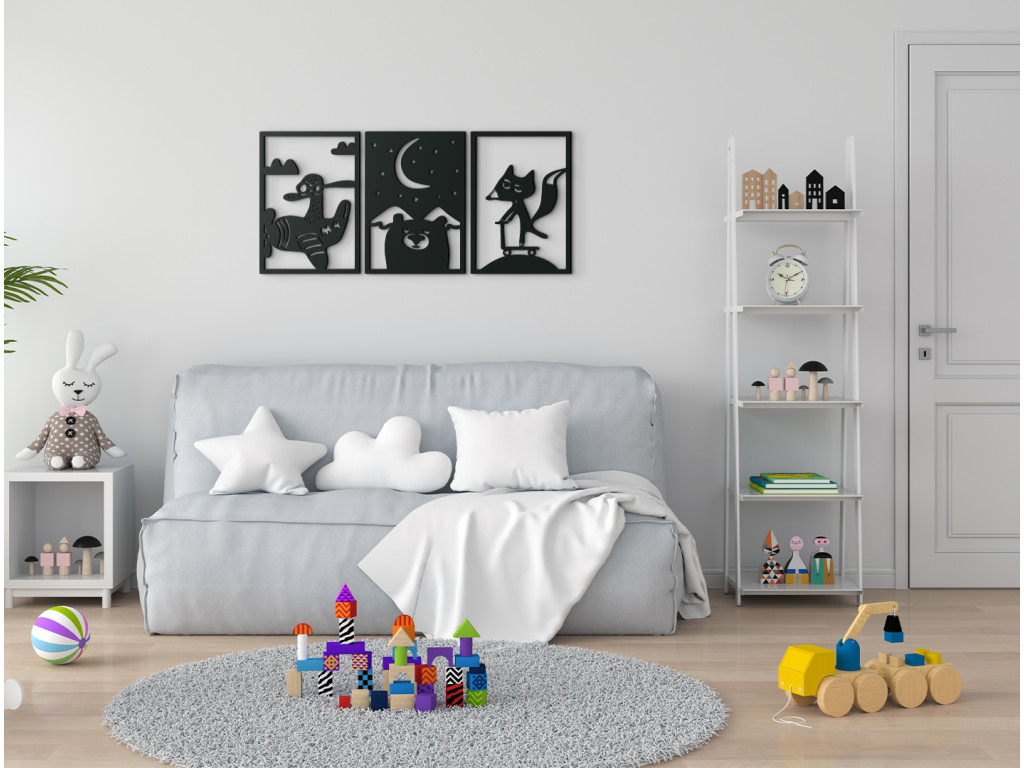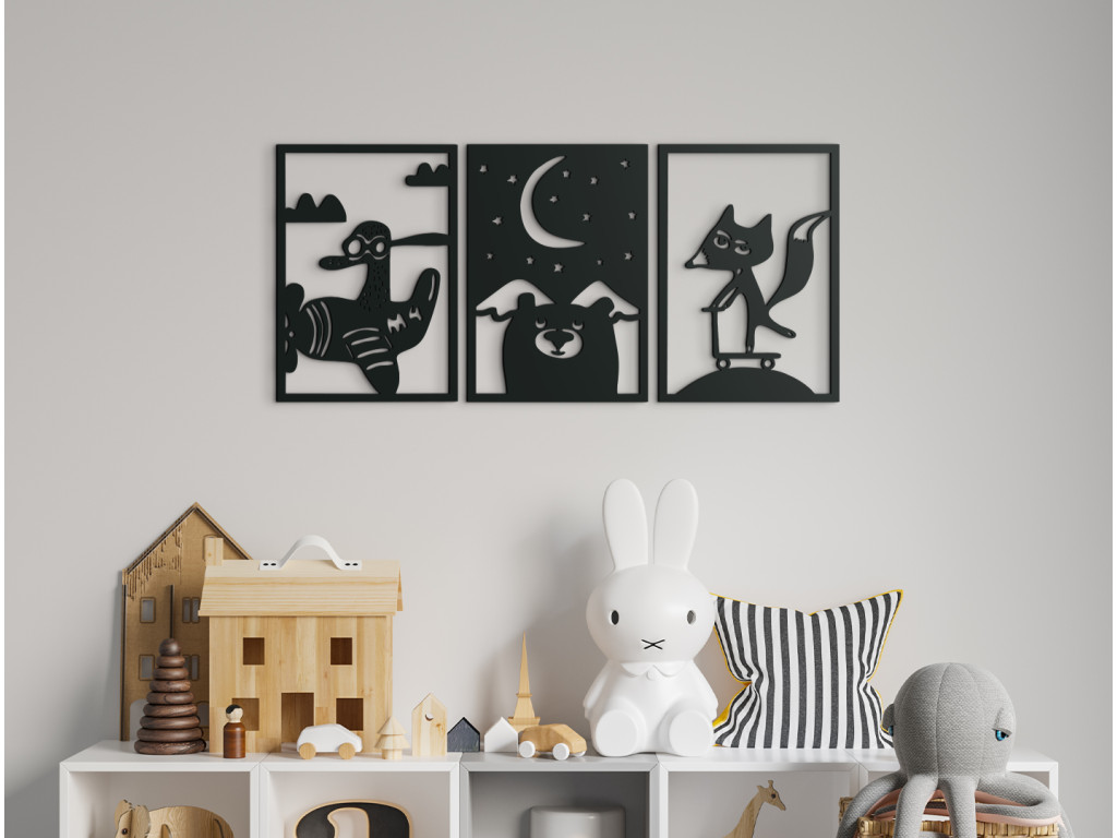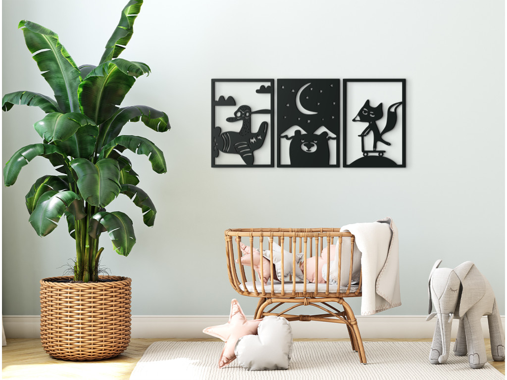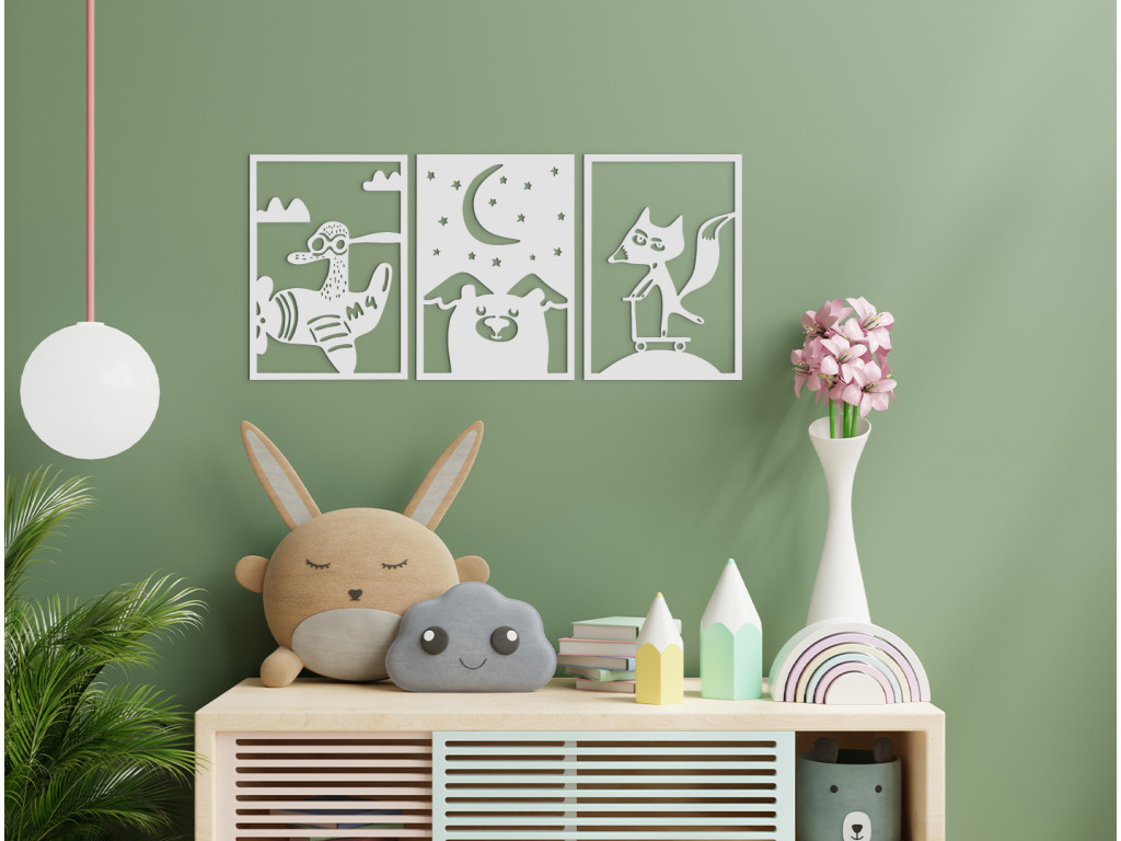 Nalepte si na stenu detskej izby 3-dielnu drevenú nálepku s originálnym motívom. Prvý z trojice obrázkov znázorňuje lietadielko, ktoré pilotuje káčer, druhý obrázok ponúka pohľad na hornatú nočnú krajinu s medveďou hlavou v popredí a na treťom obraze sa na kopčeku kolobežkuje lišiak s vejúcim chvostom.