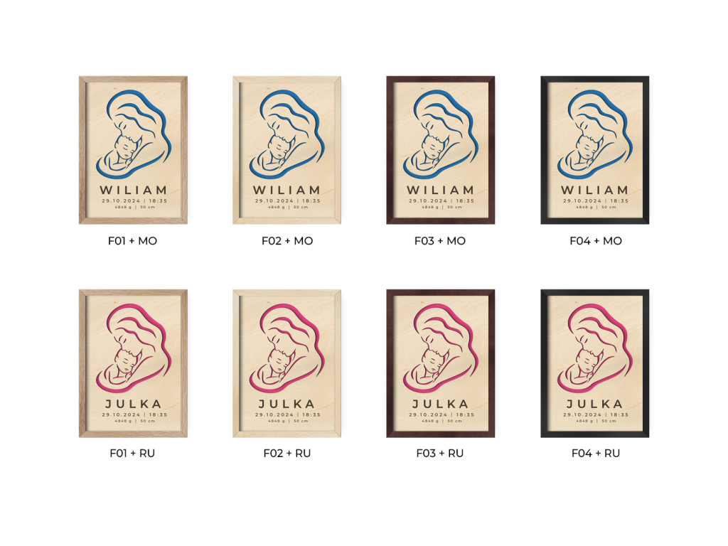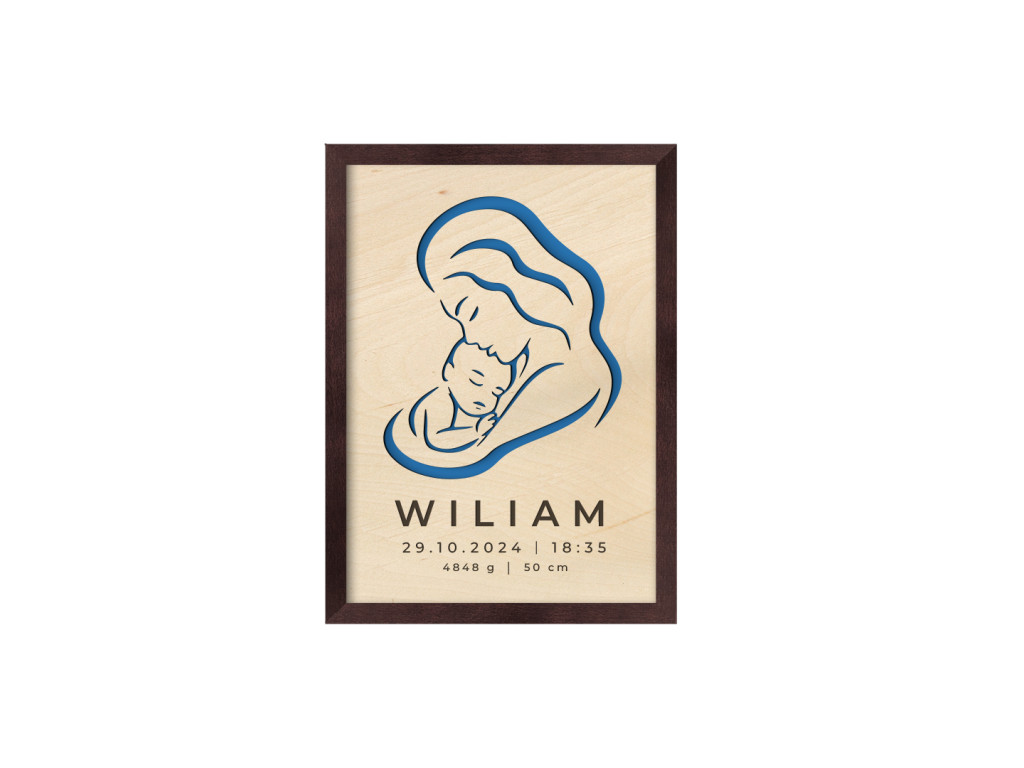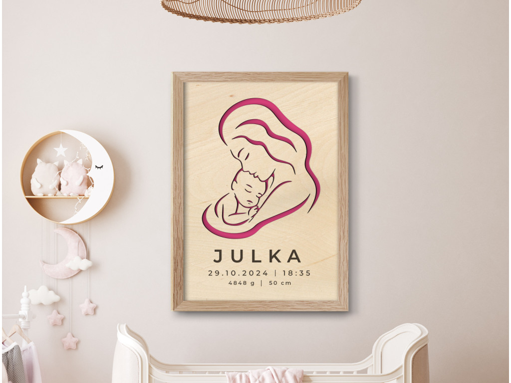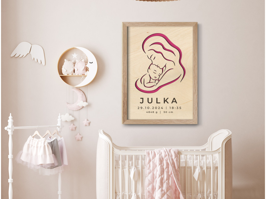 Nous encadrerons l'un des plus beaux moments de votre vie dans une jolie décoration en bois, accompagnée des informations gravées concernant votre bébé. Le nom, la date et l'heure de naissance, la taille et le poids ne seront ainsi plus seulement consignés dans le carnet de santé ou dans la mémoire des parents fiers. Vous pourrez les exposer fièrement chez vous et constituer progressivement une collection de toute votre famille qui s'agrandit. De plus, chaque image sera adaptée à vos goûts en termes de couleurs.