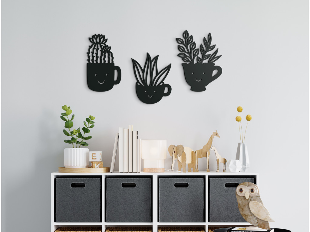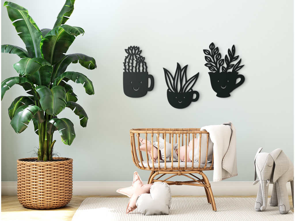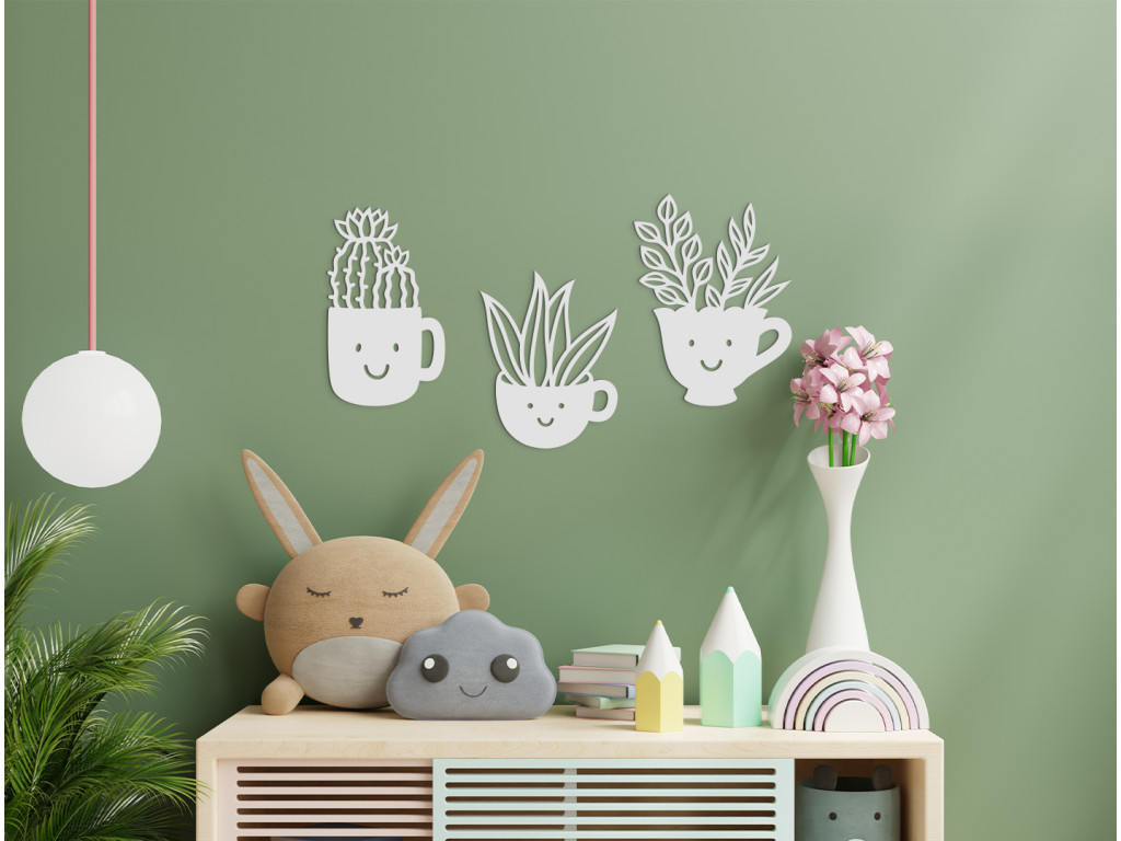 Detská nálepka na stenu s motívom izbových kvetov vysadených v usmievavých šáločkách pôsobí milo a veselo. Drevená dekorácia sa skladá z trojice šálok rôznych tvarov, z ktorých vyrastajú kaktusy a ďalšie rastliny.