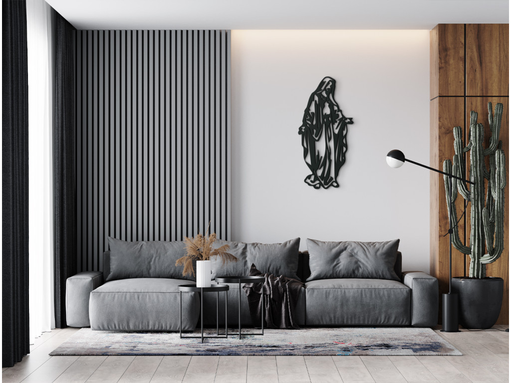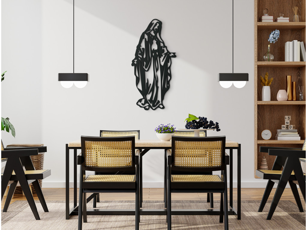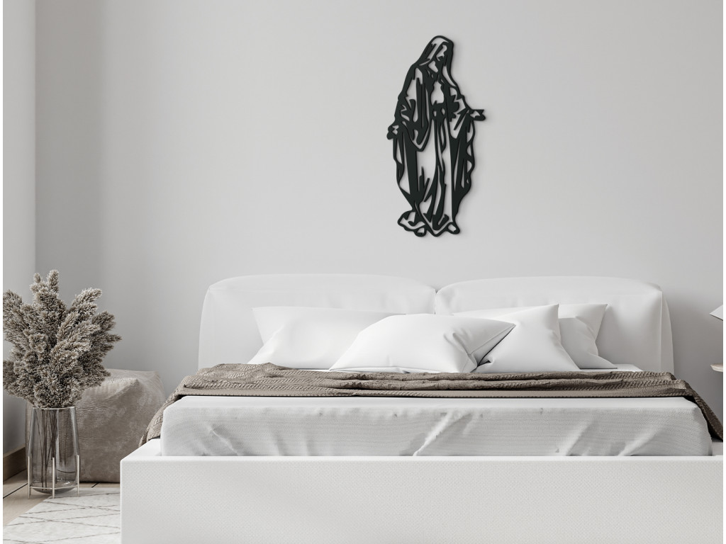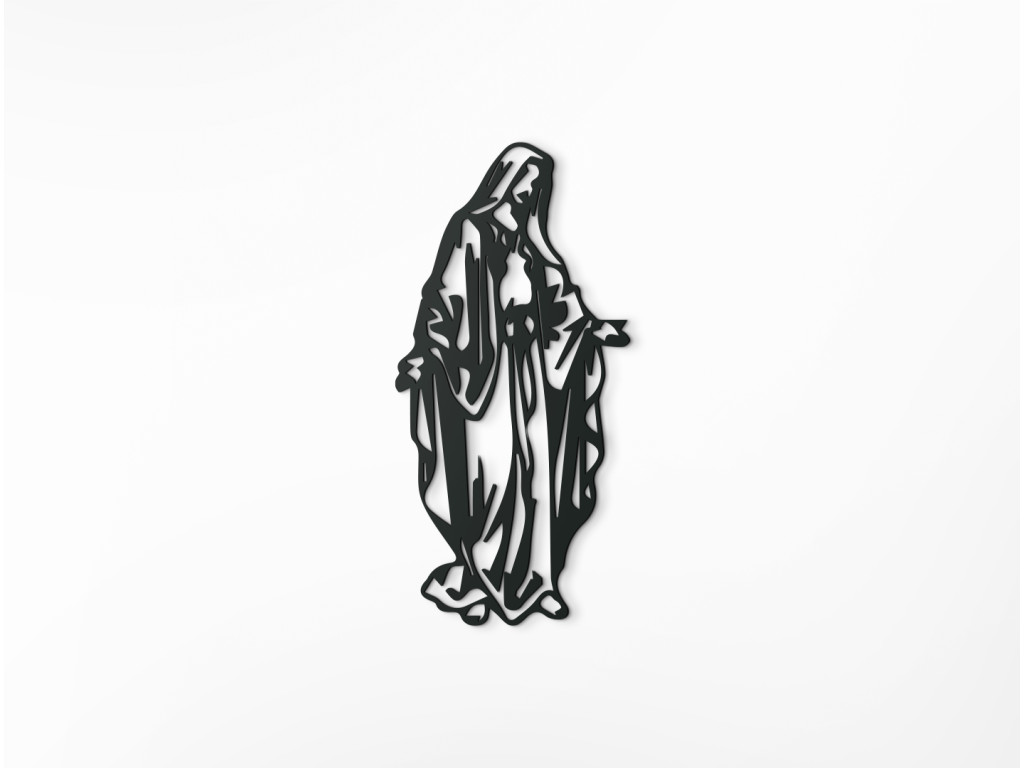 Moderný obraz Panny Márie vyčarí úsmev každej návšteve. Jemné črty a minimalistický dizajn vnesie do interiéru pokoj a príjemnú atmosféru. Panna Mária vyniká zaujímavými detailmi ako absentujúca tvár či roztvorené ruky. Dekorácia sa hodí sa najmä do moderných priestorov.