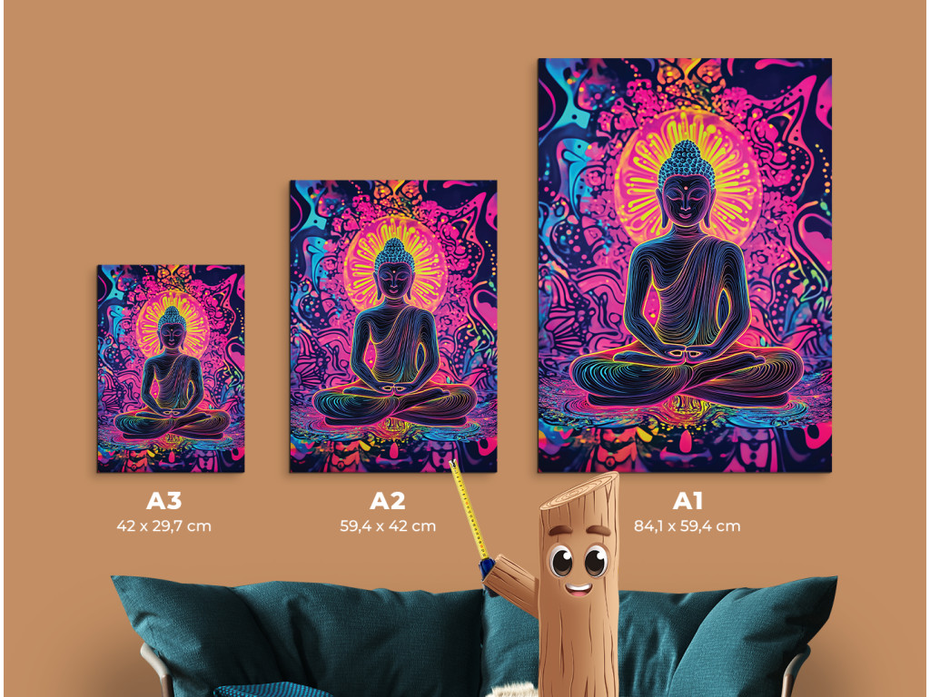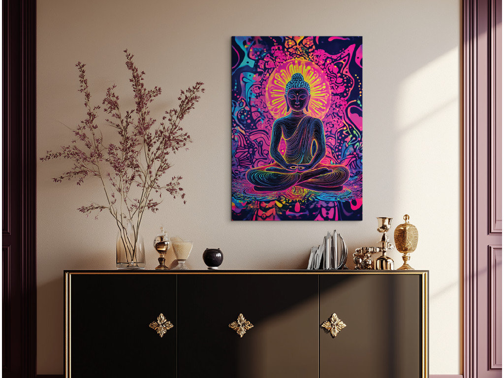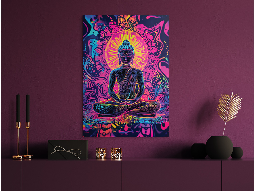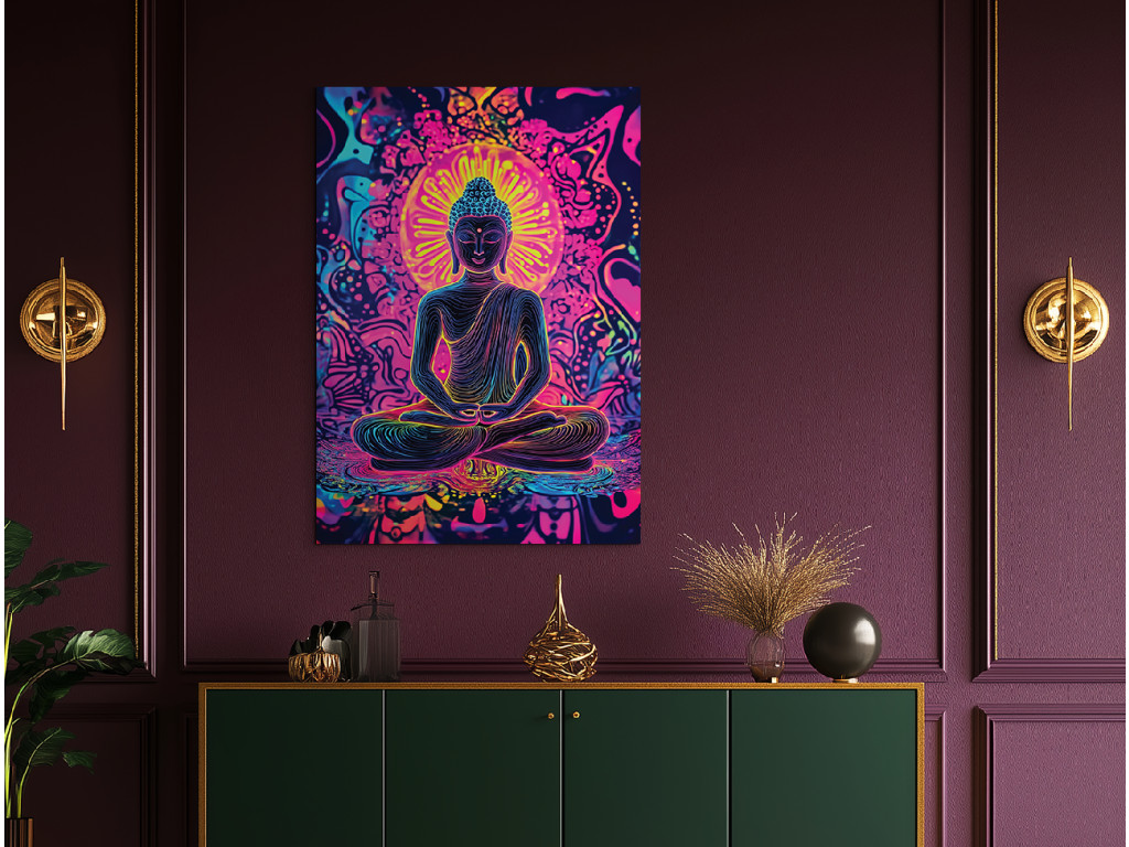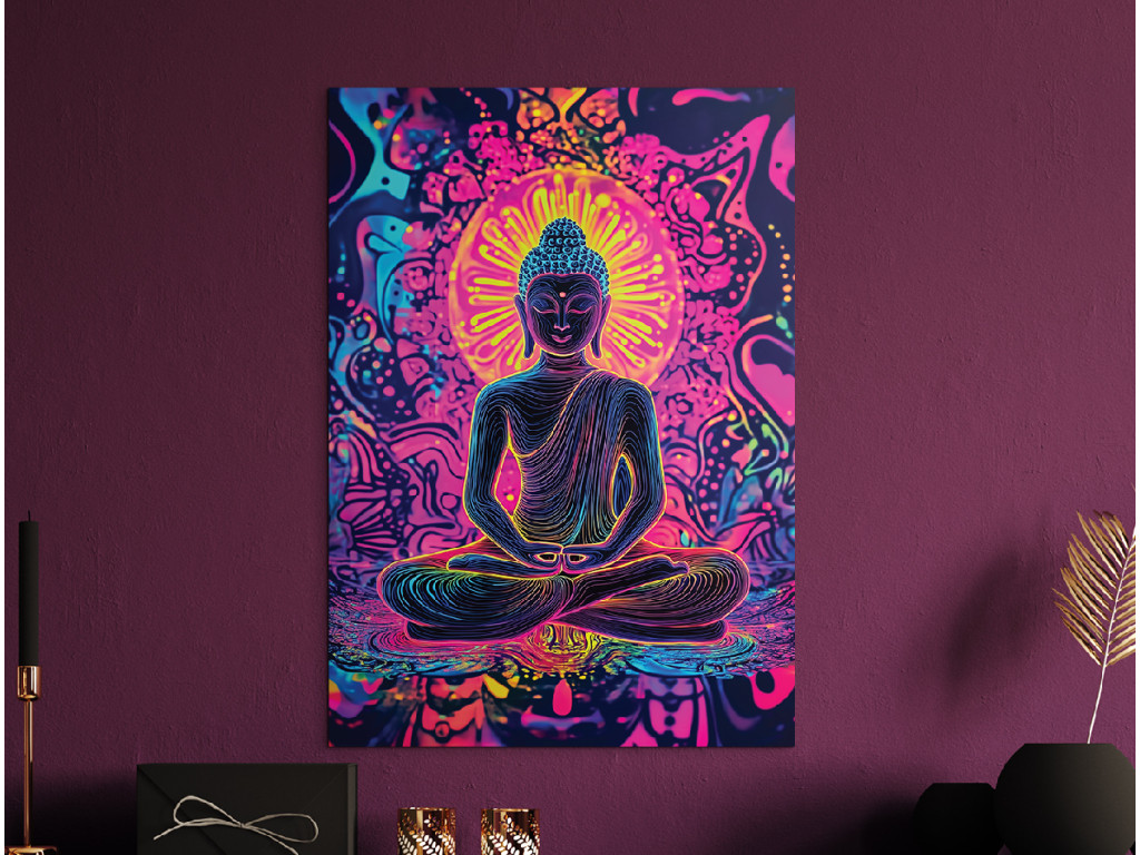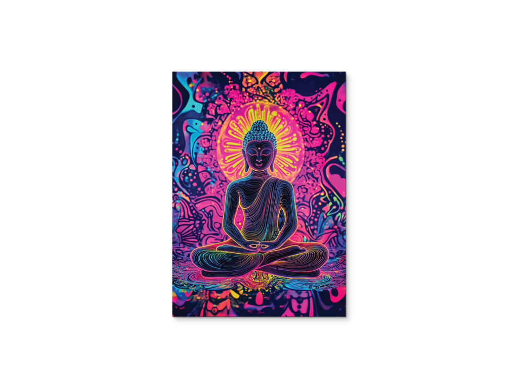 Le tableau représente Bouddha en position de méditation, entouré de couleurs vives et de mandalas. Les tons néon rose, bleu et jaune créent une forte impression spirituelle et visuelle. Complément idéal pour un espace de détente, de méditation ou de yoga.