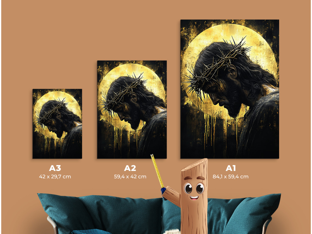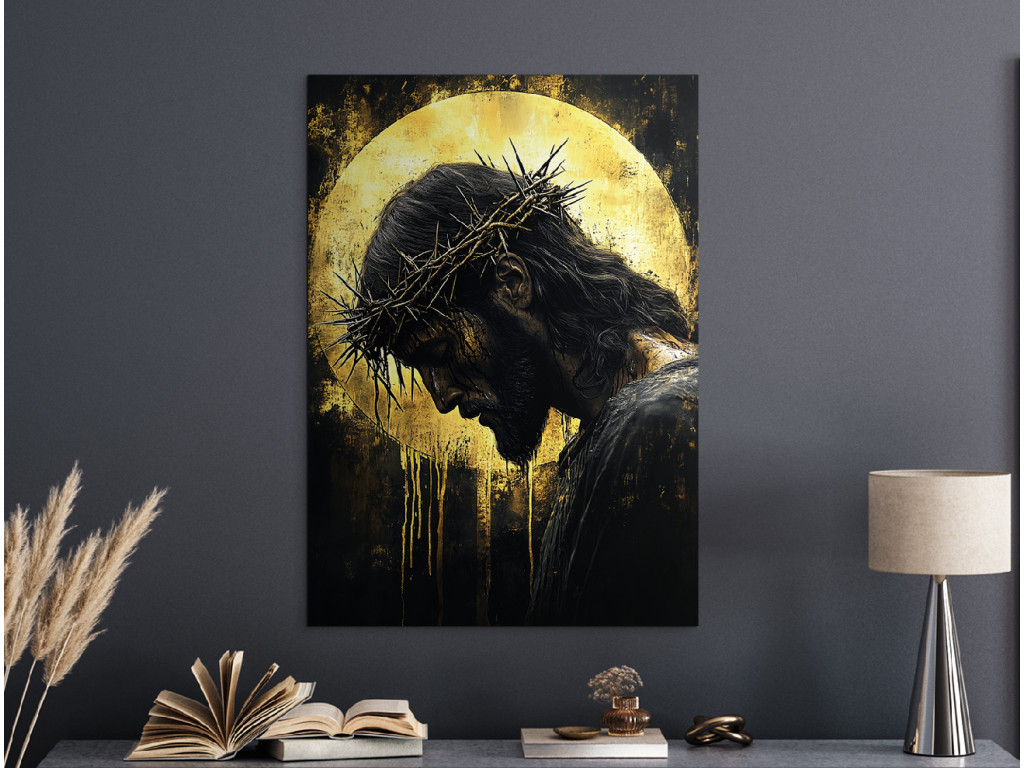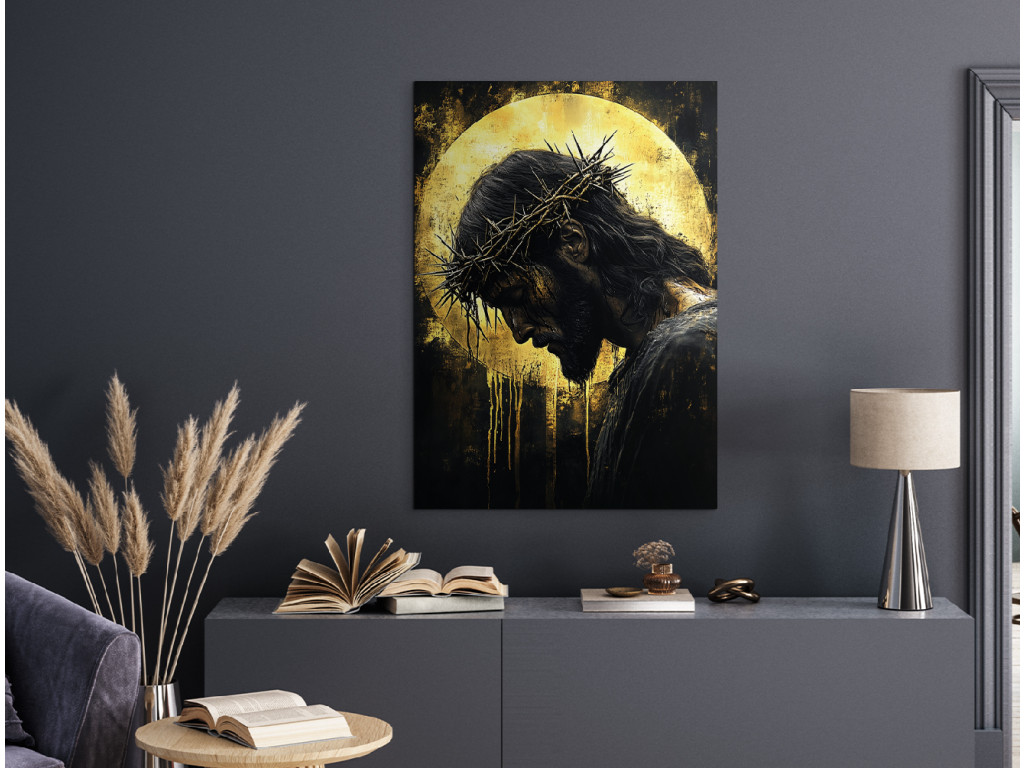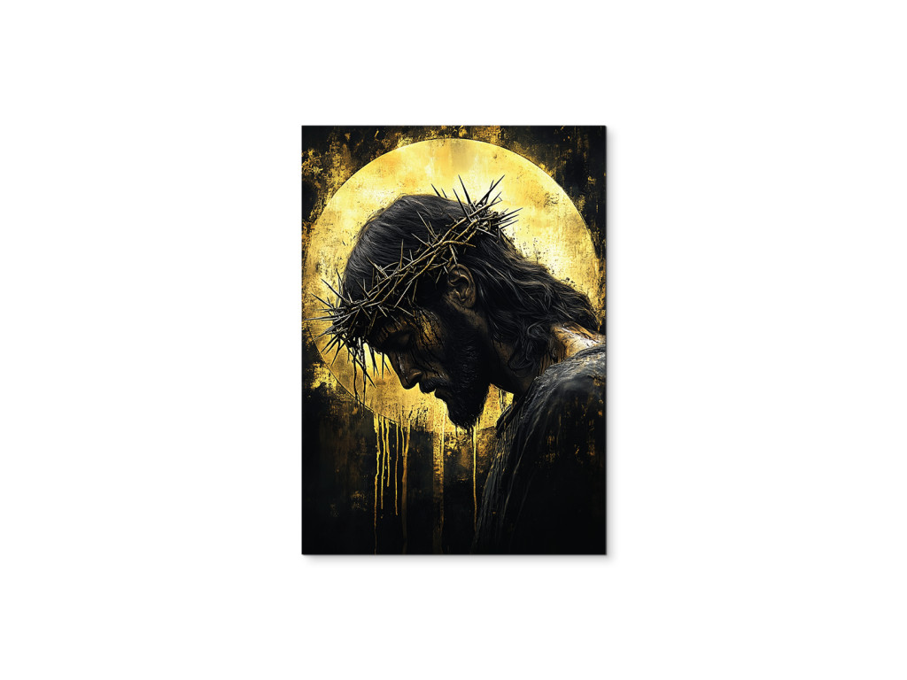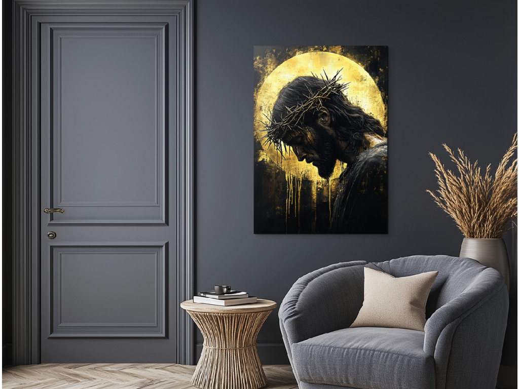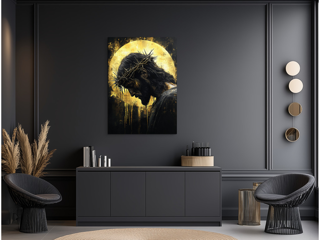 Le tableau représente Jésus-Christ, la tête inclinée, couronné d'une couronne d'épines, dans une pose silencieuse et humble. Le fond sombre dans des tons noirs et dorés met en valeur son auréole, qui brille et crée une atmosphère de profonde contemplation spirituelle. Le tableau allie un design moderne à une symbolique spirituelle, idéal pour un intérieur avec un message de foi fort.
