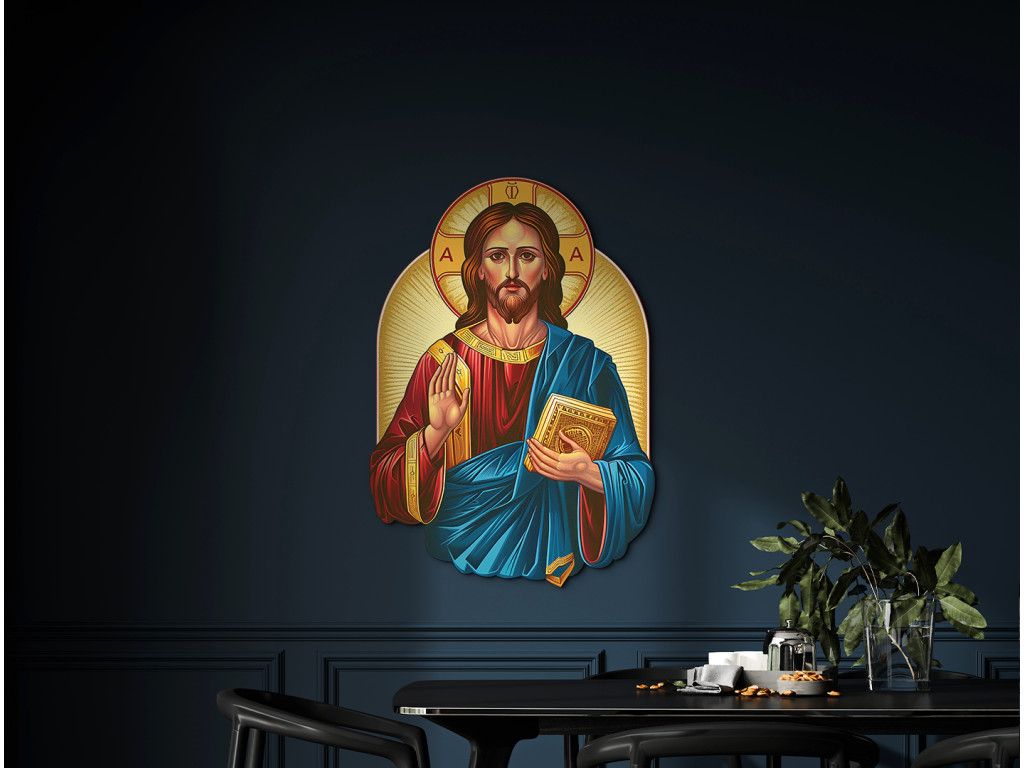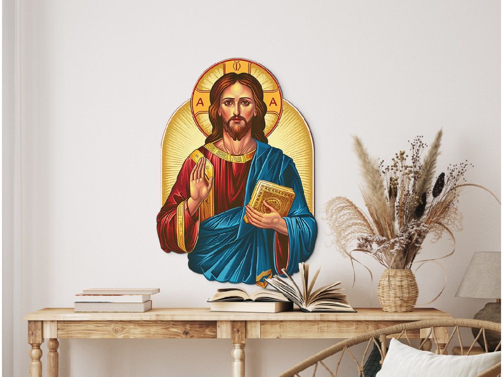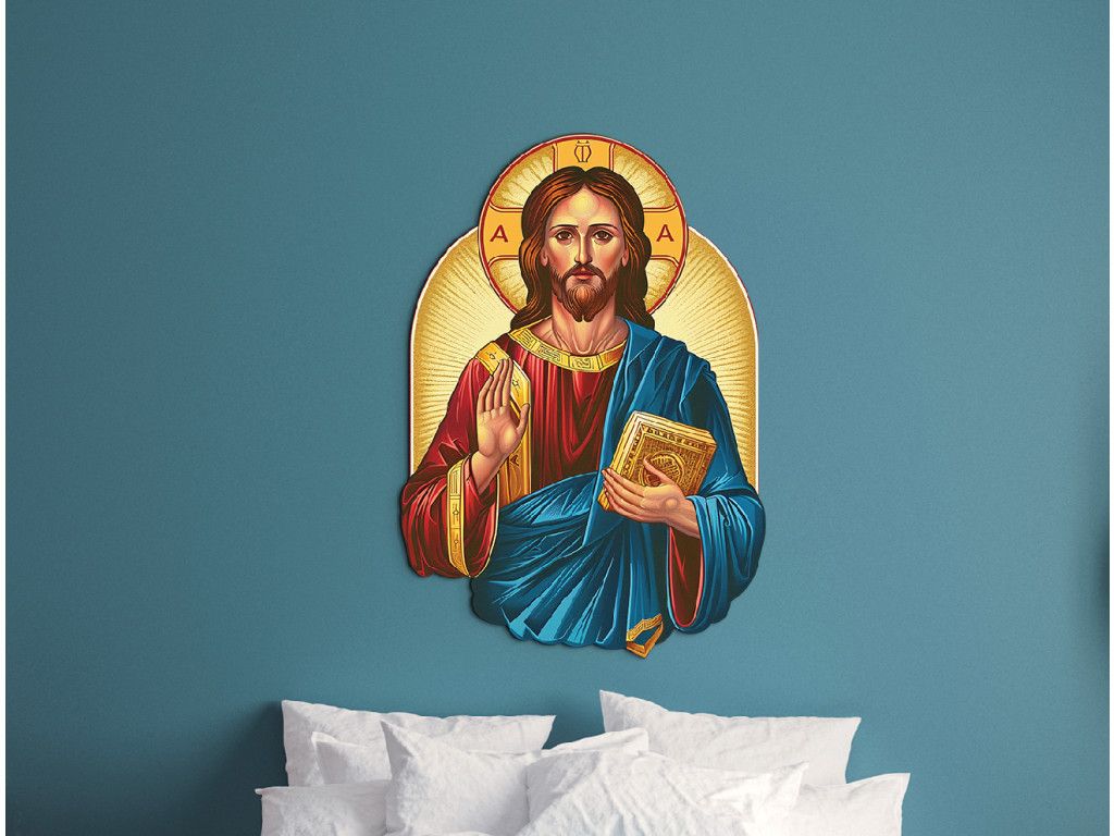 Le tableau représente Jésus-Christ dans un style iconique, caractéristique de la tradition sacrée chrétienne. Le visage du Christ est représenté avec sérénité et dignité, souvent avec une auréole et des symboles qui expriment sa nature divine et sa mission. Le style iconographique souligne l'intemporalité et la profondeur spirituelle – comme expression visuelle de la foi, de l'espoir et de la présence de Dieu.