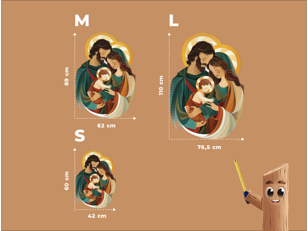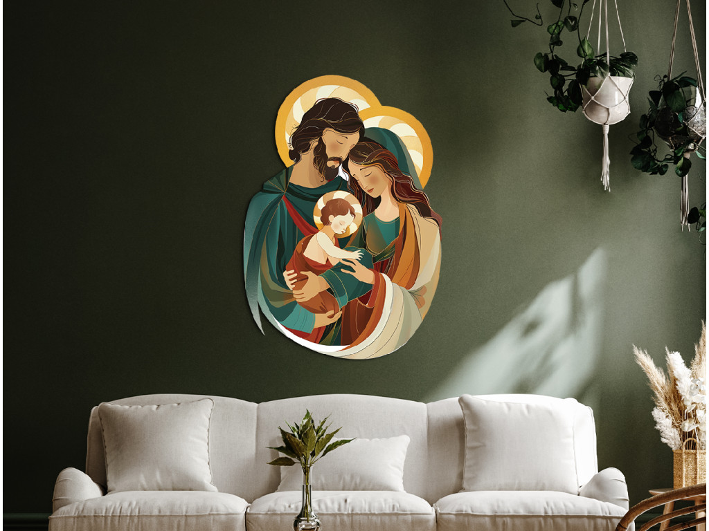 Le tableau représente une version moderne et stylisée de la Sainte Famille – la Vierge Marie, Saint Joseph et l'Enfant Jésus – dans une étreinte tendre et harmonieuse. Joseph enlace Marie avec Jésus dans ses bras, ce qui confère au tableau une atmosphère chaleureuse, paisible et unifiée. Les couleurs douces et les formes simplifiées font de cette scène un motif aimable et apaisant, qui convient également à une chambre d'enfant ou à un espace familial.