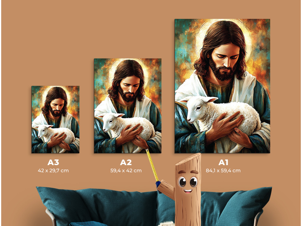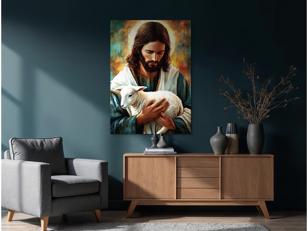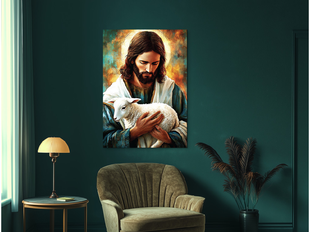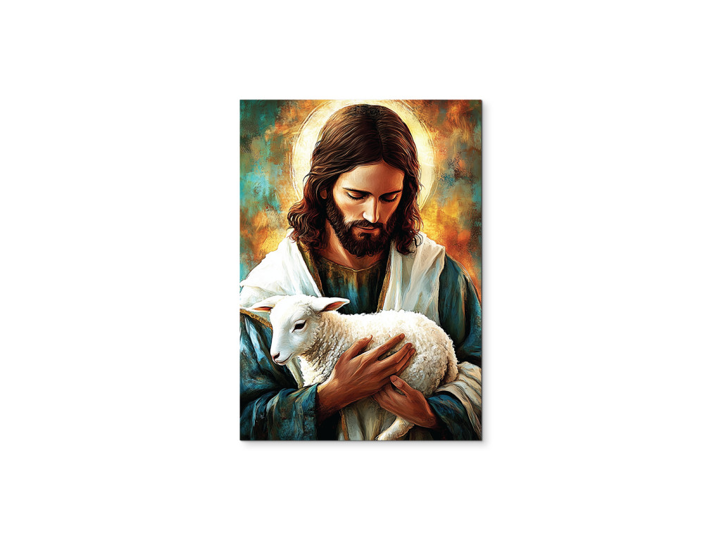 Le tableau représente Jésus-Christ en tant que bon berger, tenant tendrement un agneau dans ses bras. Son regard bienveillant et son visage serein rayonnent de compassion et de protection. Les couleurs claires et chaudes soulignent le message de sollicitude, de guidance et de présence divine à chaque instant de la vie.