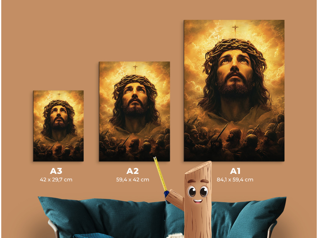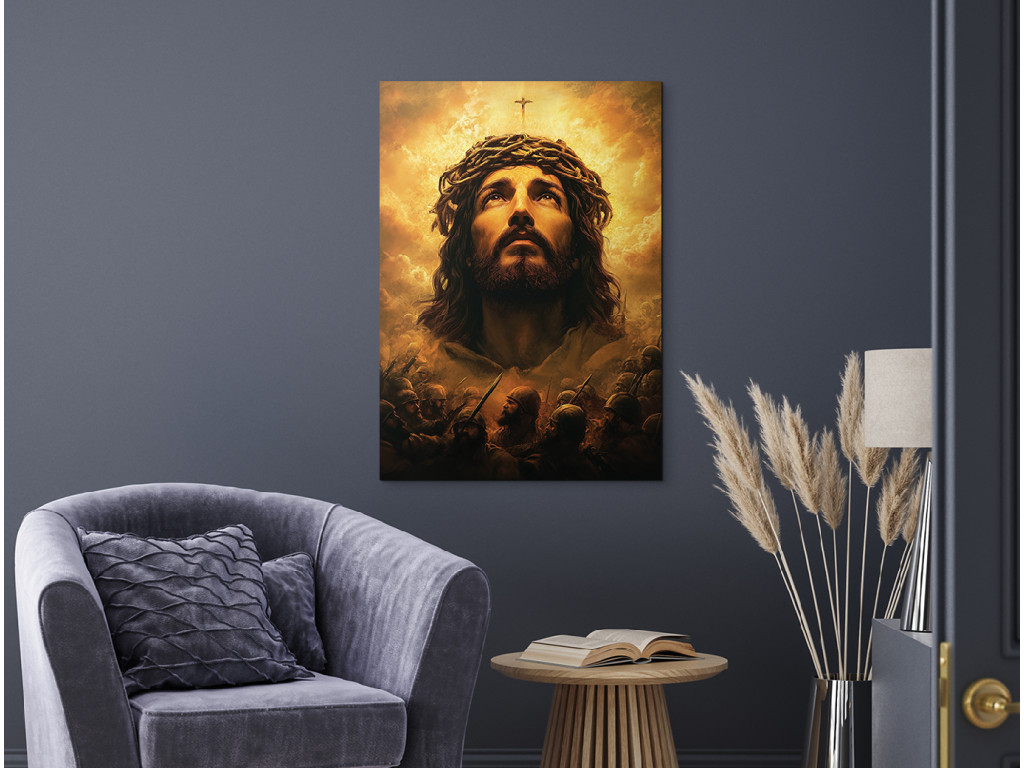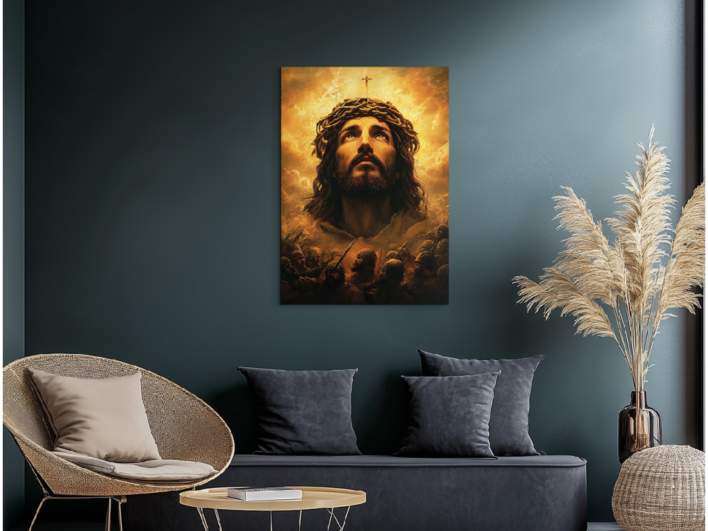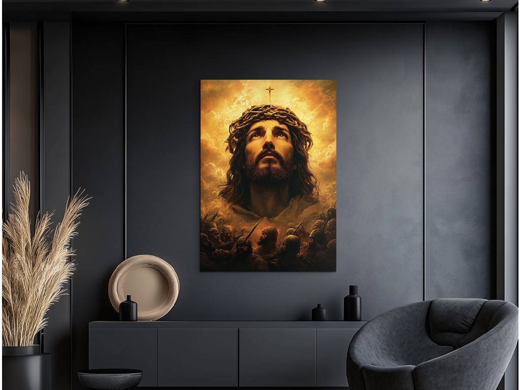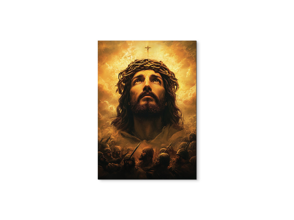 Le tableau représente Jésus-Christ avec une couronne d'épines, regardant vers le ciel avec humilité et résignation. Son regard est empreint de douleur intérieure, mais aussi d'espoir et de supplication envers le Père. L'expression de son visage, la lumière venant d'en haut et les couleurs atténuées soulignent la force spirituelle et le moment intime de communion avec Dieu.
