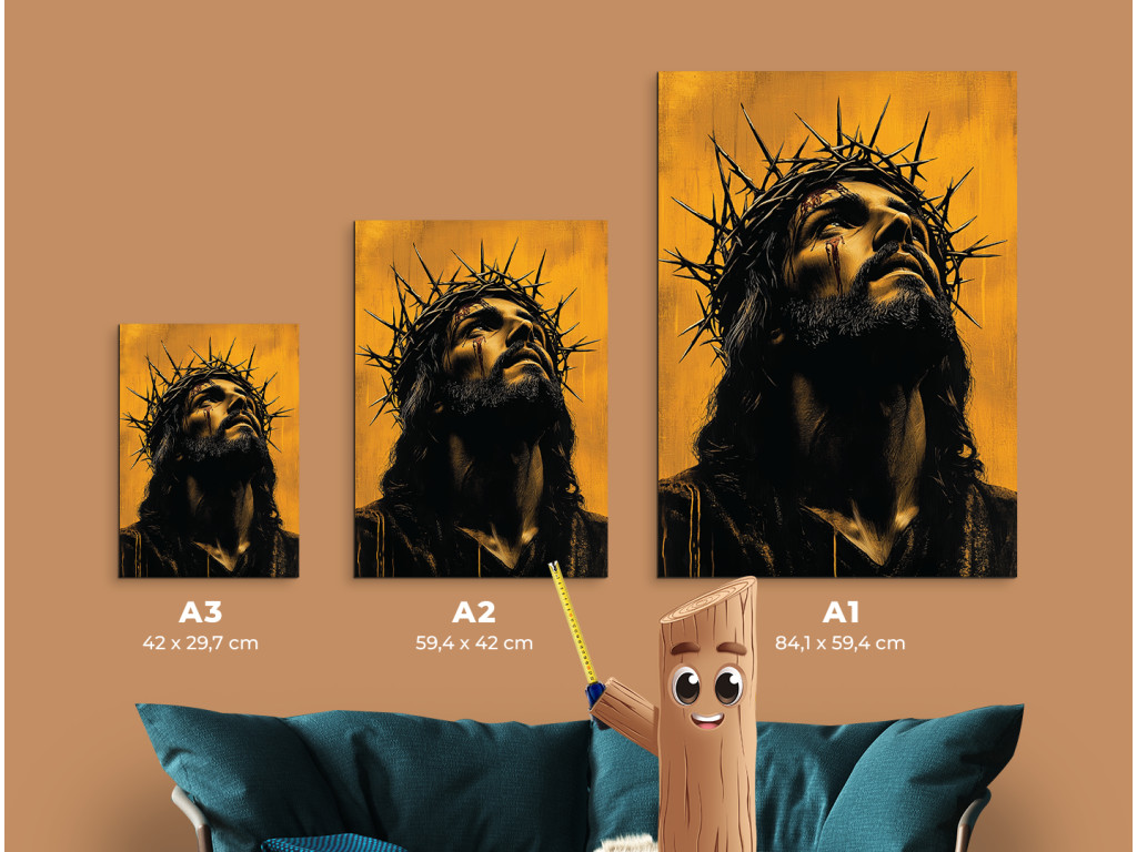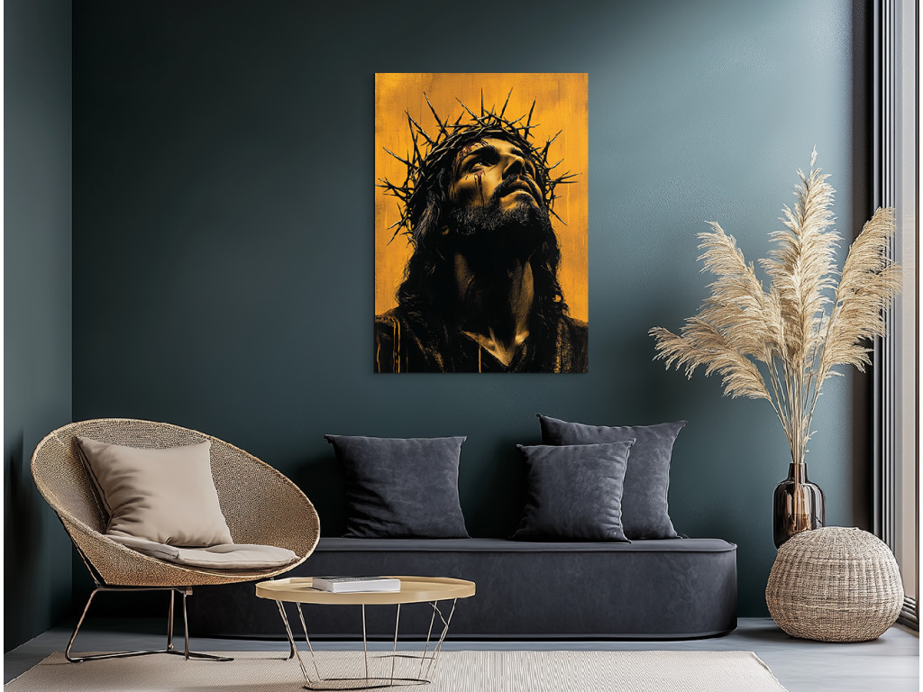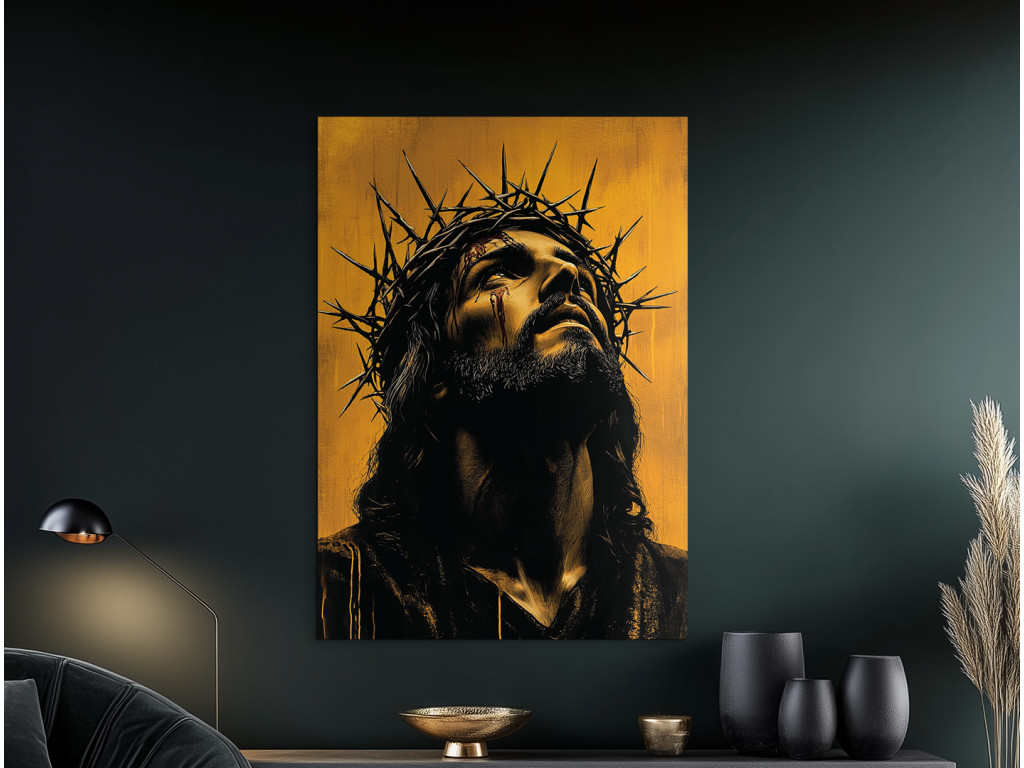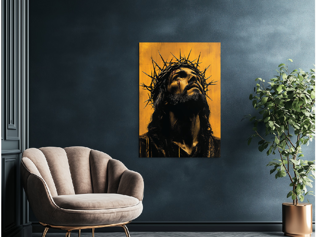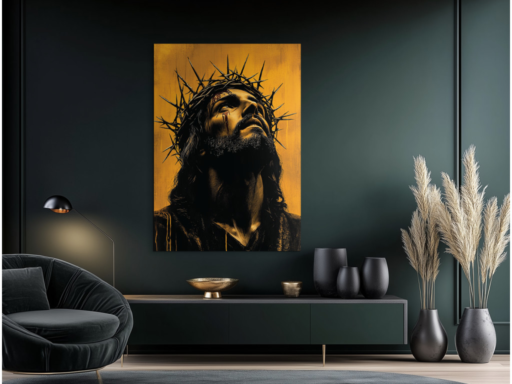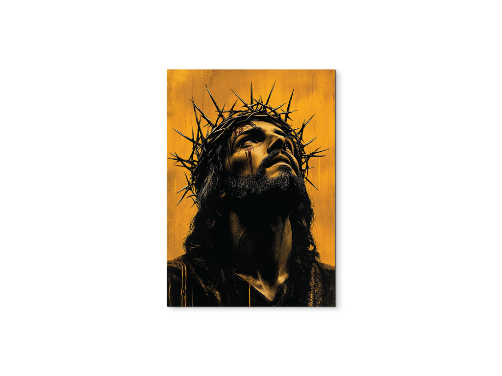 Cette œuvre fortement émotionnelle représente le visage de Jésus-Christ avec une couronne d'épines, qui exprime à la fois une souffrance silencieuse et une paix profonde. Son regard est légèrement baissé, comme s'il portait tout le poids du monde, mais il exprime en même temps l'amour et le pardon. La palette de couleurs est atténuée, principalement dans des tons sombres, ce qui renforce la signification spirituelle et symbolique du tableau.