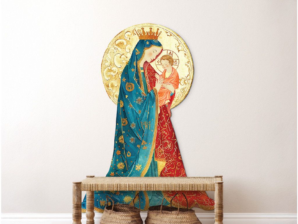 Marie est représentée comme une mère aimante qui protège son fils, tandis que l'enfant Jésus incarne l'arrivée du Sauveur dans le monde. Les auréoles dorées autour de leurs têtes soulignent leur sainteté et leur union spirituelle qui dépasse l'entendement humain. Cette scène incarne l'amour maternel, le dévouement et la foi.