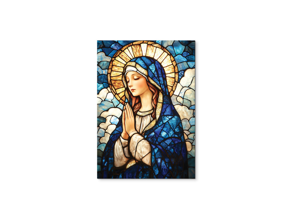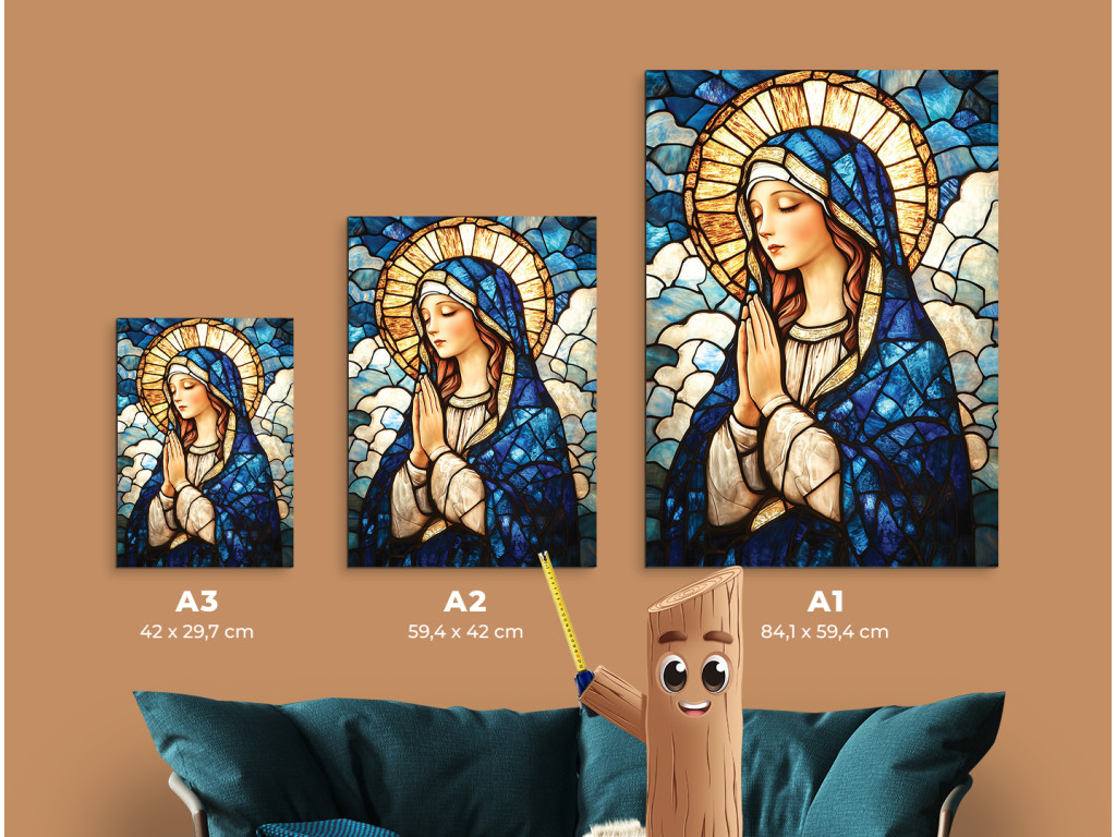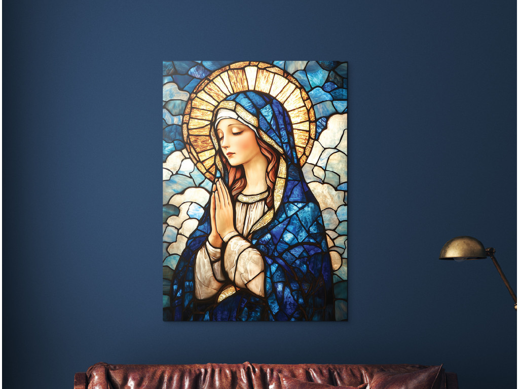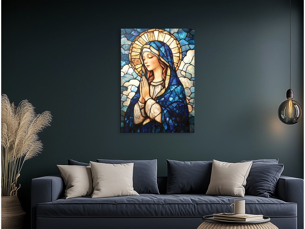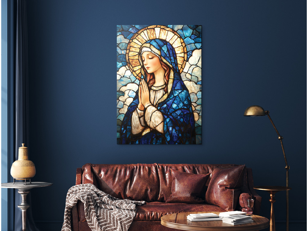 Le tableau représente la Vierge Marie dans son manteau bleu iconique avec une auréole dorée, dans un style mosaïque. Les détails créés à partir de fragments colorés instaurent une atmosphère sacrée et soulignent sa présence paisible et protectrice.