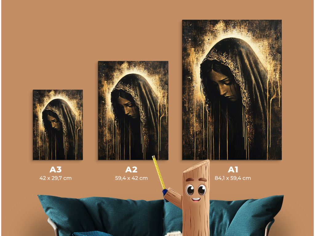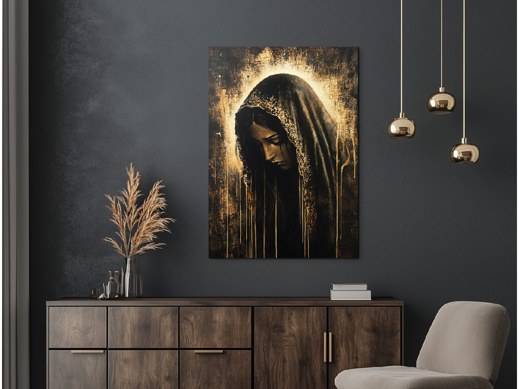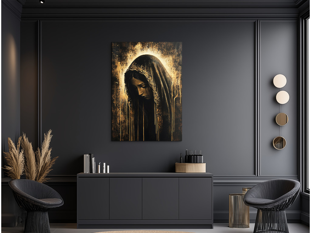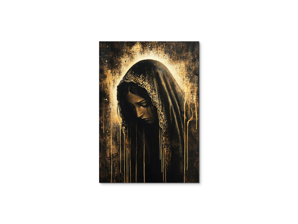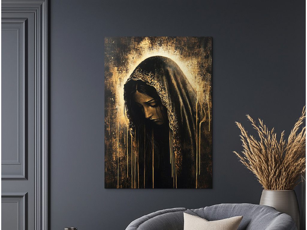 Le tableau représente la Vierge Marie en tant que mère de la douleur et de la compassion, enveloppée dans un manteau sombre, le regard baissé. Son visage exprime à la fois la paix et une profonde tristesse, comme si elle acceptait en silence les souffrances du monde.